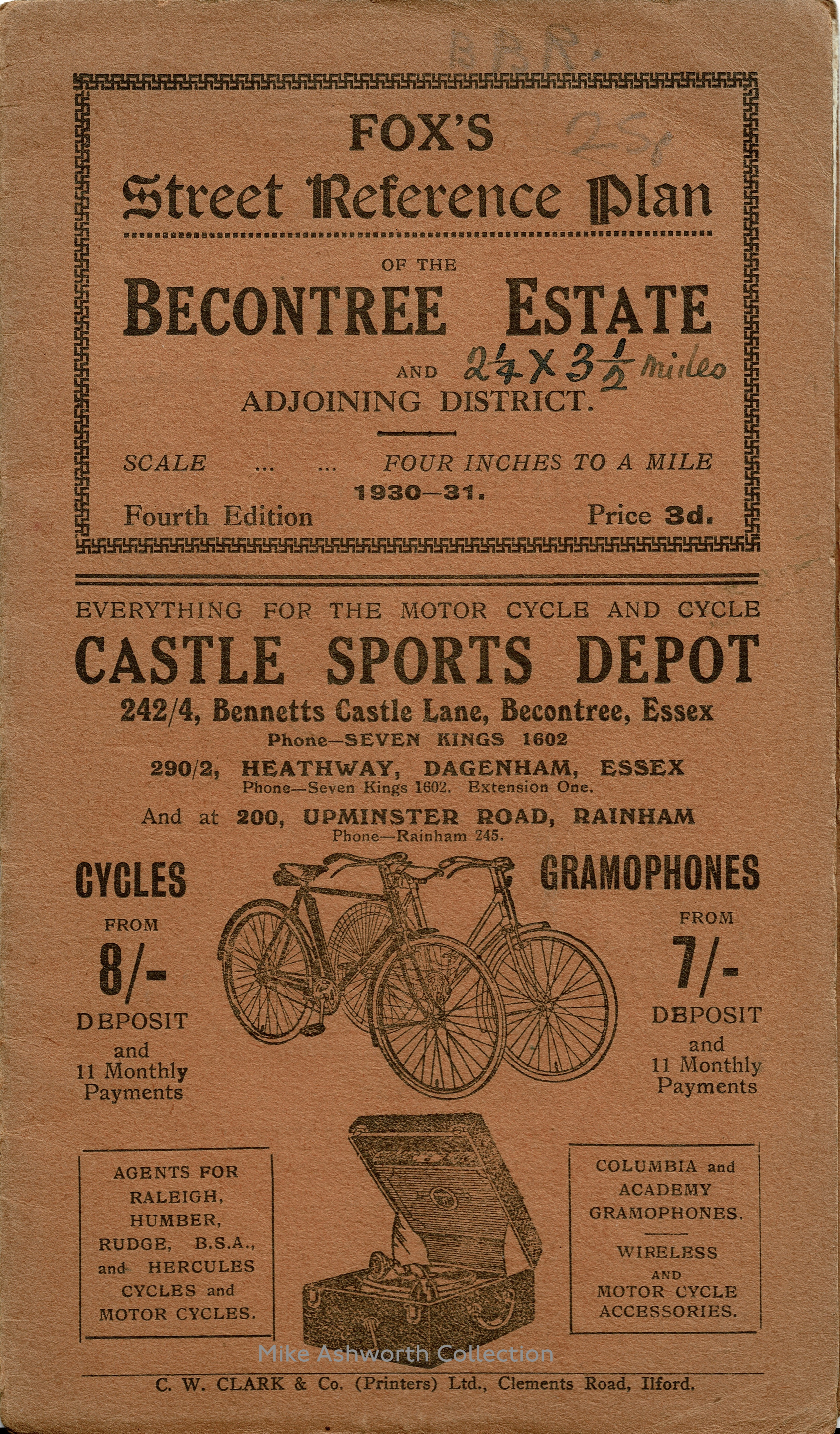 As is the case with these small plans, retailing at 3d., production costs would have been kept down by the sale of advertising on the map and cover. The front cover is for the Castle Sports Depot that dealt with two stalwards of 1930s consumerism – cycling and gramophones! The map itself has been annotated with what looks like church sites and what are possibly some sort of areas or zones of interest to the map’s owner – possibly areas for canvassing or leafleting?
