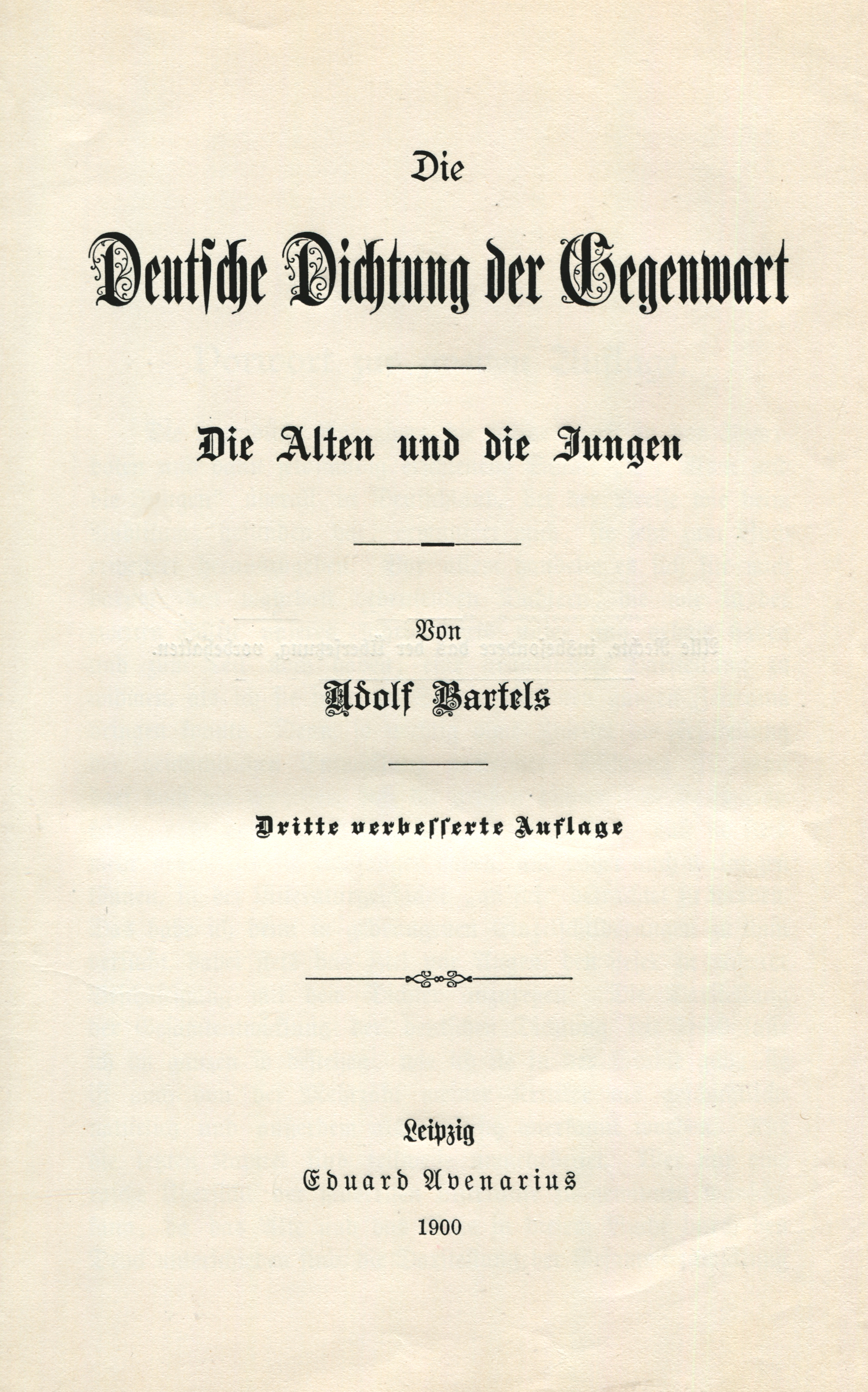 Die deutsche Dichtung der Gegenwart: Die Alten und die Jungen (“Contemporary German Poetry: The Old and the Young”) is a book first published in 1897. This is the “third, improved edition” published by Eduard Avenarius, Leipzig in 1900. It was written by Adolf Bartels (1862–1945), whose history of German literature –
