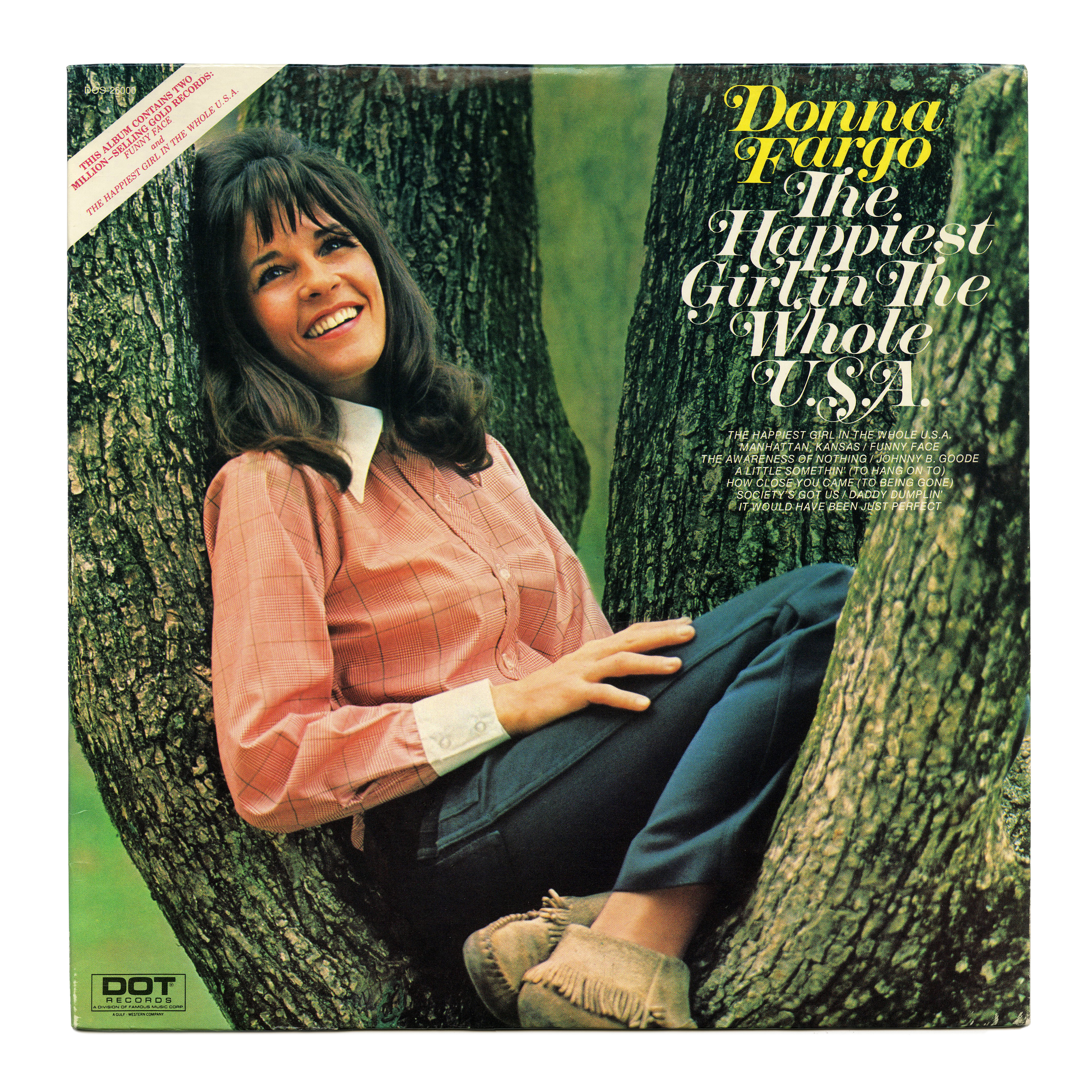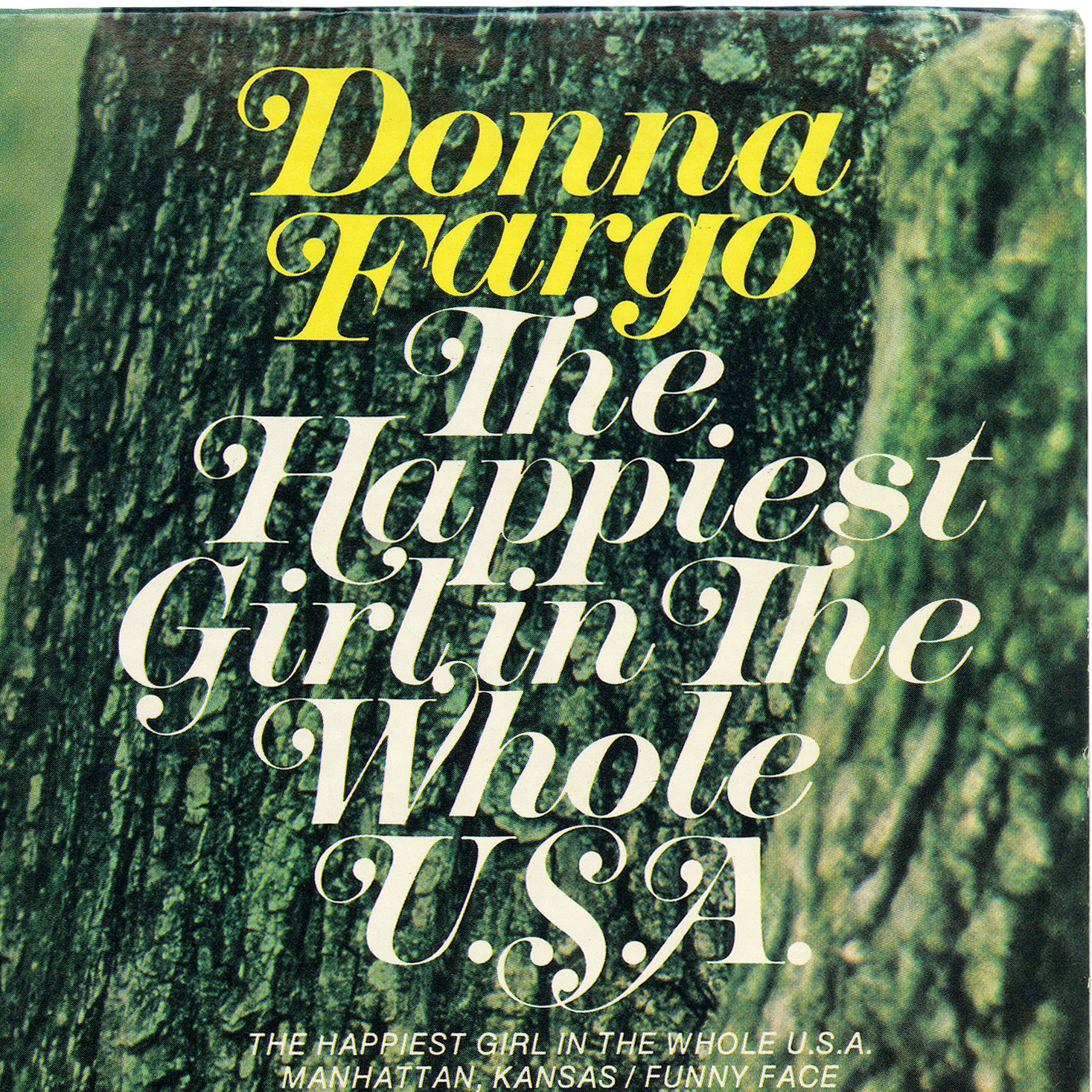 Cover for the debut album by Donna Fargo (b. 1945), released by Dot Records in 1972. The Happiest Girl in The Whole U.S.A. opens up with the song of the same name. Recorded by the Californian English teacher during a school break, it became a number one hit on the country charts, and reached number 11 on the Billboard Hot 100 pop chart. The album also contains her follow-up single “Funny Face”, which became an even bigger hit.
