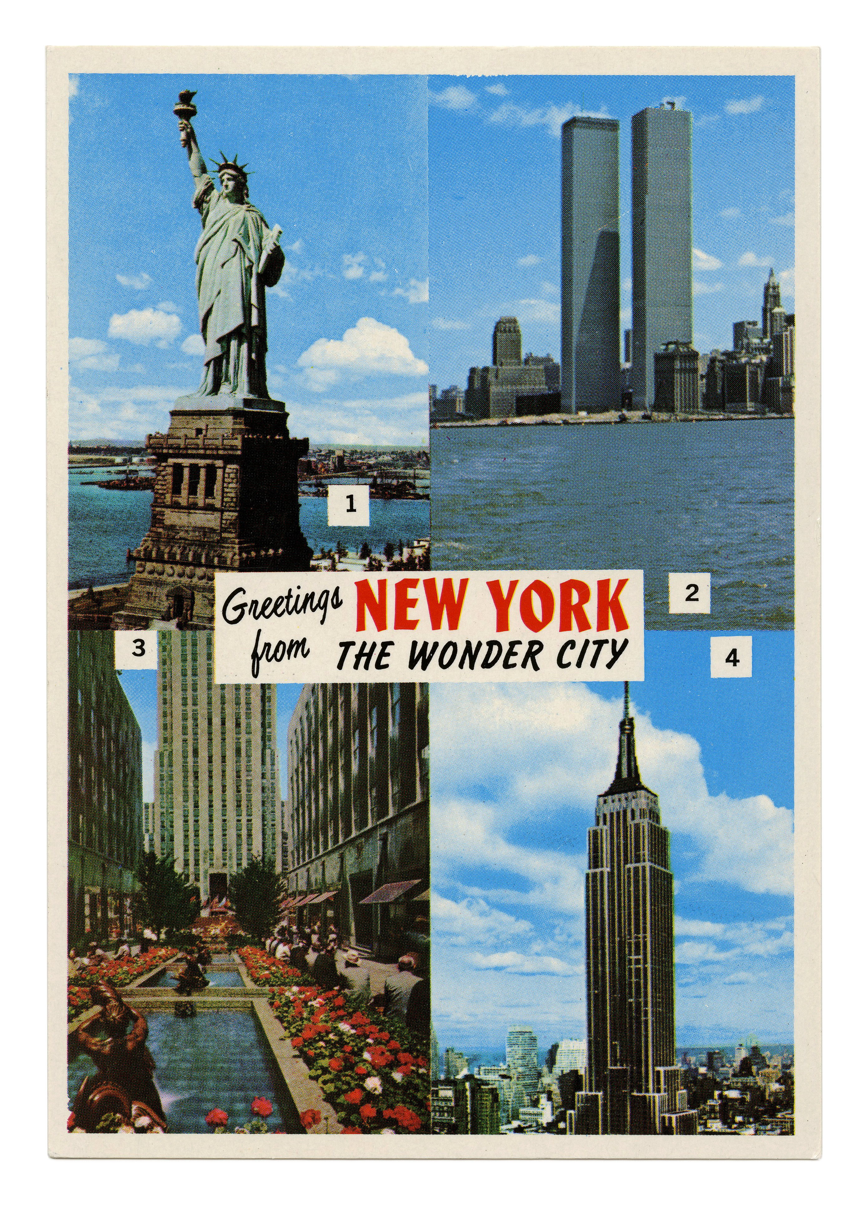 Undated postcard (late 1970s?) with four of New York’s most famous landmarks; the Statue of Liberty, the World Trade Center, the Rockefeller Center, and the Empire State Building. “New York” is set in red caps from Valiant. It’s paired with all-caps Flash Light, like Valiant a design by Edwin W. Shaar, and Repro Script by Jerry Mullen.