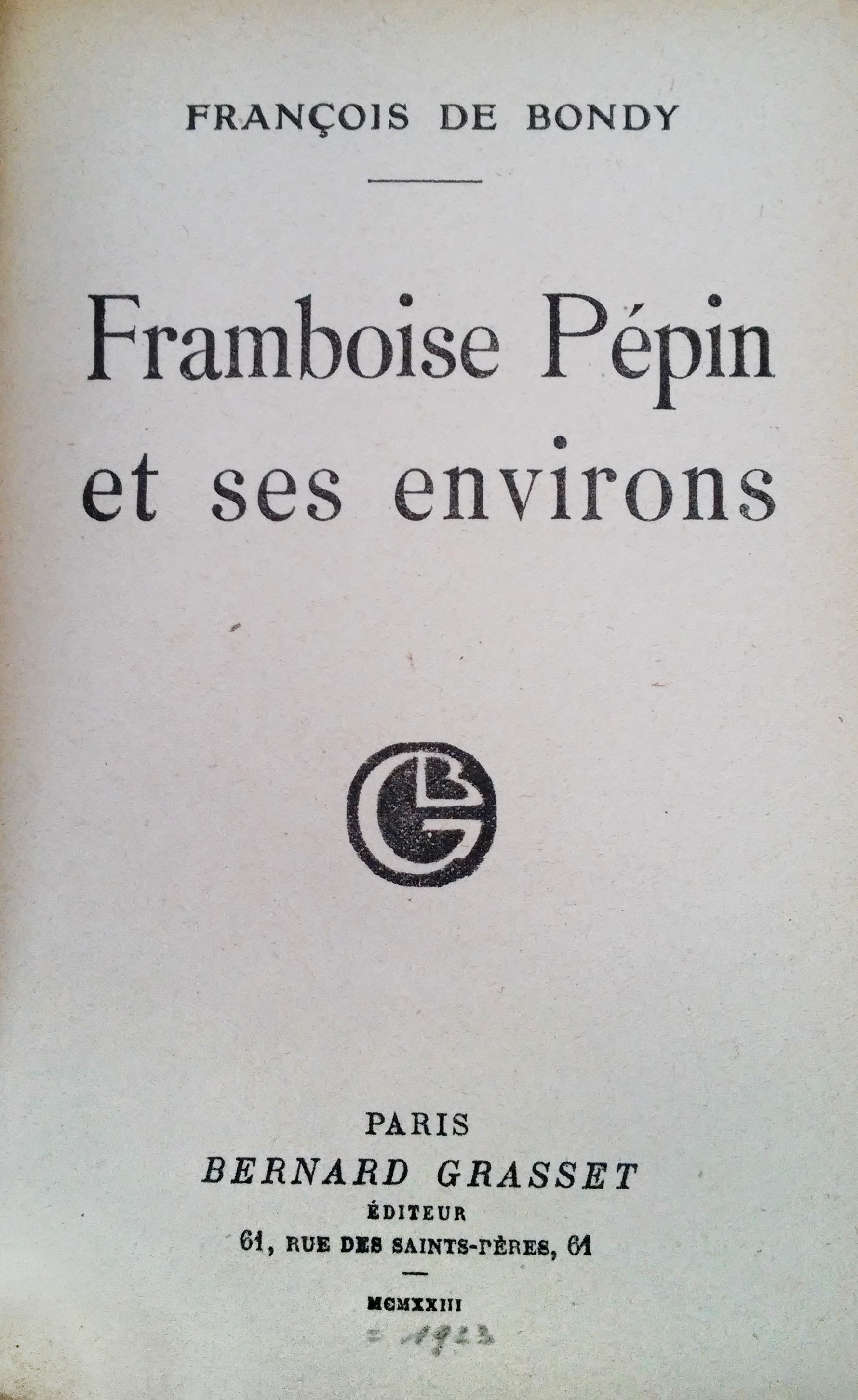 Here is the title page of Framboise Pépin et ses environs by François de Bondy (1875–19?), published in 1923. It’s a book on life in France at the beginning of the 20th century.
