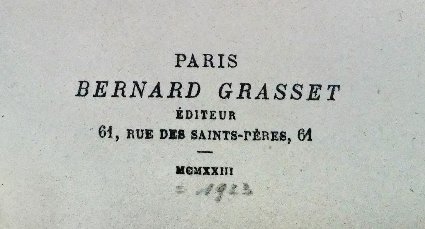 I don’t even recall where I took this photograph, but it must have been a second-hand book store in Canada. I didn’t take a photograph of the book cover, which must not have interested me very much. But that typeface on the title page—as well as that ‘GB’ monogram of the publisher, Bernard Grasset (1881–1955)—intrigued me.