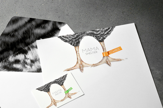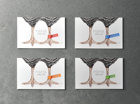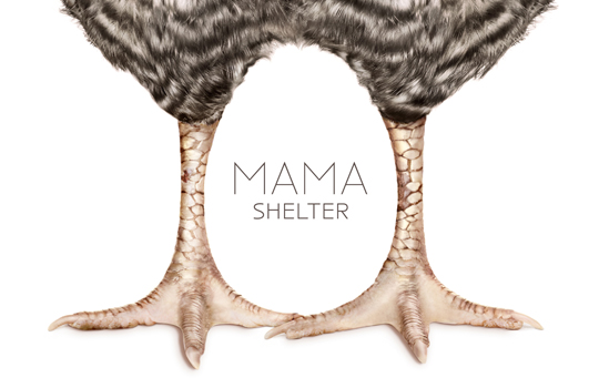 The result is a logo that is bold and unconventional, warm and cozy and plays off the name “Mama”. A chicken sits over the name, the negative space between its legs making the shape of an egg. Meanwhile, the hotel locations are differentiated by adding “leg tags” to the logo.