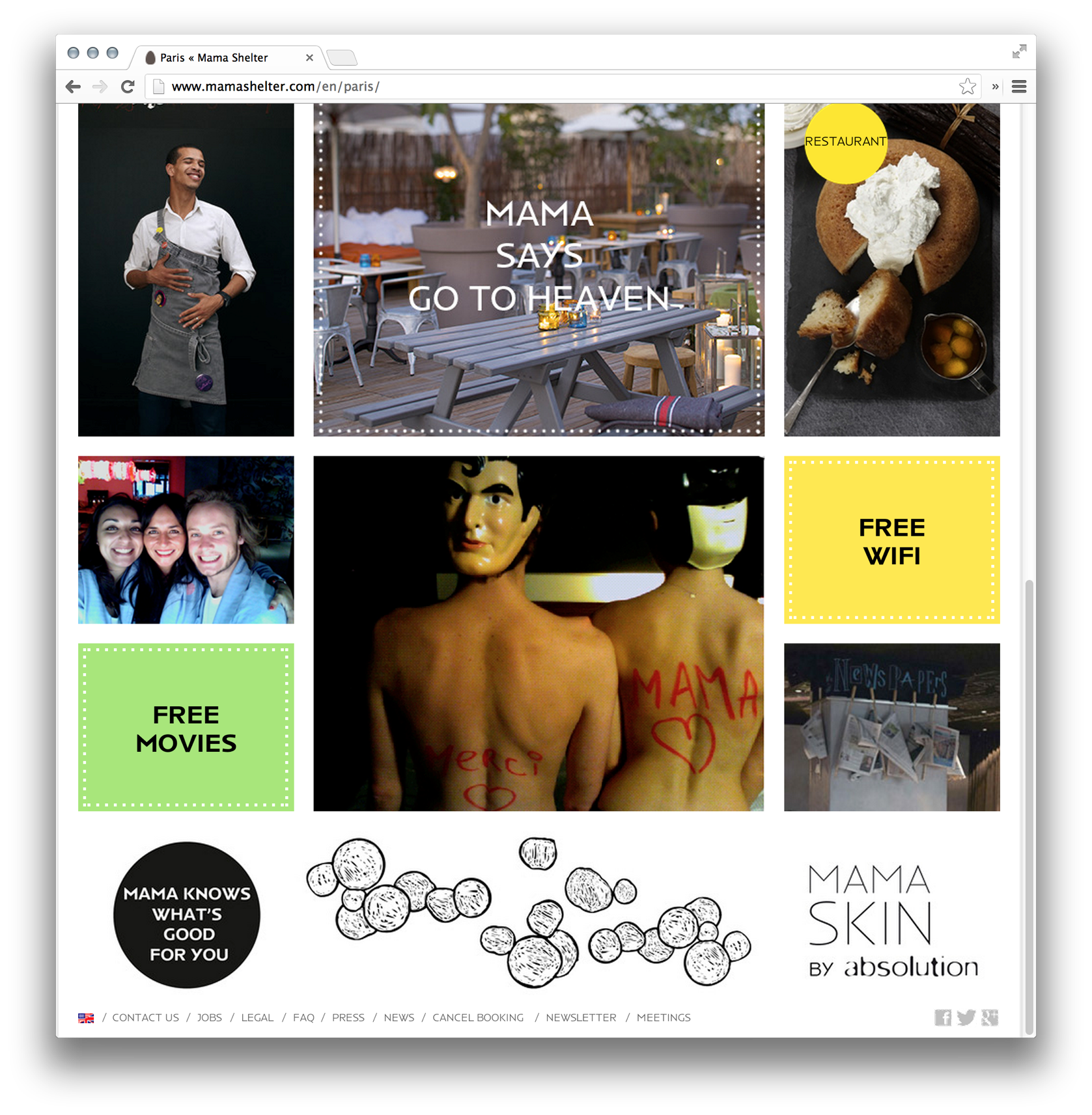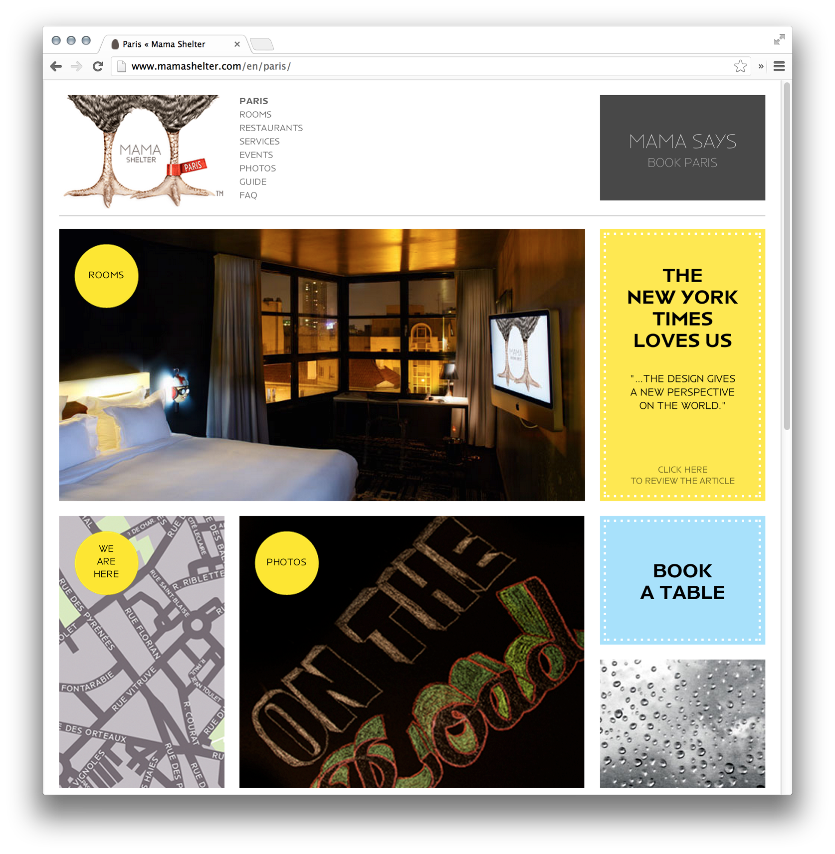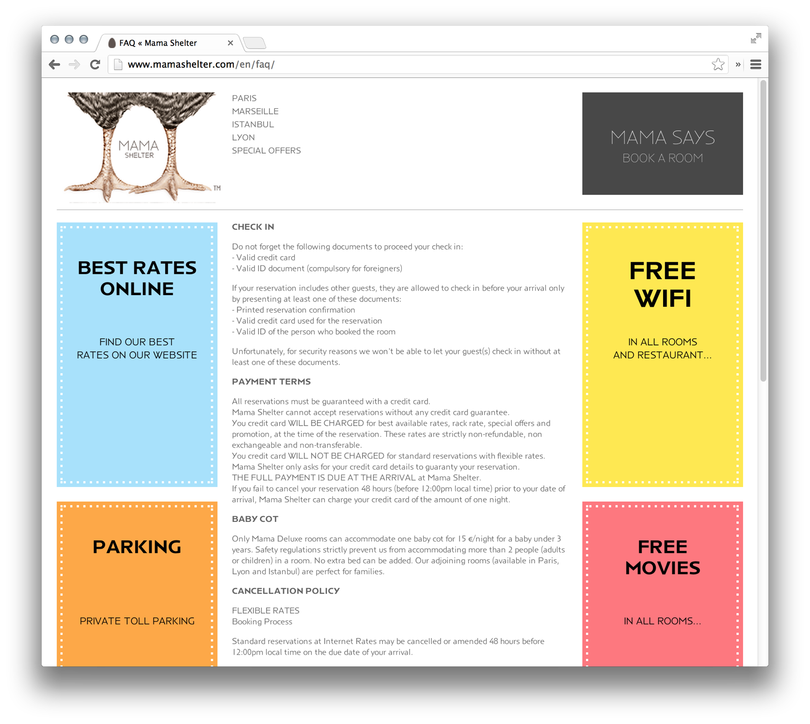 The logo is indeed an eyecatcher, immediately hinting at the unique personality of these accommodations. What they don’t mention there is that Anisette Petite is a key part of Mama Shelter’s look, and they utilize the typeface thoroughly. Unfortunately, some of the website text is far too small and light, especially for modern displays, and pieces like the (otherwise useful) map and guide are lacking attention to typographic detail. (Boo, full justification!) But some type, such as the large headlines on solid colored rects, works great.