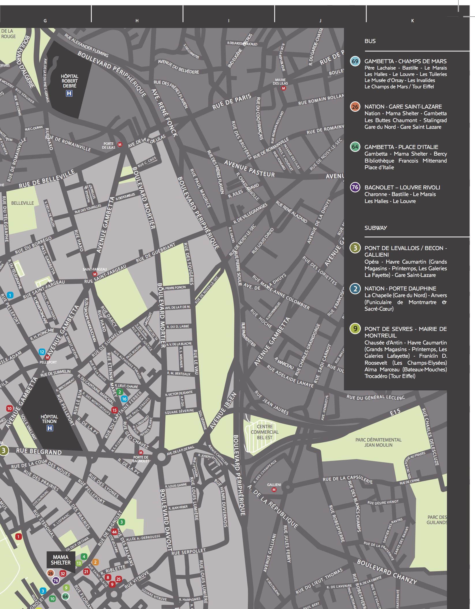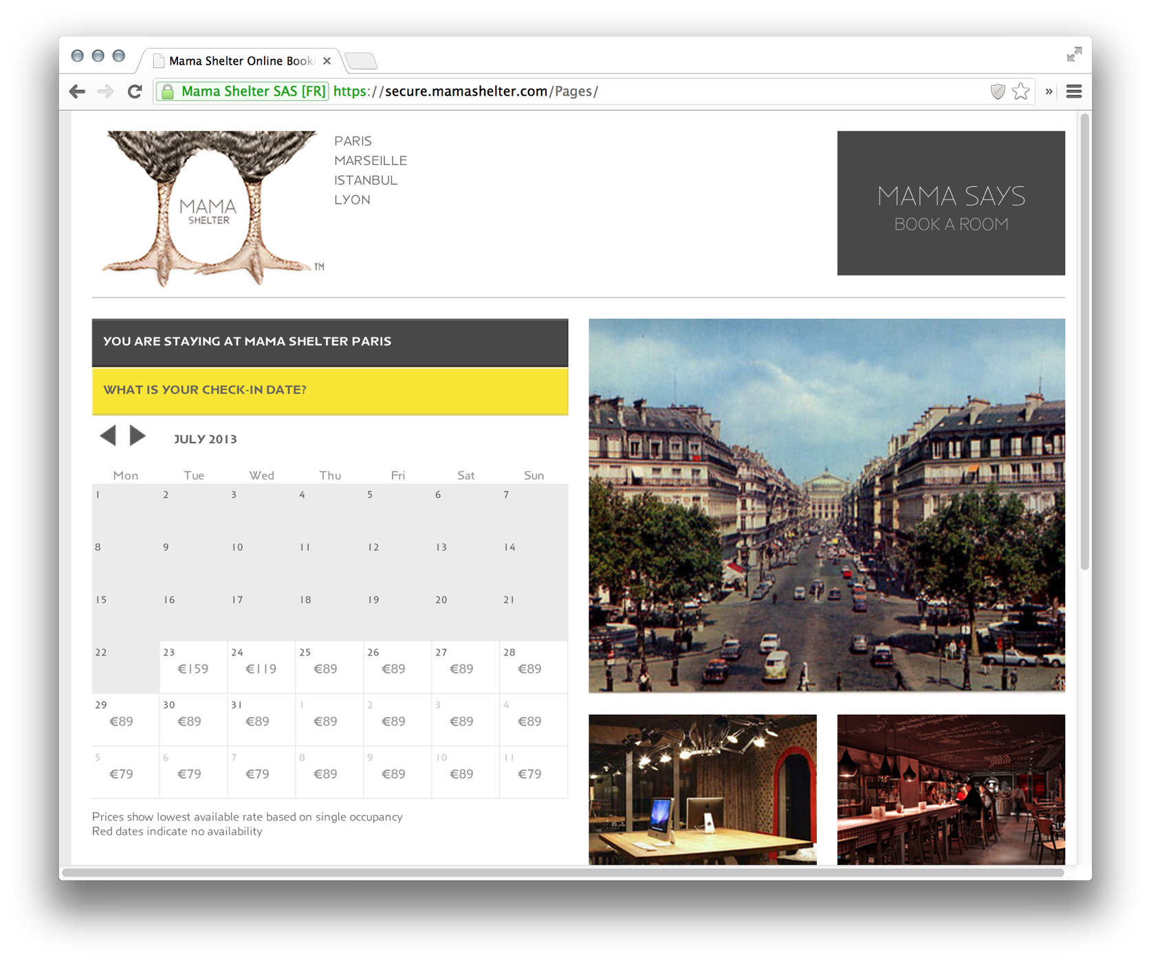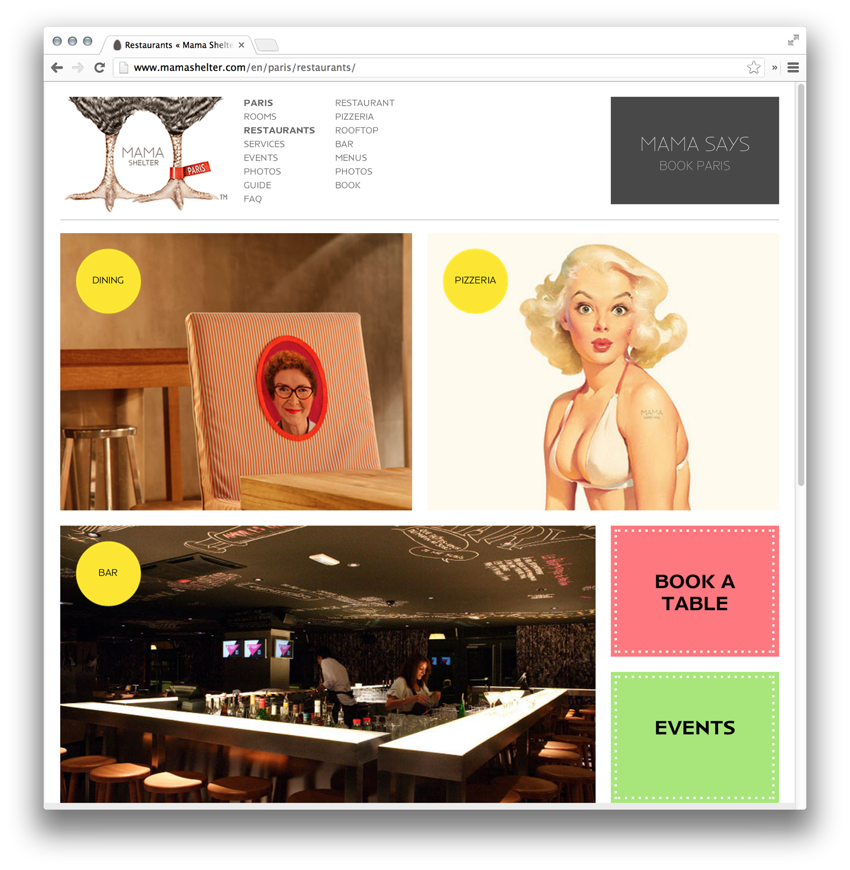 The logo is indeed an eyecatcher, immediately hinting at the unique personality of these accommodations. What they don’t mention there is that Anisette Petite is a key part of Mama Shelter’s look, and they utilize the typeface thoroughly. Unfortunately, some of the website text is far too small and light, especially for modern displays, and pieces like the (otherwise useful) map and guide are lacking attention to typographic detail. (Boo, full justification!) But some type, such as the large headlines on solid colored rects, works great.