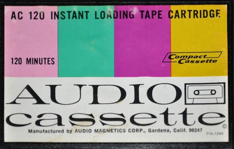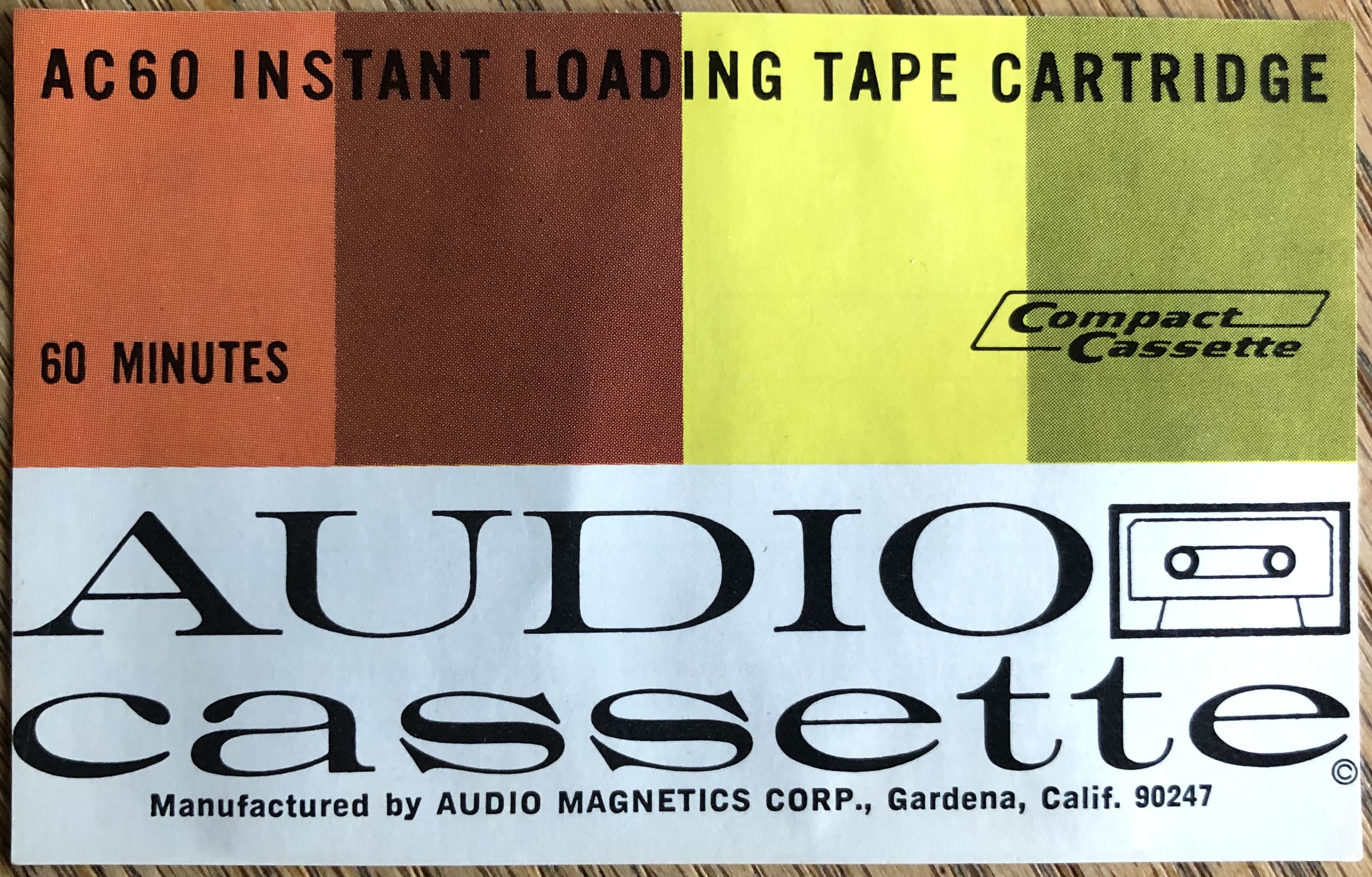 Audio Magnetics Corporation was founded in 1966 in Gardena, California. Sometime before 1972 (maybe in 1970), the company launched a series of blank audio cassettes. It seems that each of the products (60, 90, 120 minutes) was assigned a different suite of four colors for the stripe pattern. The big type is Filmotype Royal, which appears to be a phototype interpretation of Old Style Expanded, originally released by Barnhart Brothers & Spindler before 1893. The smaller text is set in what looks like Trade Gothic Bold and Bold Condensed.
