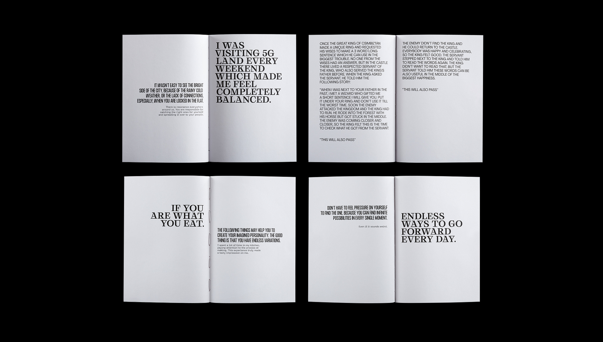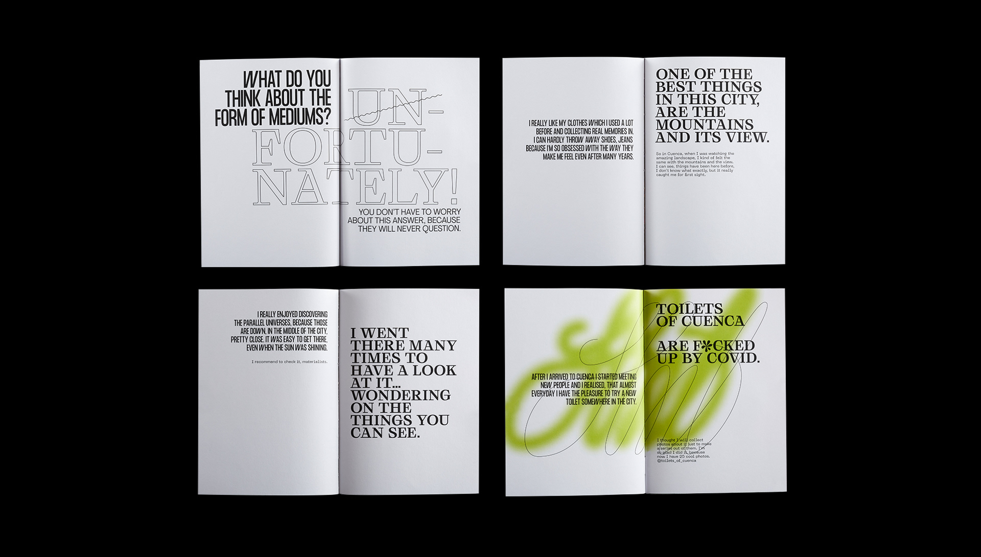 The main texts use Grafier, Formula Condensed and Neue Machina. On the other pages I was playing around with these and other fonts because I wanted to experience them in various combinations without any limitations. It was a kind of practice that helped me a lot to handle font combinations more consciously in my following projects.