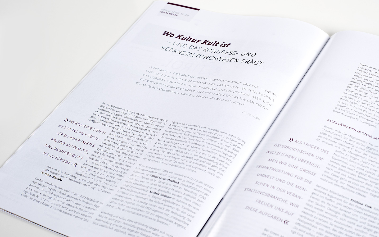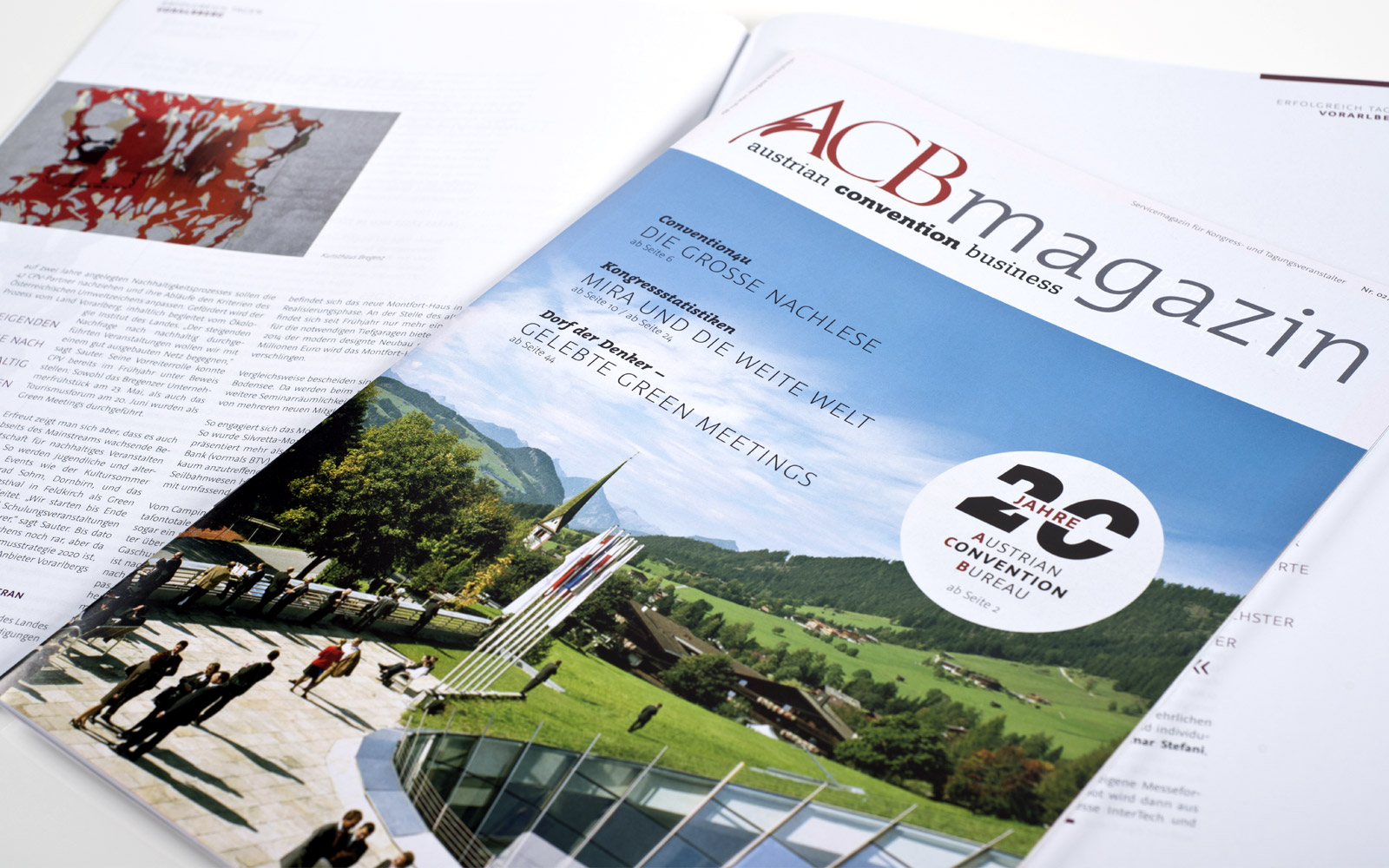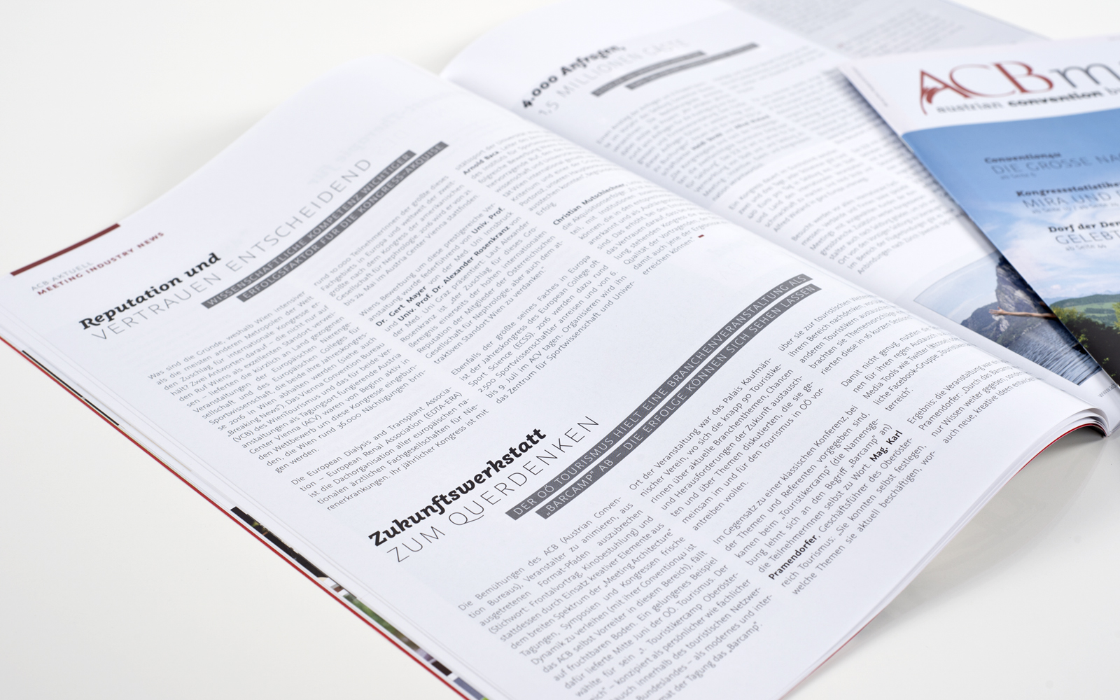 The Austrian Convention Bureau (ACB) is a non-profit-organization and serves as the platform for the Austrian congress and conference industry. With the latest issue, Vienna-based design agency Komo introduced a redesign of the ACB magazine that employs a dozen styles from Georg Seifert’s Graublau superfamily.