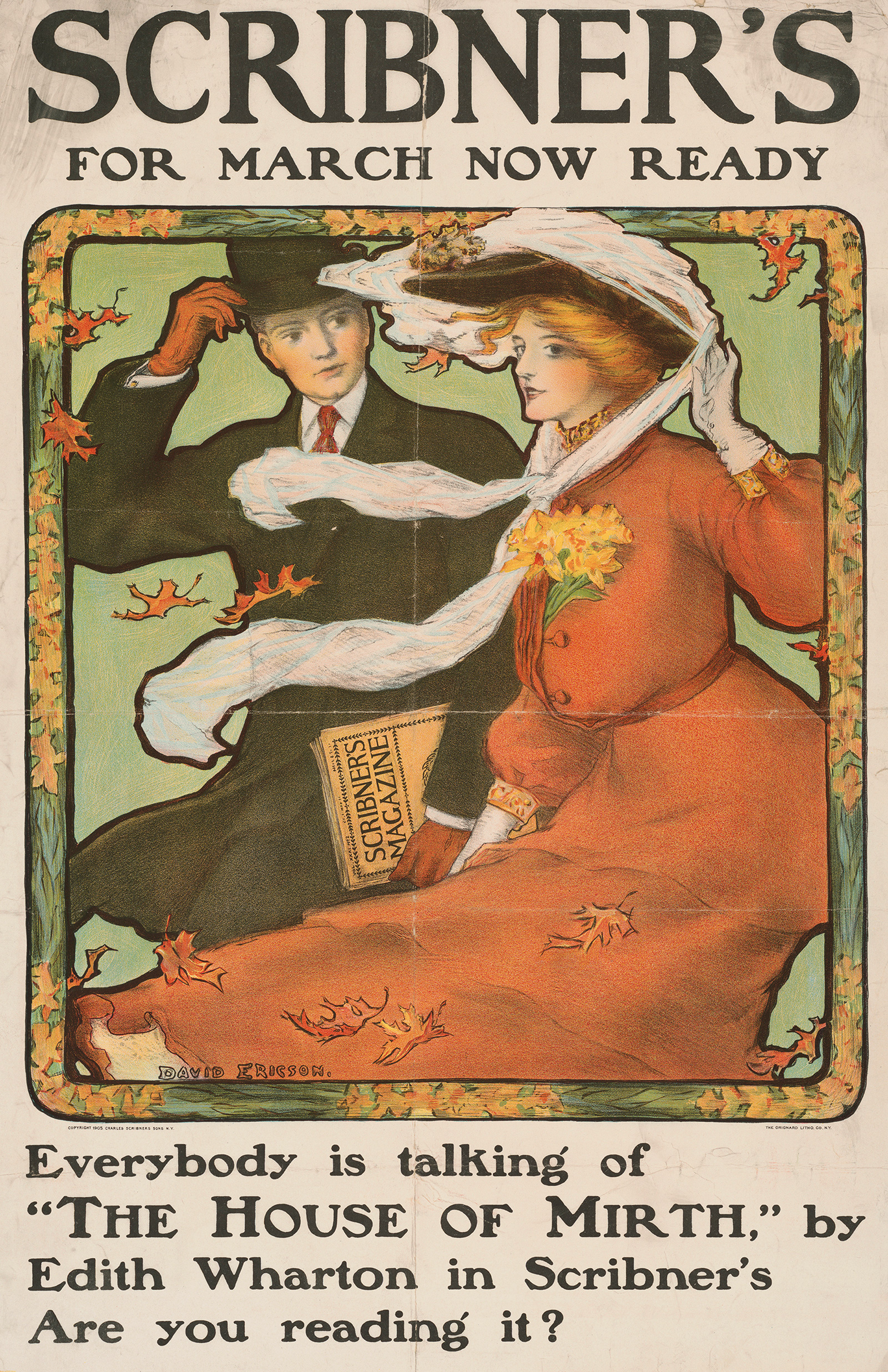 A gorgeous poster for Edith Wharton (1862–1937)’s 1905 novel, The House of Mirth, which was serialized in Scribner’s Magazine, beginning in January 1905. It was illustrated by David Ericson (1869–1946).