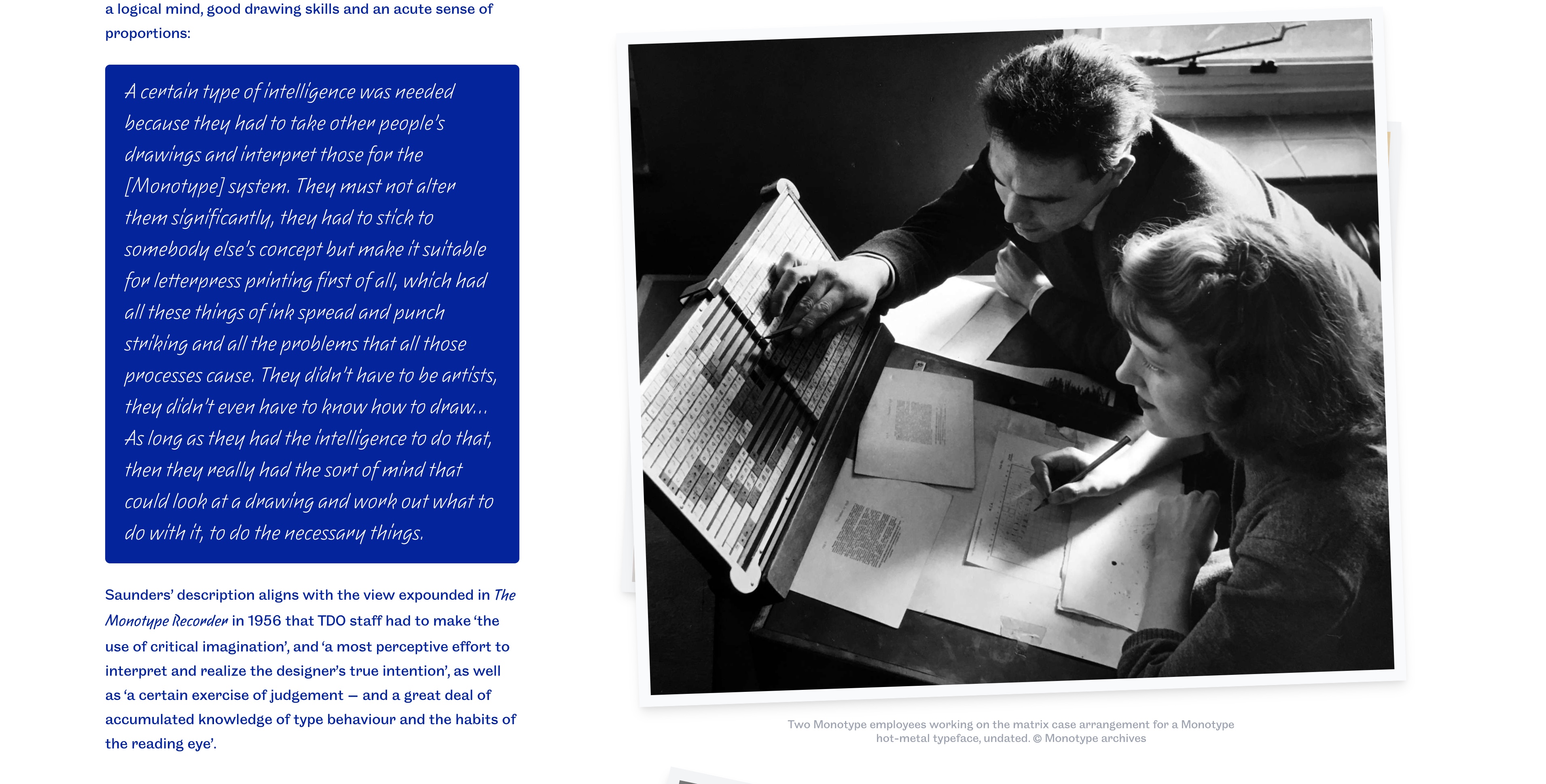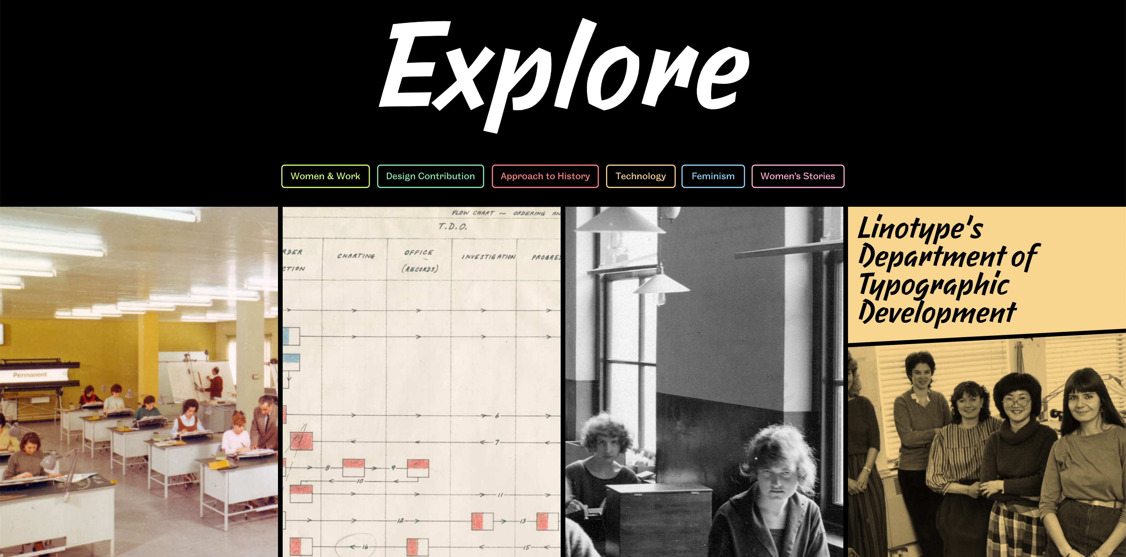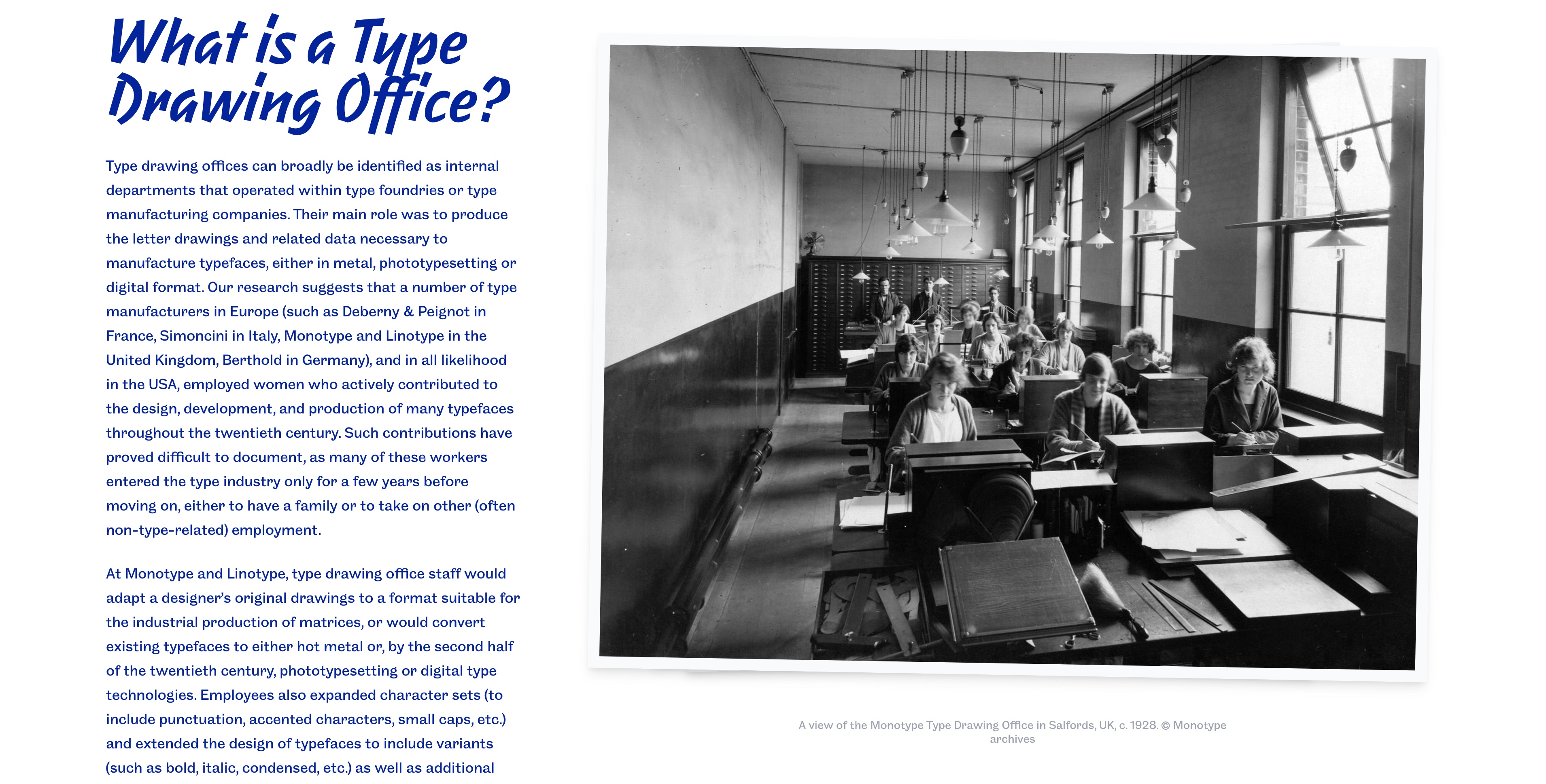 In terms of design, the website makes heavy use of Gig designed by Franziska Weitgruber for any display use, including the titles of the articles. It was chosen because it gave an energetic hand-drawn feeling which was reminiscent of the work accomplished by the women of the type drawing offices while remaining fresh and contemporary.