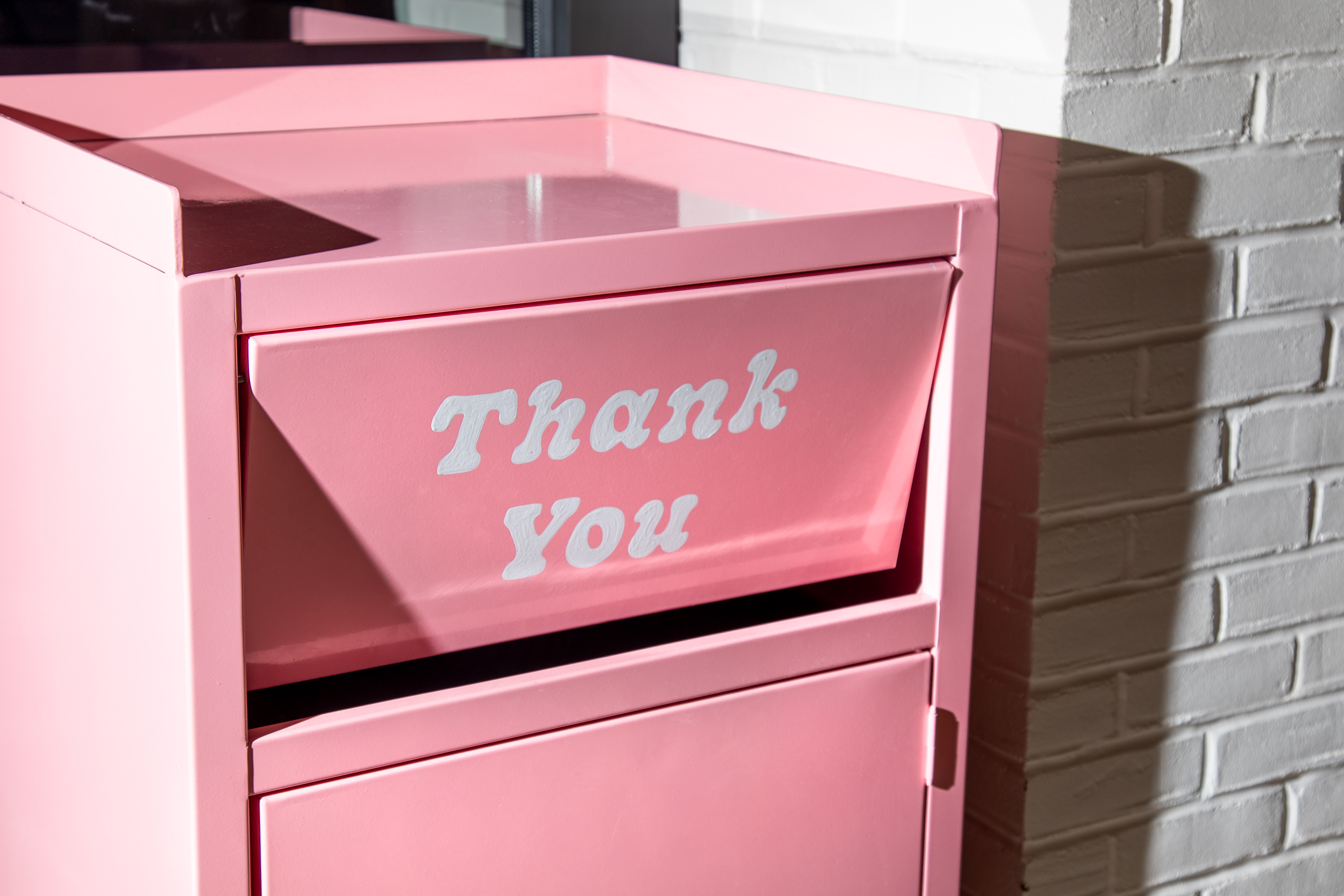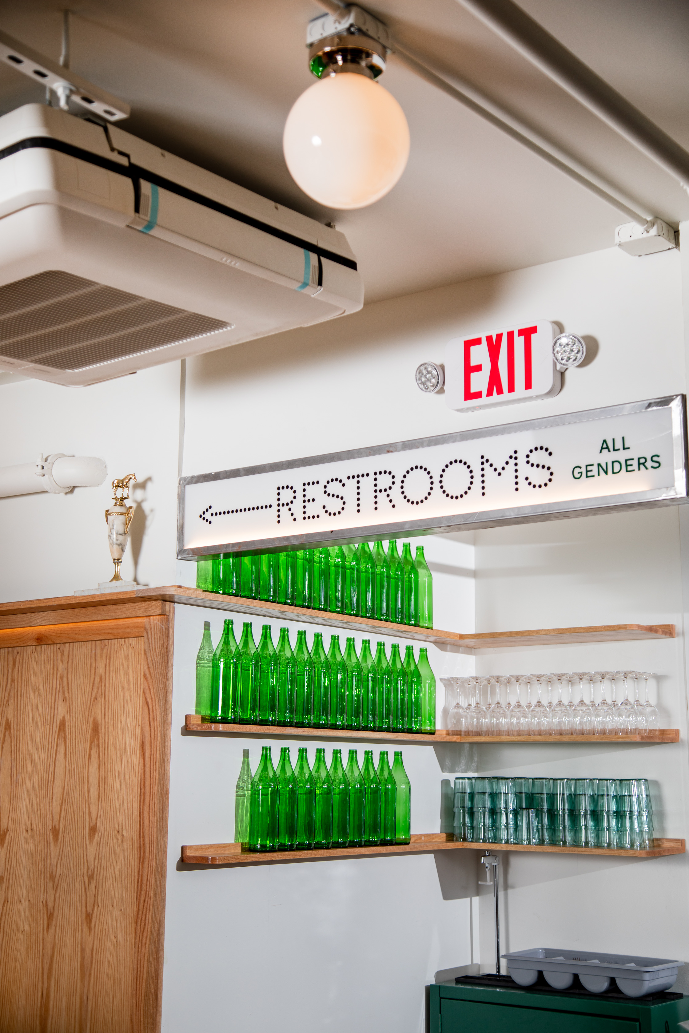The dotted caps from F37 Ping Pong are featured for the restroom light box sign, together with an unidentified sans serif used for “All Genders” [edit: it’s Compadre, see comments]. While the sign with the Clubhouse Policy shows a hand-rendered version of GT Alpina Italic by Grilli Type, the words “Thank You” painted on the pink trash can are modeled after Gooper Italic by Very Cool.