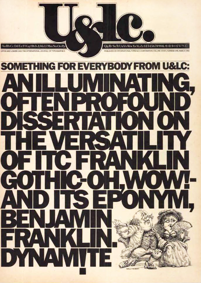 This introduction of ITC Franklin Gothic was a clever presentation of facts about Benjamin Franklin and a typographic demonstration of type tailoring to achieve a perfectly justified type block as well as hanging punctuation, even below the baseline. Design: Herb Lubalin, production: Jason Calfo.