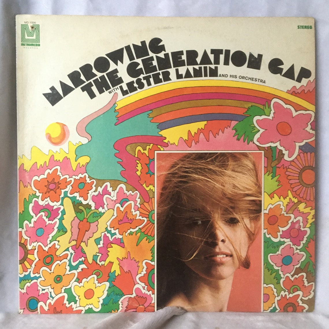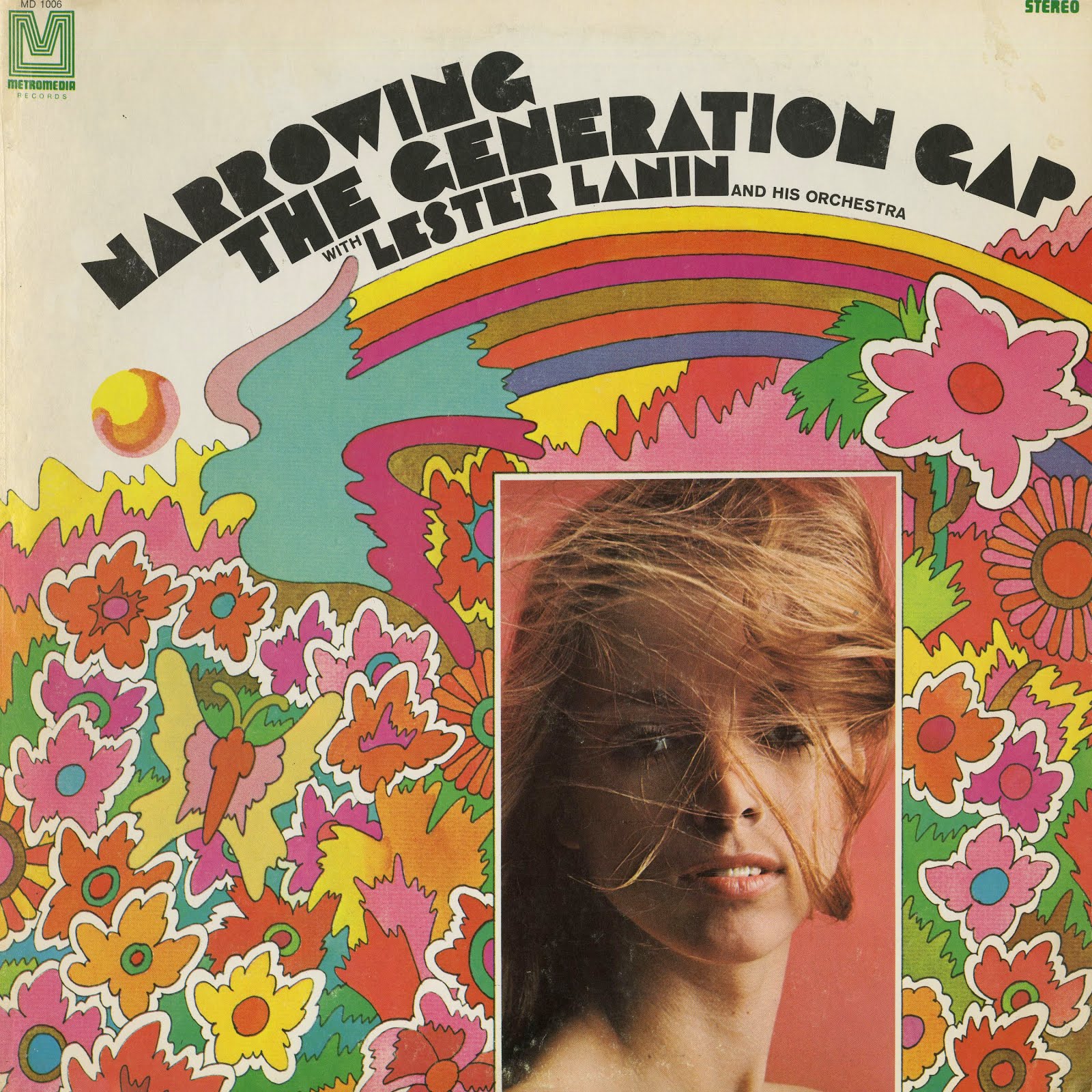 1969 release by the Lester Lanin Orchestra which was formed in the 1930s and led by Lester Lanin (1907–2004). According to the title, this big-band jazz/easy listening album is an attempt at “narrowing the generation gap”, featuring adaptations of recent hits like the Beatles’ “Ob La Di, Ob La Da” and (1968) “Aquarius” from the musical Hair (1967). The cover design tries to appeal to a younger audience as well, embracing a flowery hippie aesthetic complete with multicolored blossoms, a rainbow, a butterfly, and a dove.