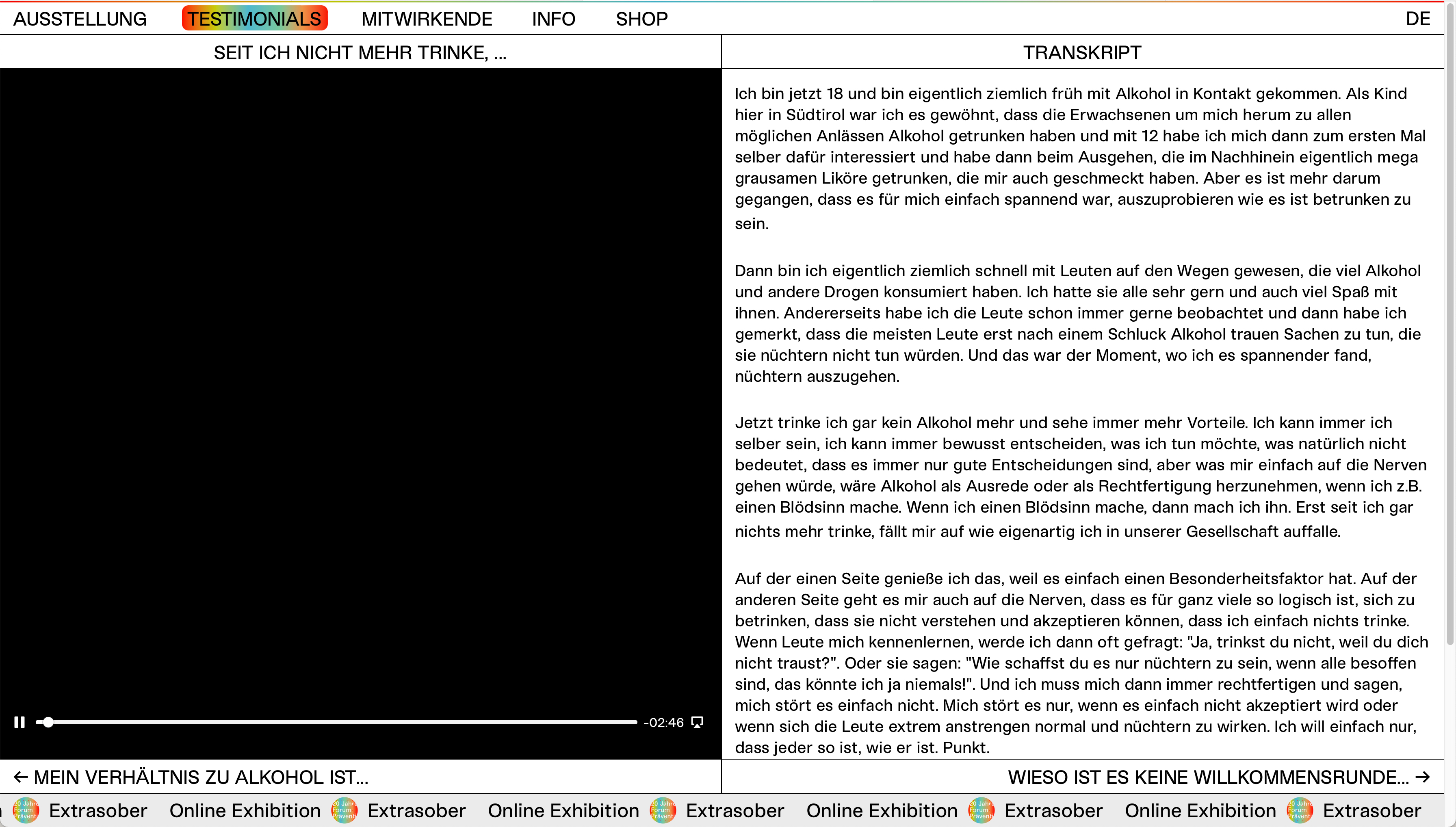 (…) One section of the exhibition website is dedicated to audio contributions by people who abstain from alcohol. Here you will find reports that reveal personal opinions about today’s drinking culture from a sober point of view and describe personal experiences.