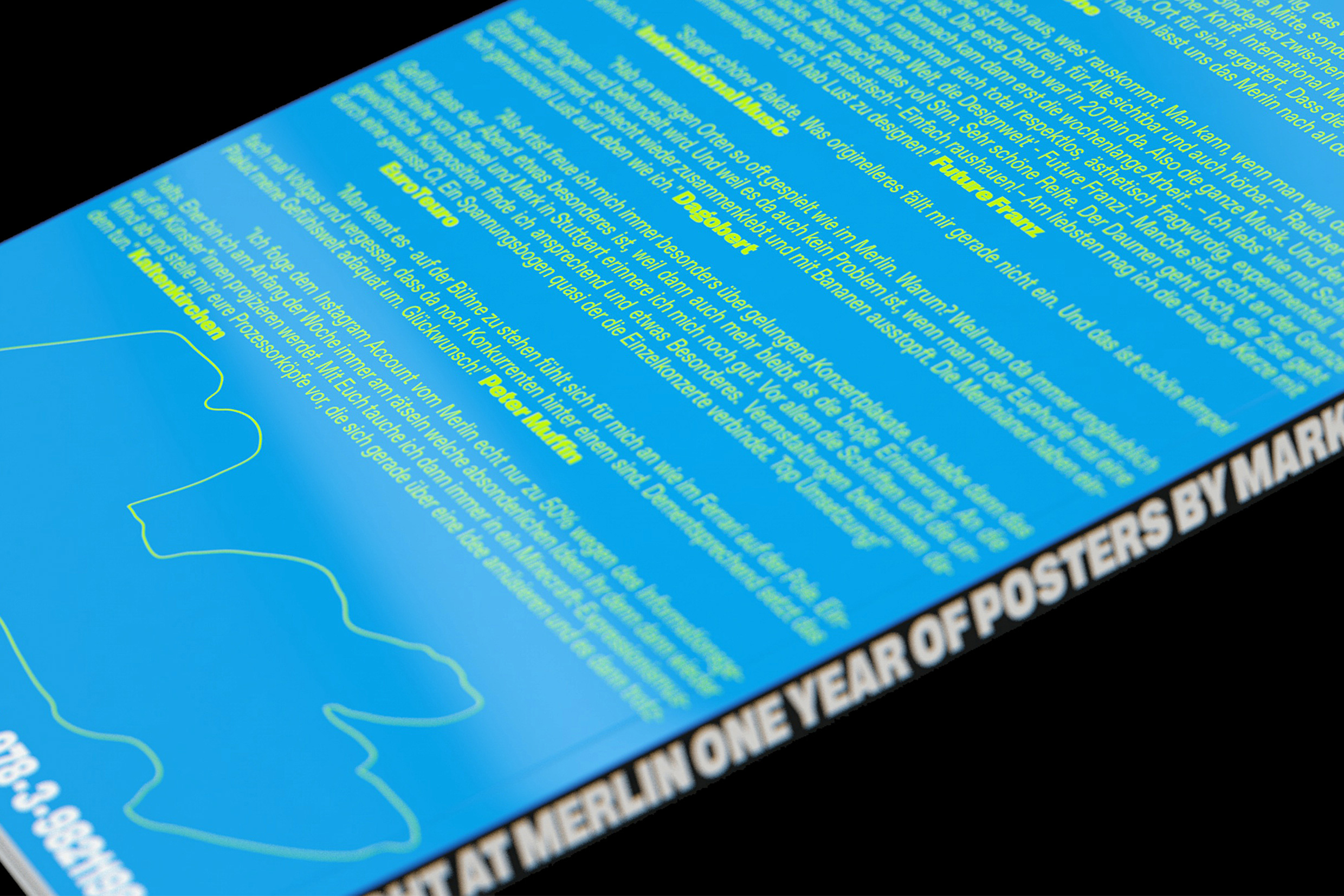 Over the course of a year, graphic designers Mark Bohle and Raffael Kormann designed posters for all concerts at the music and arts venue Kulturzentrum Merlin in Stuttgart. The publication Tonight at Merlin captures this noticeable collection. For each of the 80 posters, some of which have been awarded internationally, the publication offers an honest glimpse into the visual making-of and the corresponding thoughts behind. Moreover the publication is linked to the bands and their posters, enabling the reader to listen to the corresponding sound while deep diving into the artworks.