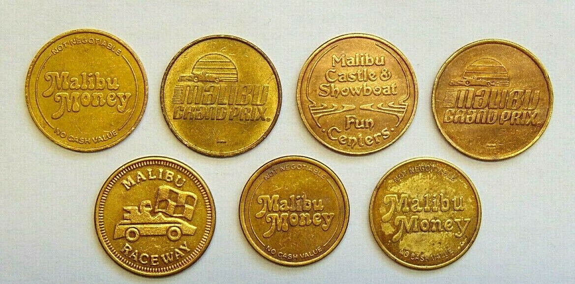 Coins for the Malibu Grand Prix and the Malibu Castle & Showboat, additionally featuring DeVinne Ornamental and ITC Souvenir. From Preston Lerner’s article: