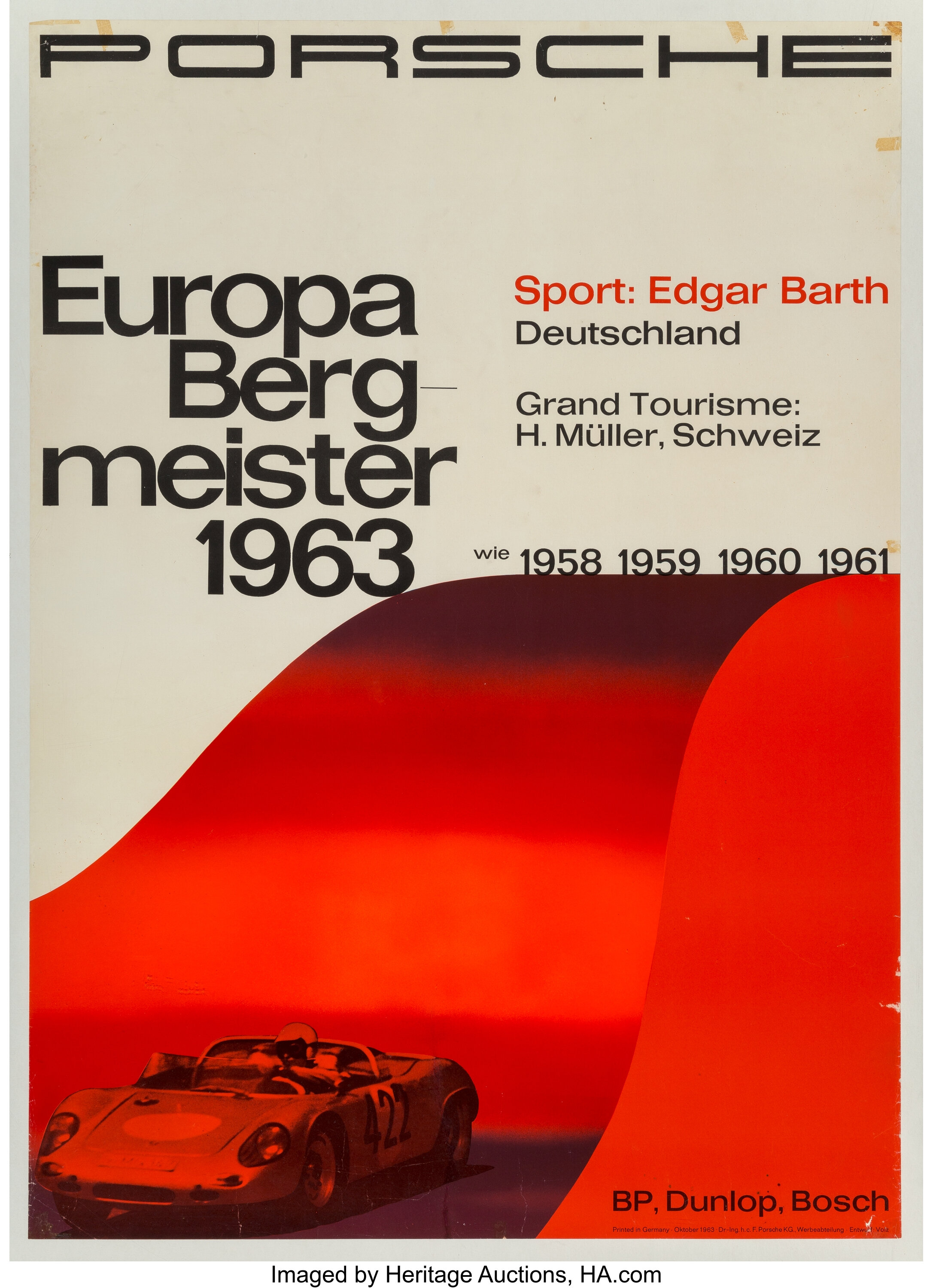 Europa Bergmeister 1963, showing a Porsche 718 Spyder and mentioning Edgar Barth and Herbert Müller. Design by Volz (Oct. 1963). Note the custom hairline hyphen, a frequently used device (see also the Europa-Rallye-Meisterschaft 1961 poster) that allowed the designers to show the type very big and still adhere to the German spelling rules, without letting the hyphens clutter the layout.