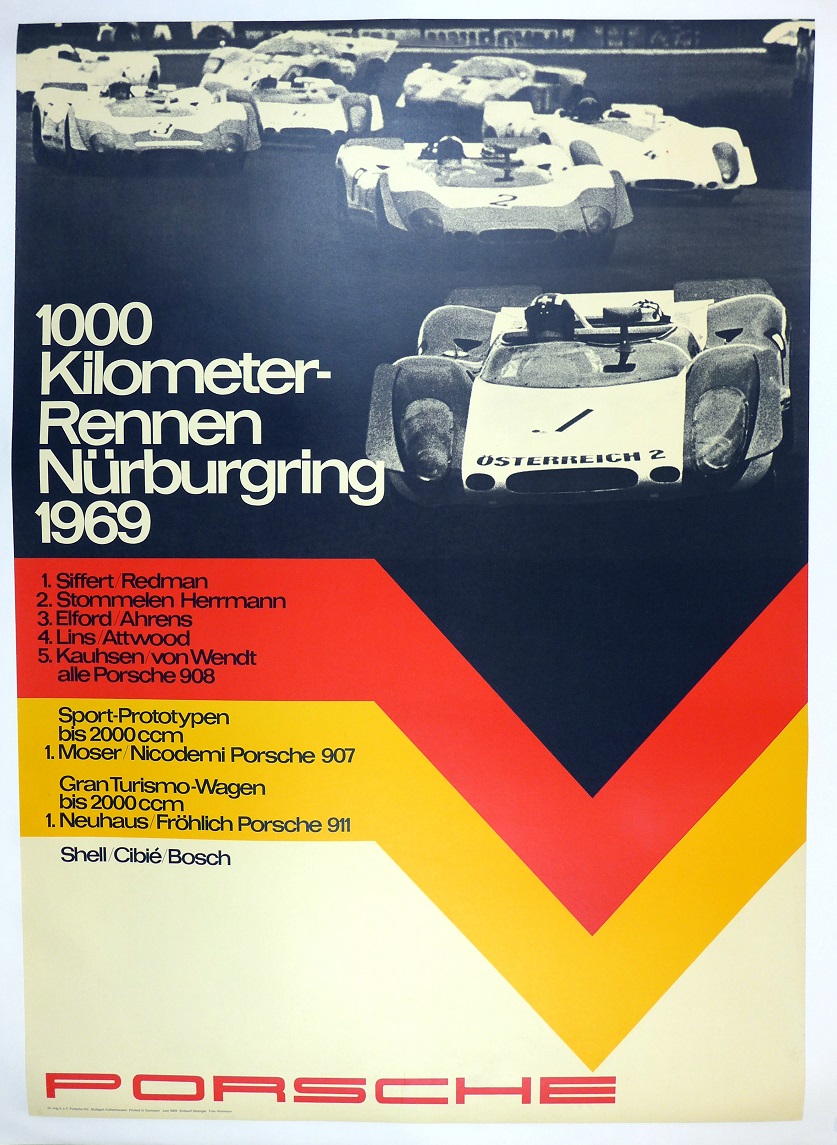 1000 Kilometer-Rennen Nürburgring 1969. Design by Strenger with a photo by Julius Weitmann, featuring the Porsche 907 and 908, and Folio, again with the alternate R (July 1969).