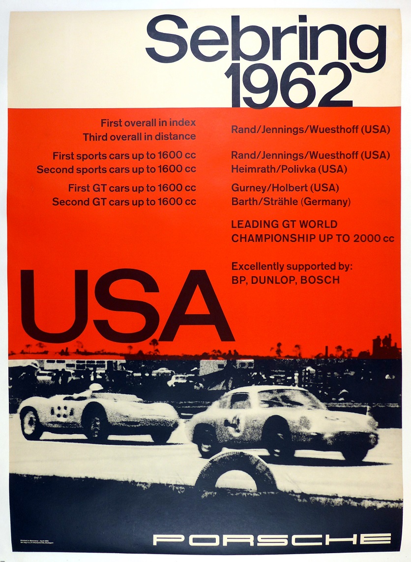 Sebring 1962, featuring the Abarth Carrera, shown leading the Porsche 718 RS-61. The smaller text here is set in Akzidenz-Grotesk.