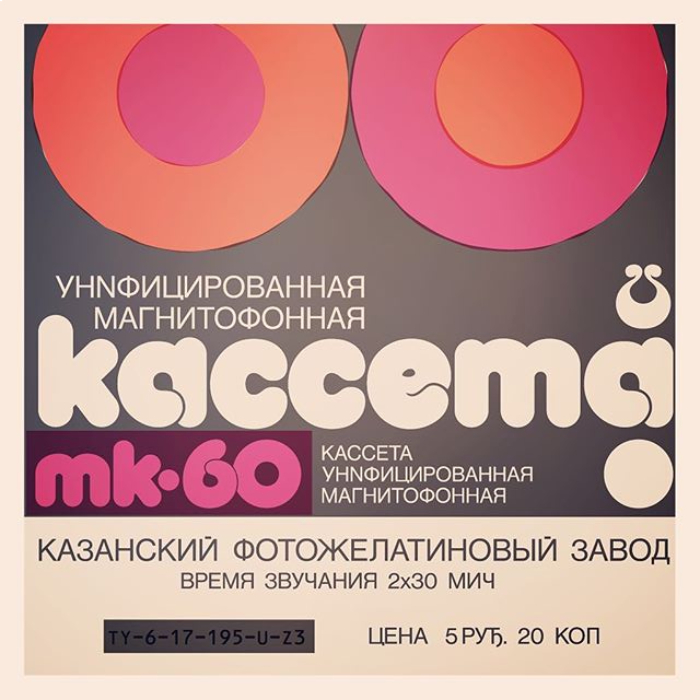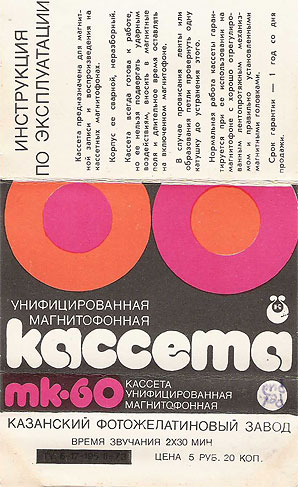 This insert is for a cassette tape manufactured at the Kazan Photogelatine Plant (Казанский Фотожелатиновый Завод) in Tatarstan, USSR, around 1975. The bold display typeface is lowercase Madeleine, designed by Colin Brignall at Graphic Systems in the UK and adopted around 1972 by Mecanorma, the French manufacturer of dry transfer lettering.