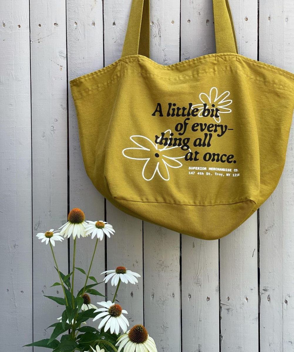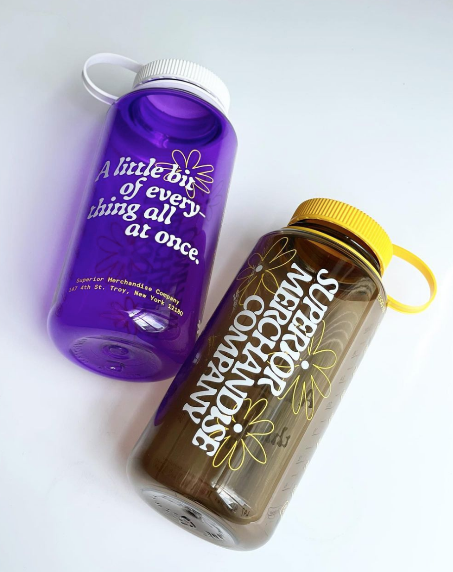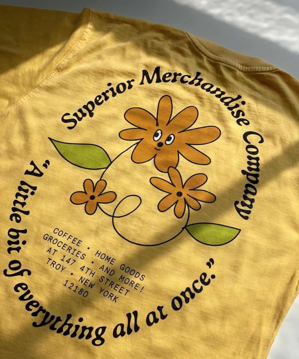 Superior Merchandise is a café and shop in Troy, New York. It was started by Felicity Jones, who also designs many of the offered items. A frequently featured typeface is Gaya (Out of the Dark, 2021), which is here shown used in its Italic style together with Aperçu Mono [identified by Jay Mellor, see comments], for T-shirts, Nalgene bottles, and bags.