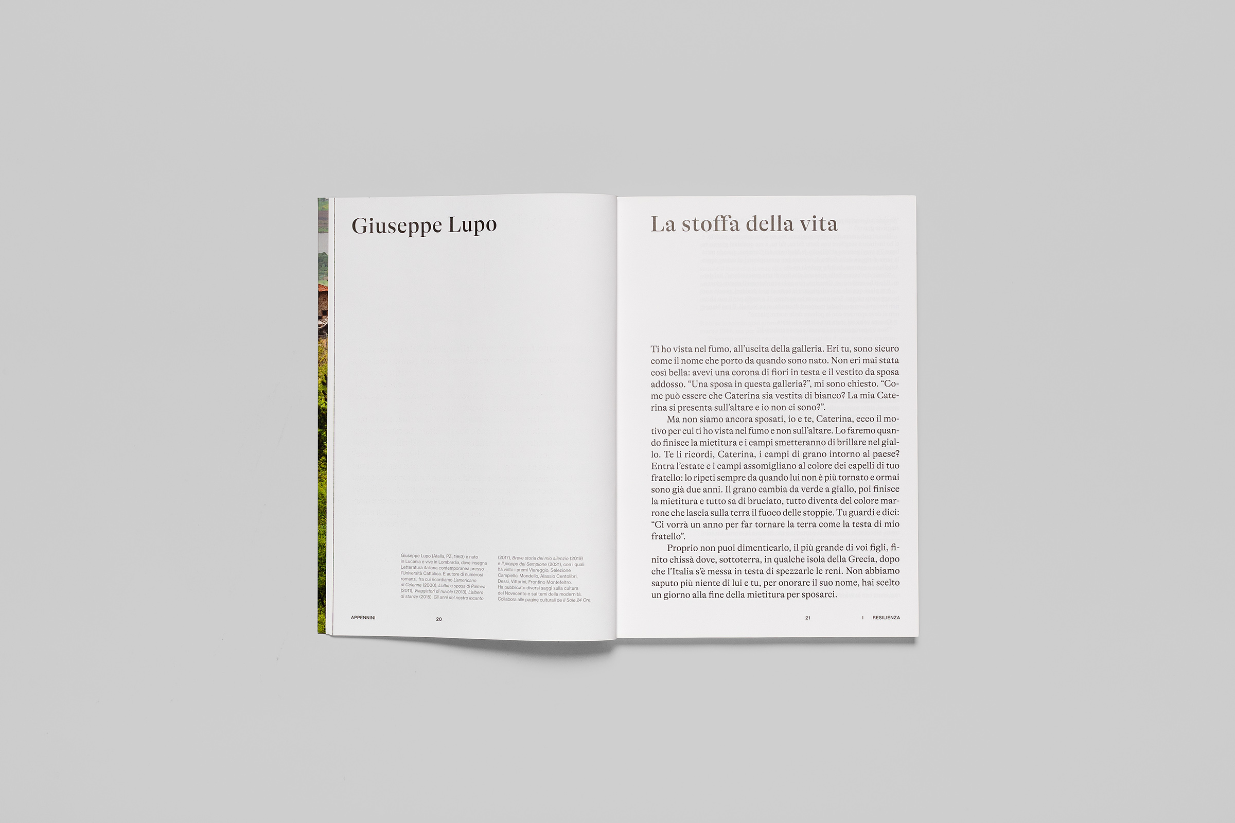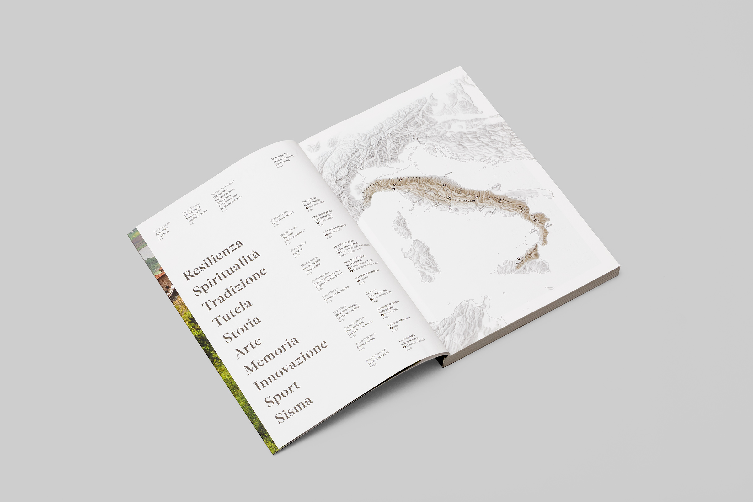 Appennini is the year-end book dedicated to members of the Touring Club Italiano (the major Italian National Tourist Organization, since 1894). A trip to Italy, following its backbone, with thematic stories from spirituality to innovation, through memory and so on. An in-depth and popularization book.