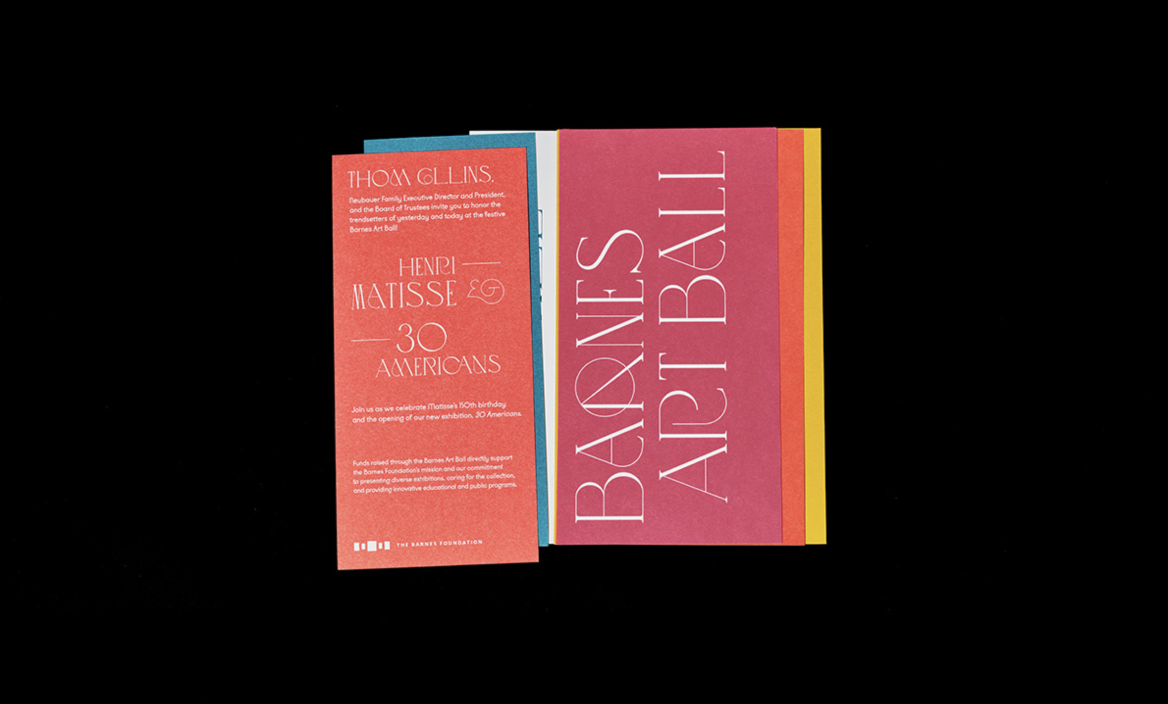 The thin lines hint at the delicate linework in archival Matisse drawings. The color palette was drawn from Matisse paintings within the Barnes collection. As the invitation unfolds, you’re introduced to each new vibrant color, and new glyphs of Love, the typeface.