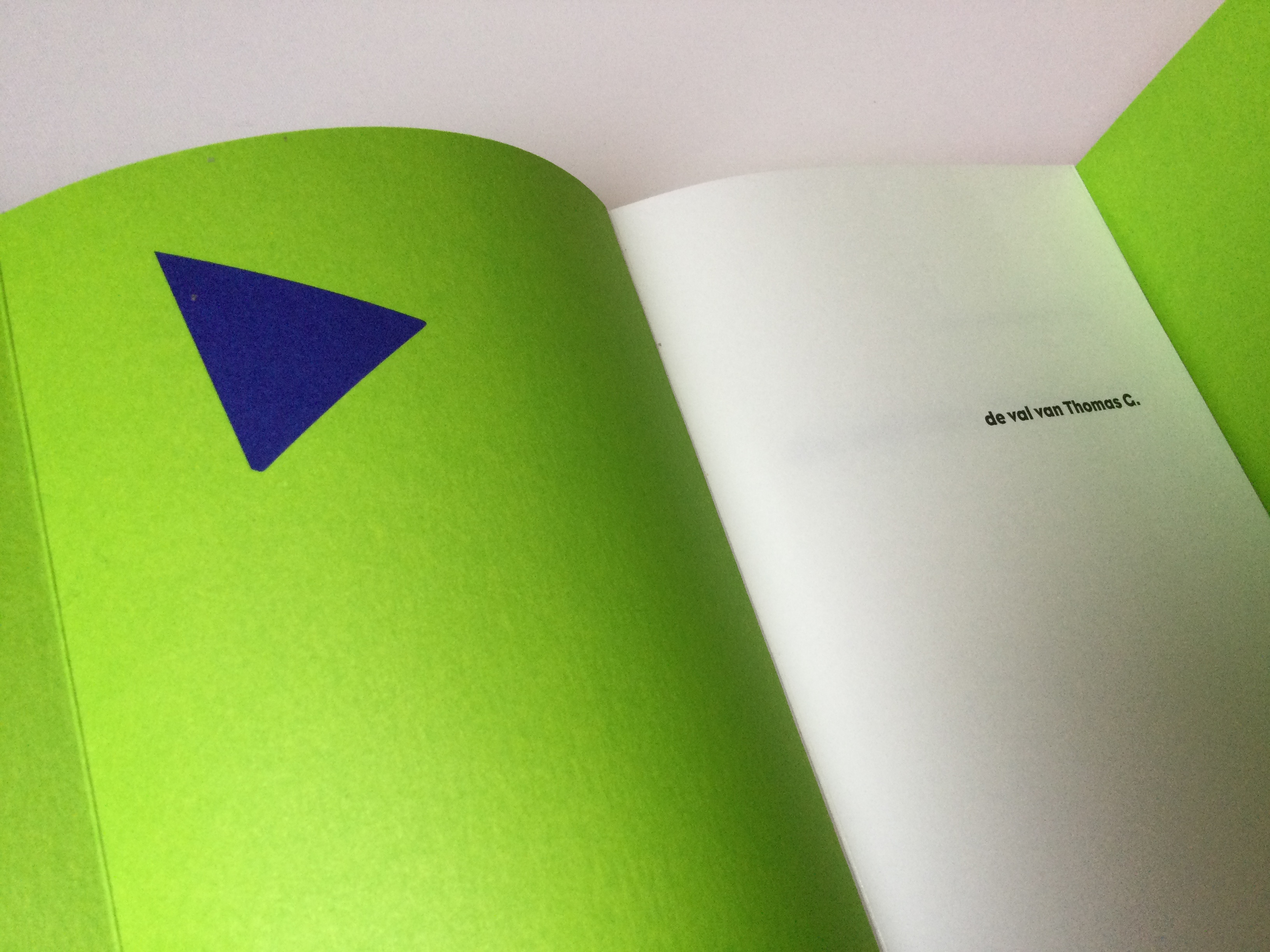The positioning of the big, bleeding type in capitals represents an actual VAL (fall, descent or trap). The parts that literary fall off are to be found on the innerside of the cover.