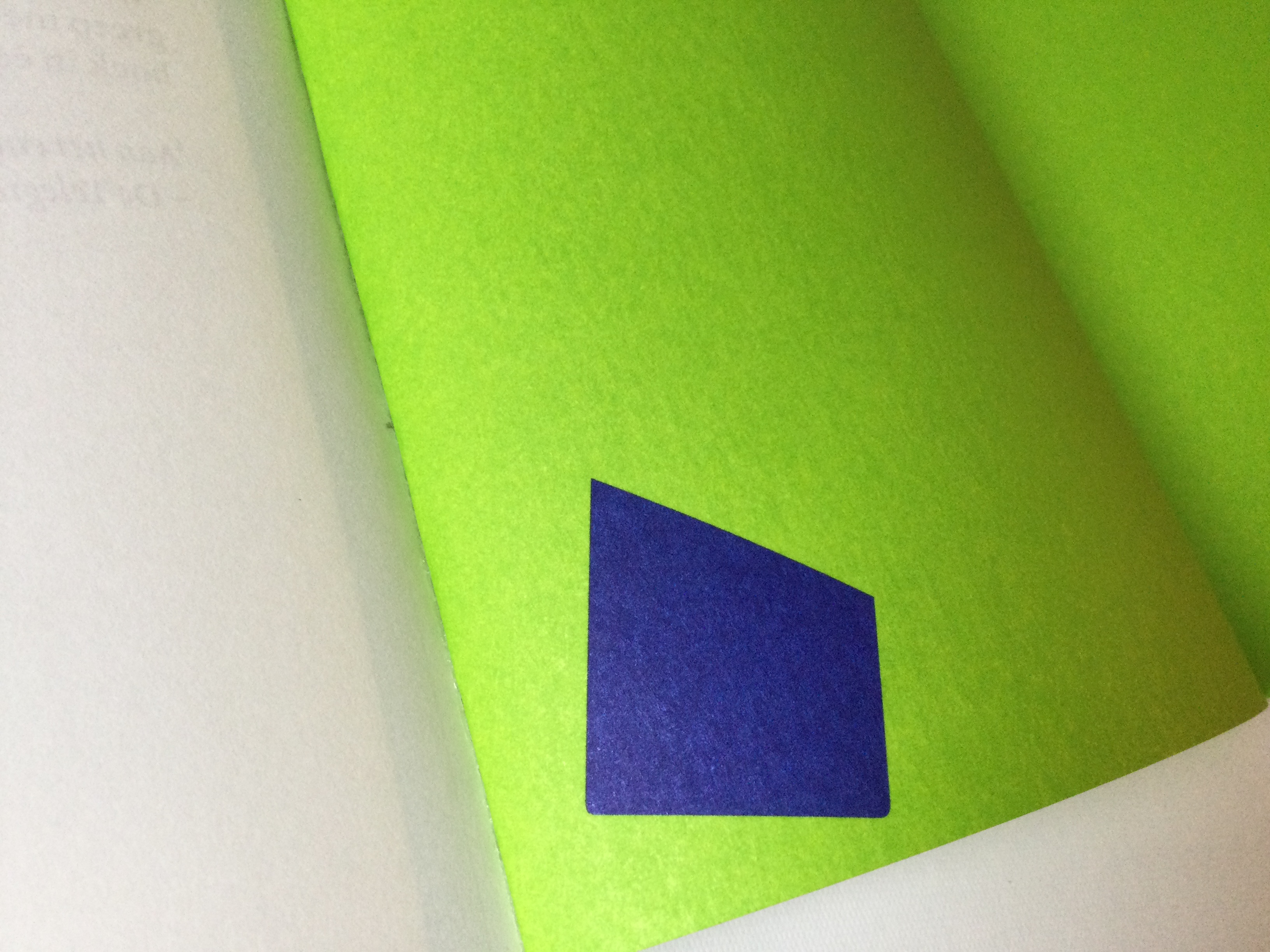 The blue and green are Pantone colors printed in two hits in order to intensify their brightness on the uncoated textured paper. The color on the block was meant to emphasize the three-dimensionality of the book but unfortunately could not be realized.