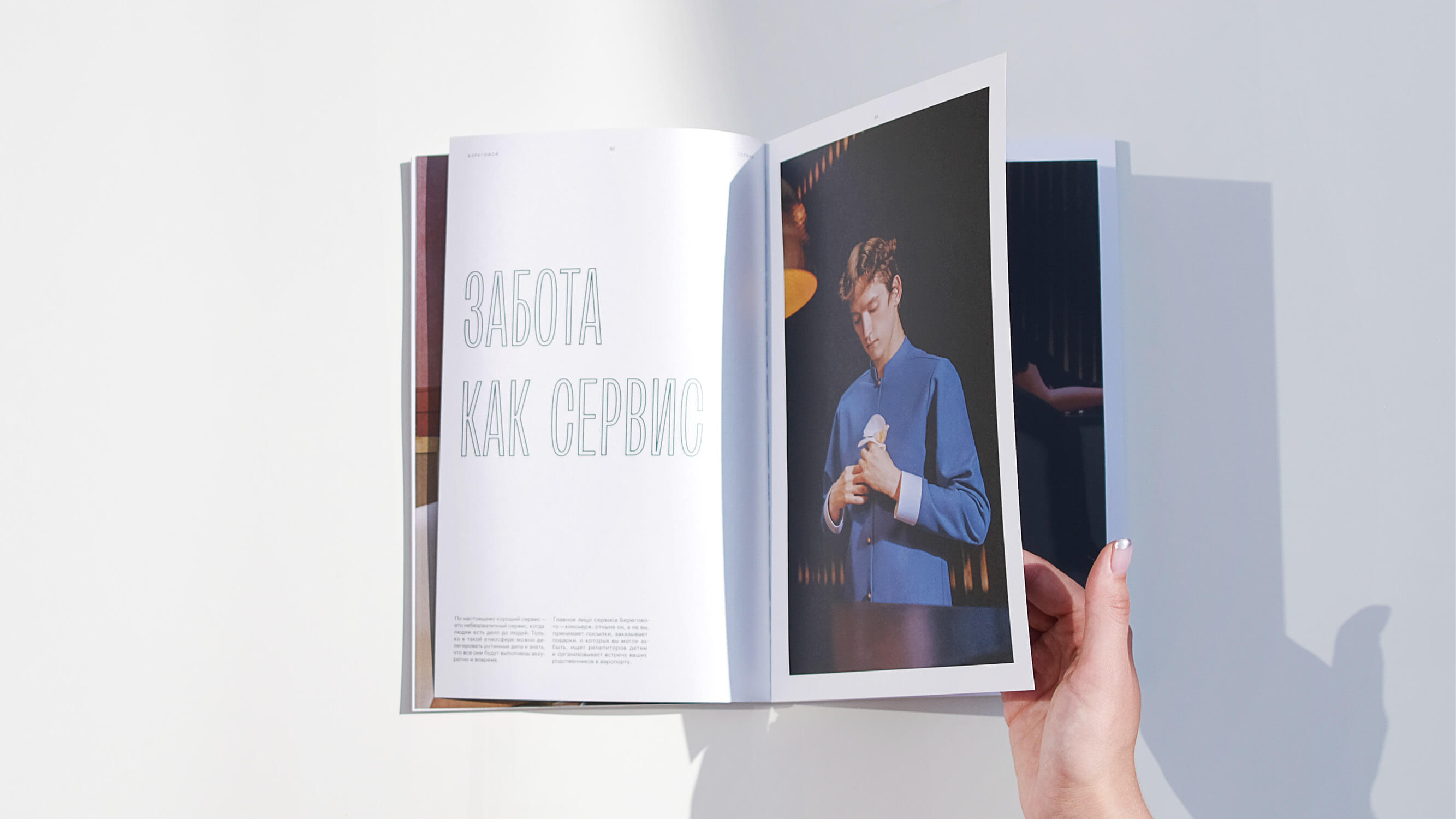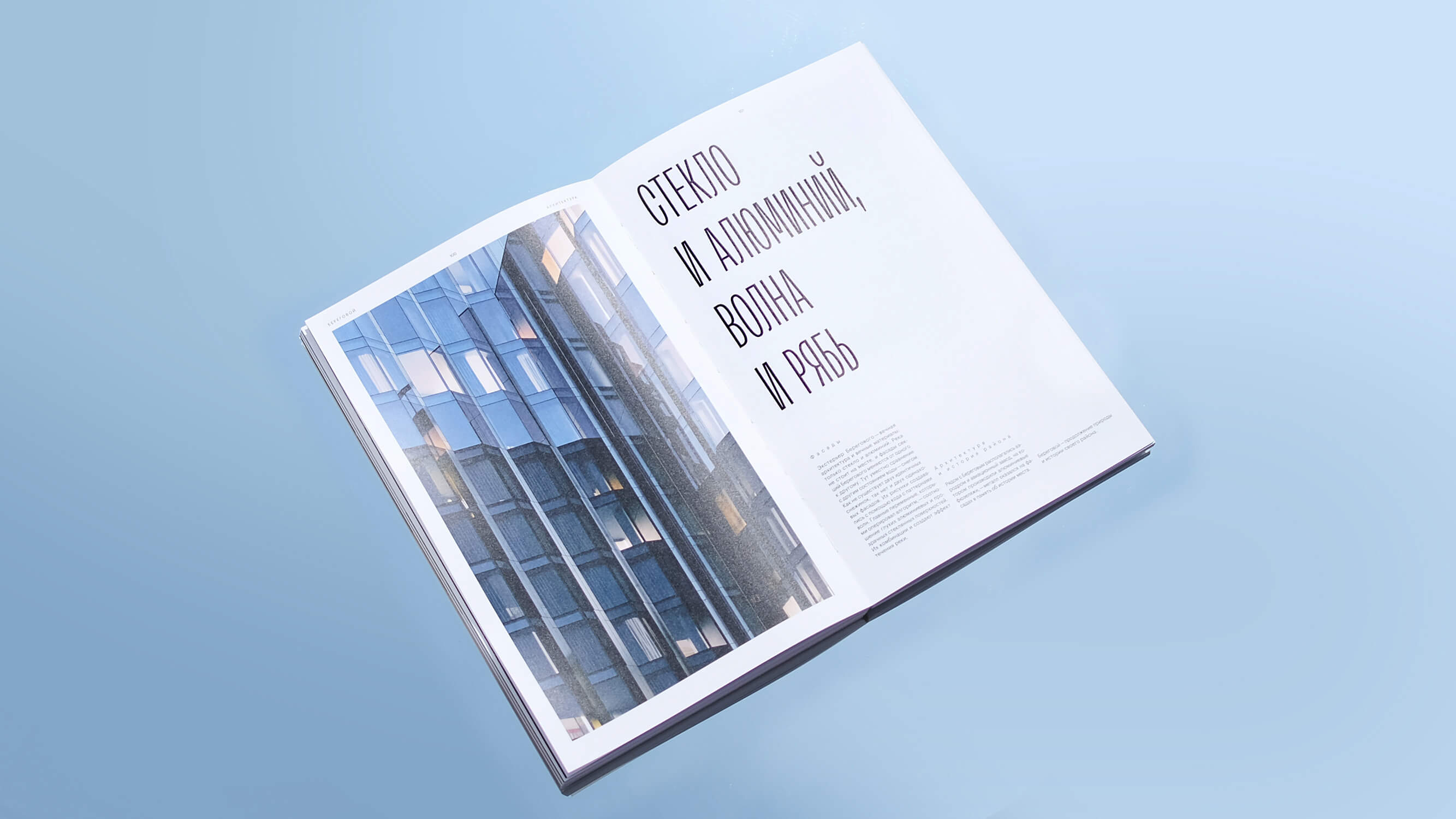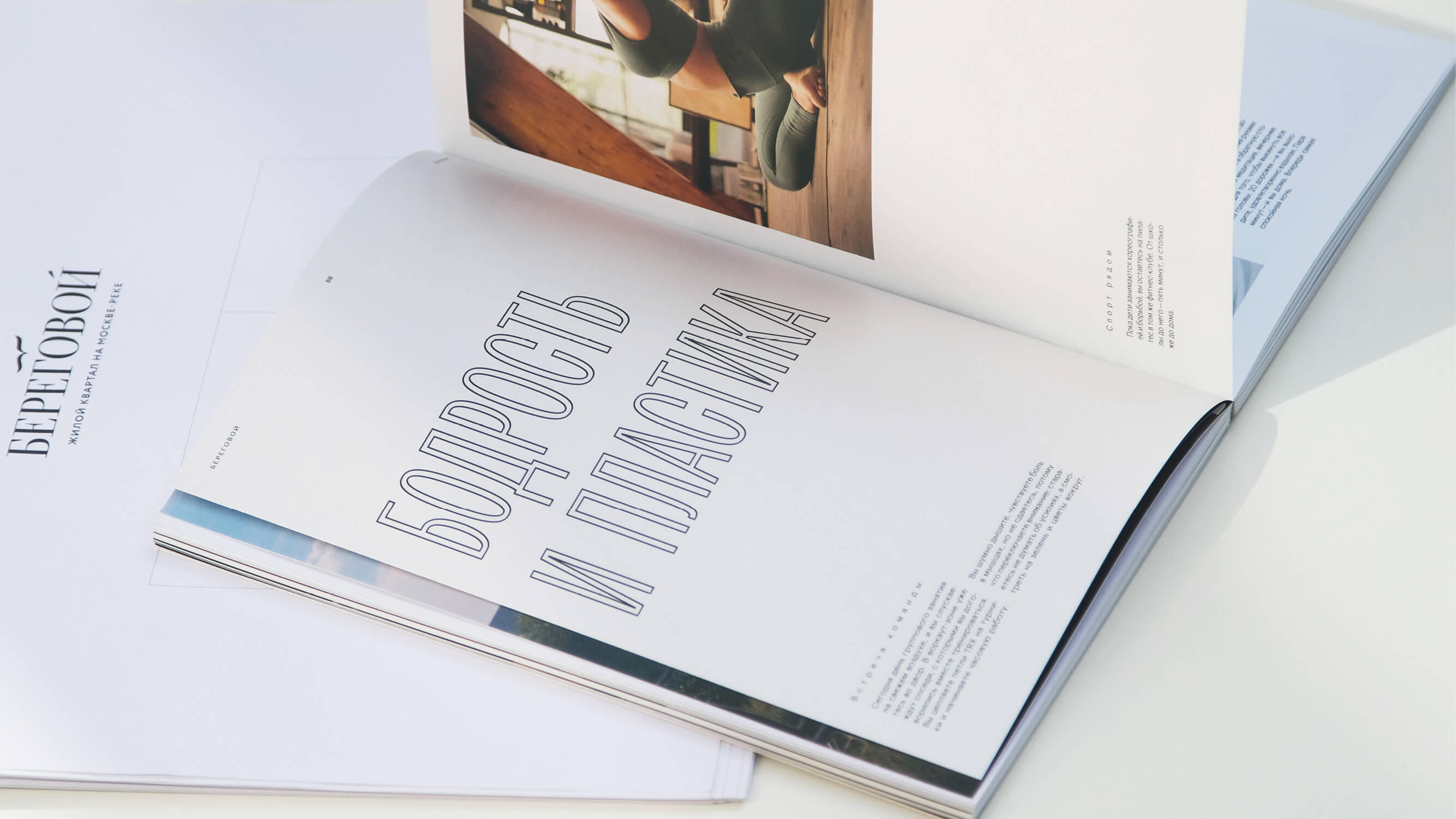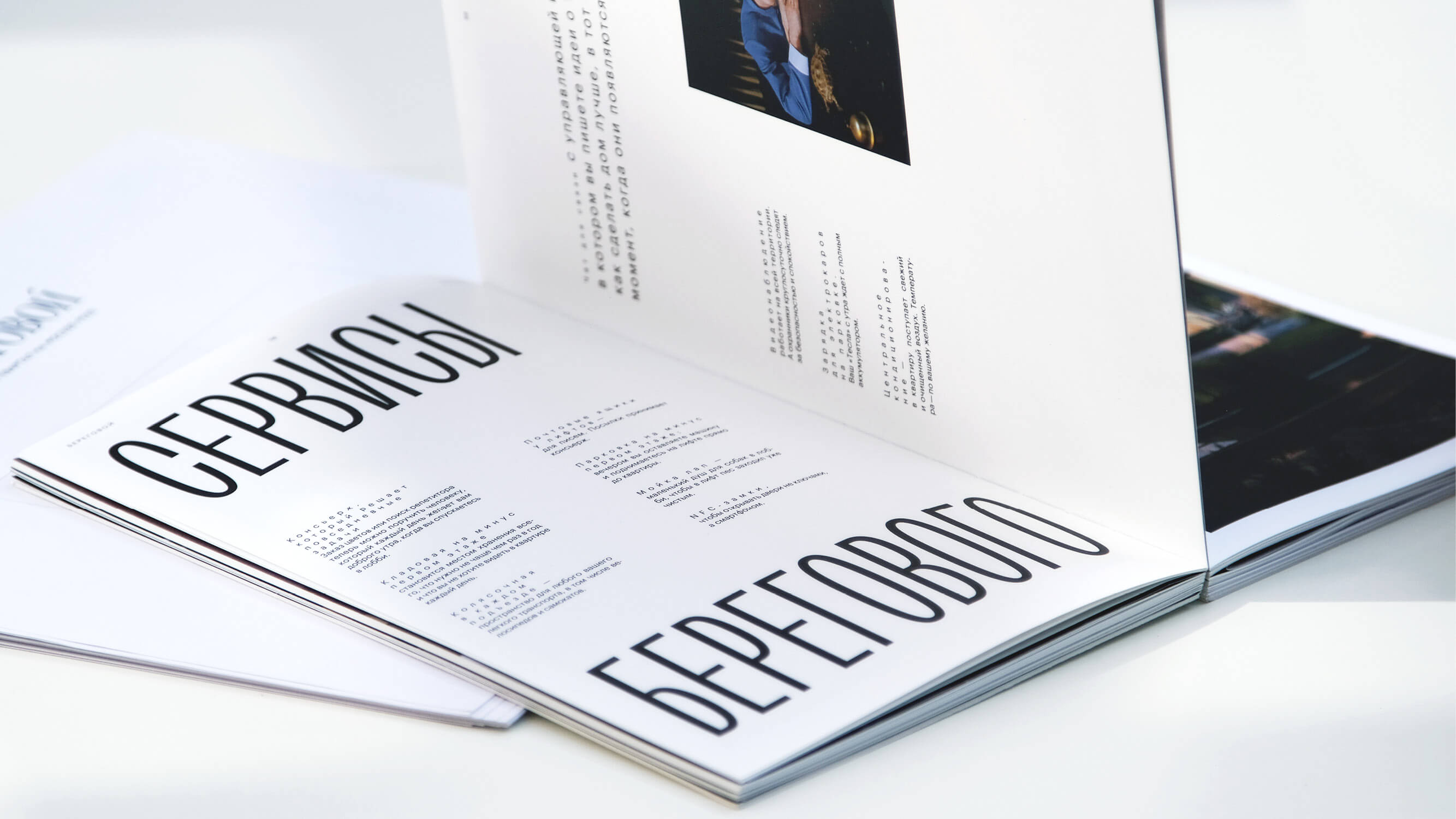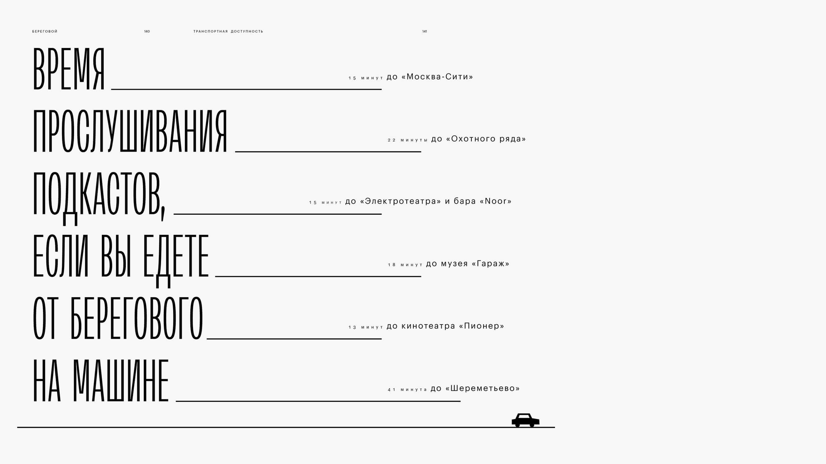 The architecture of housing complexes often distorts the face of the city, while Beregovoy does the opposite, building a dialogue between the residential complex and the surrounding landscape. And Archaism, conceived as an answer to manipulations with type and denying artificial transformations, addresses the same values. Narrow dense setting in Archaism highlights the key points, contrasts with body text and brings in the elegance into our layout. Bright design of the typeface at large sizes becomes practically the main graphics in the booklet.