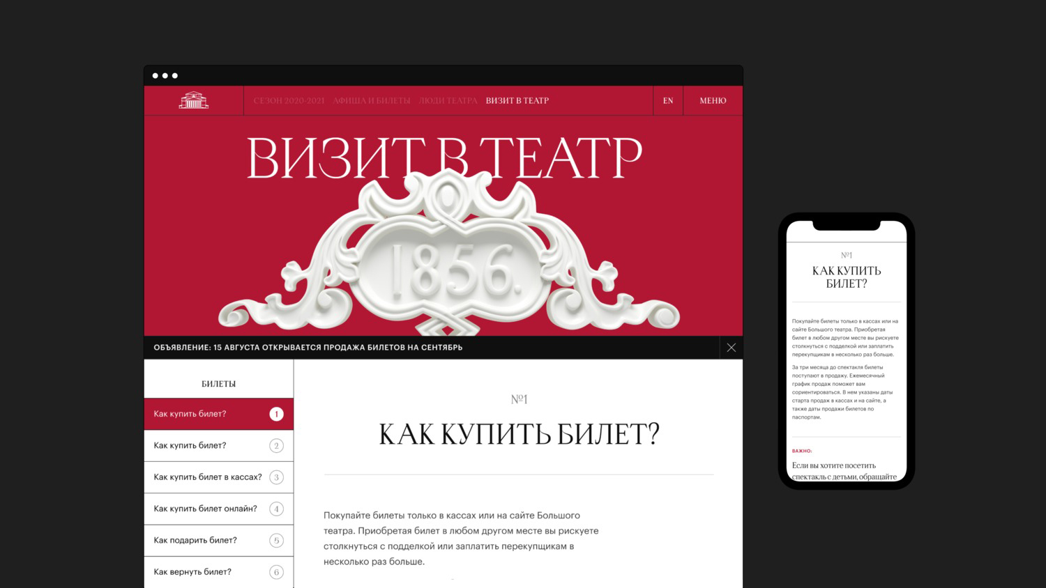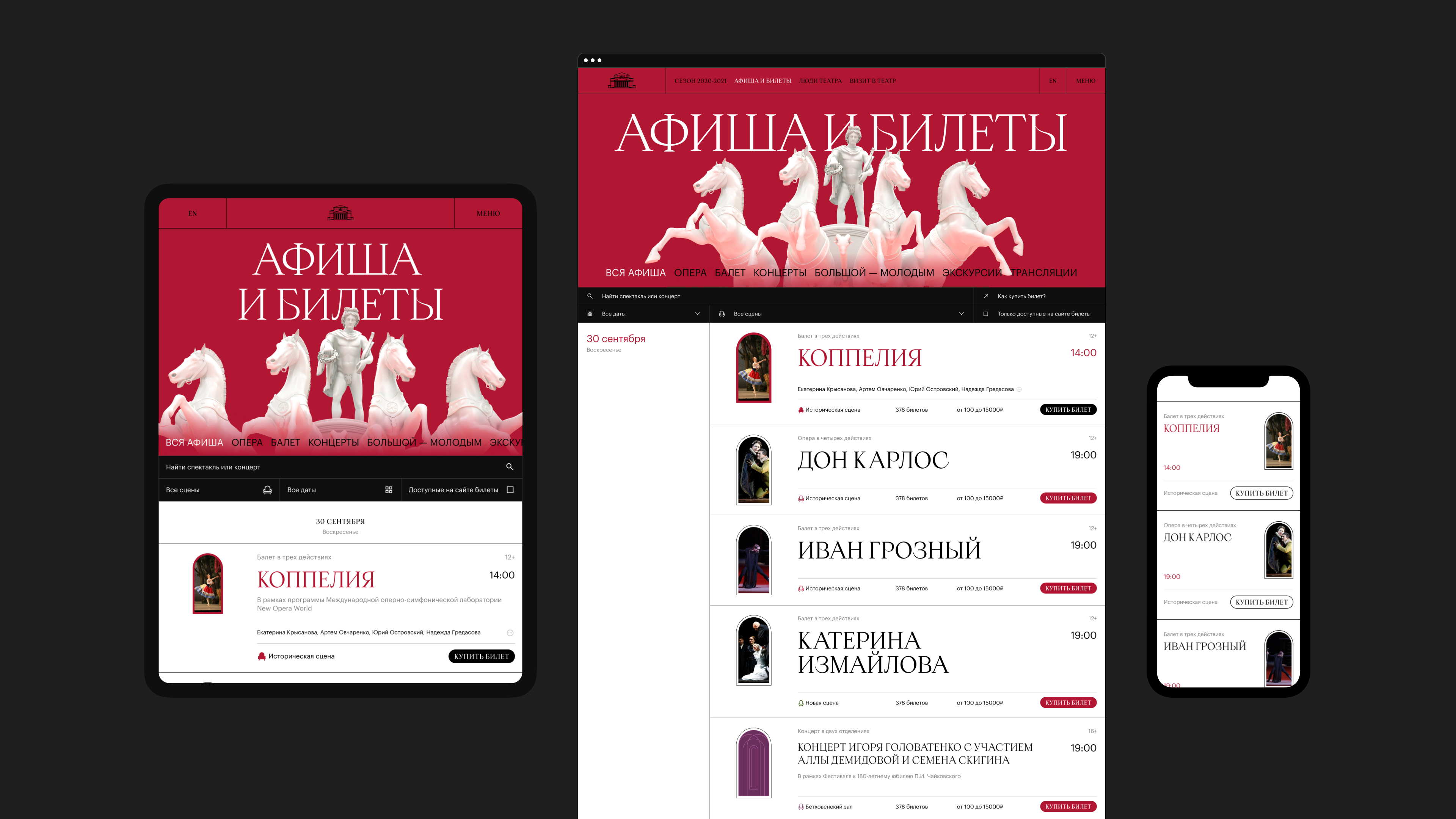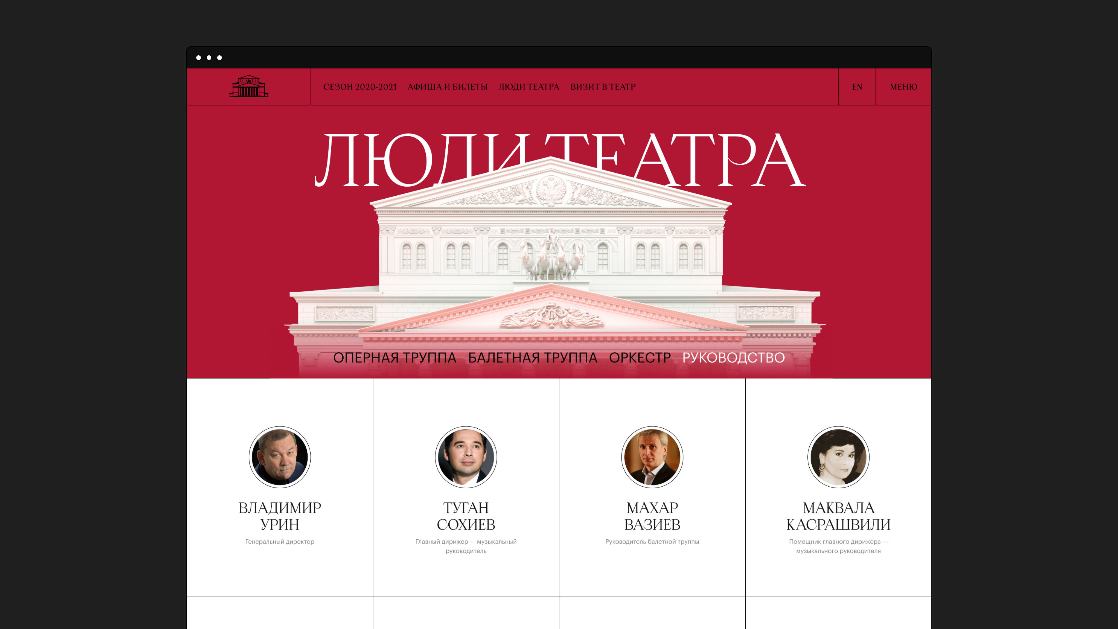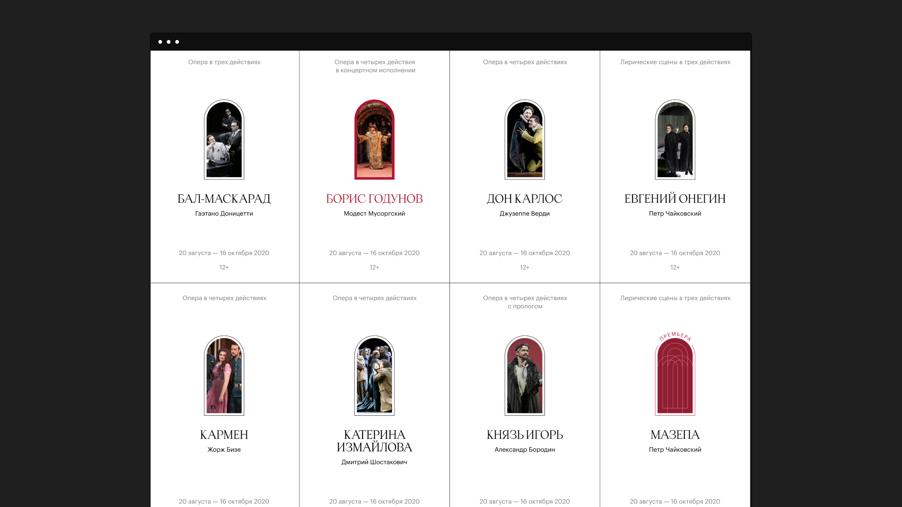 We were targeting a rather wide audience — both people over the age of 60 who go to the theatre regularly, and really young people who can get there through a nice, user-friendly website. Therefore we were willing to look at classics from a fresh perspective. Apoc happened to be a perfect match, as it is serif — which is dictated by the Bolshoi’s architecture — but this serif is as little old-school as possible, with interesting glyphs and sharpened terminals.