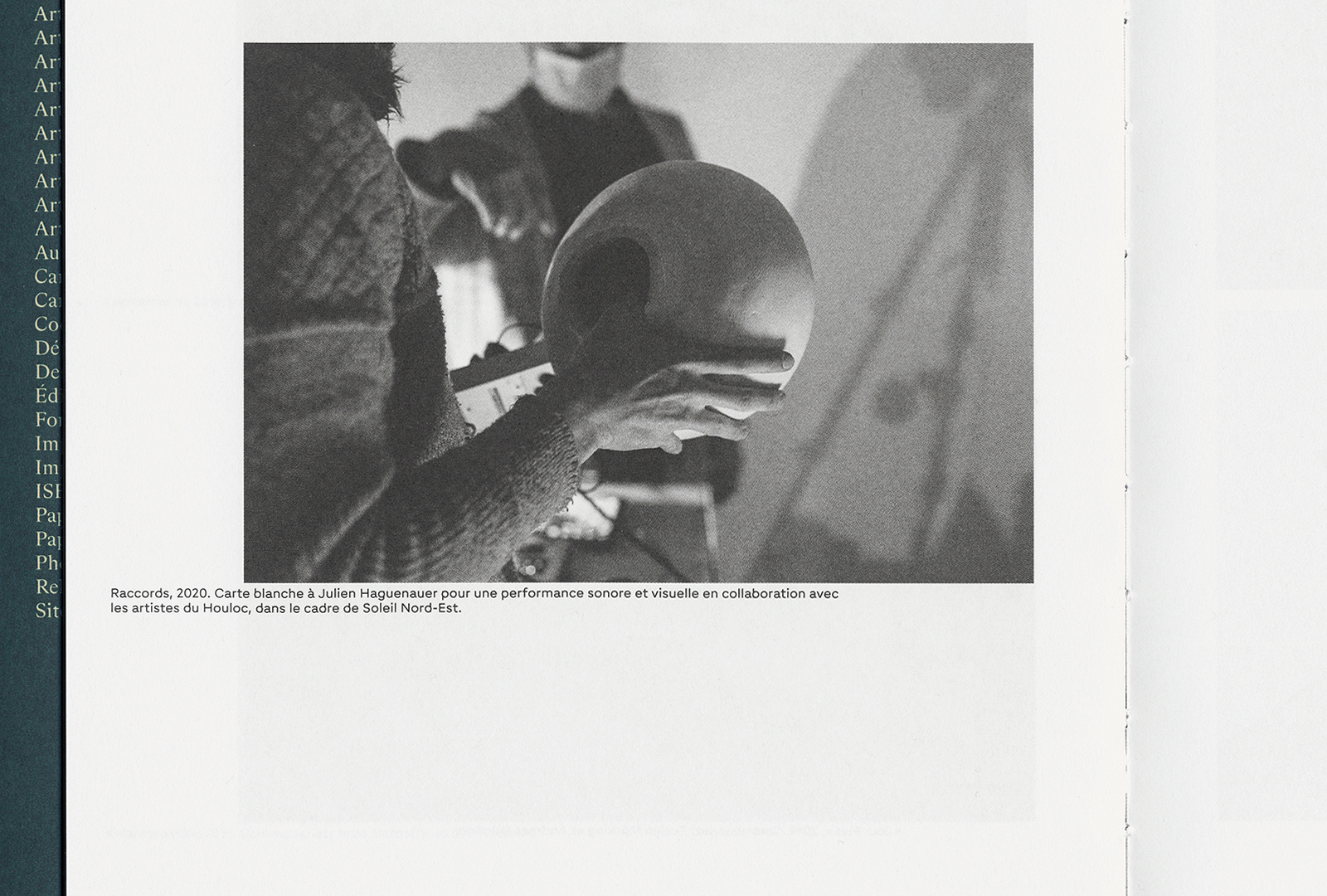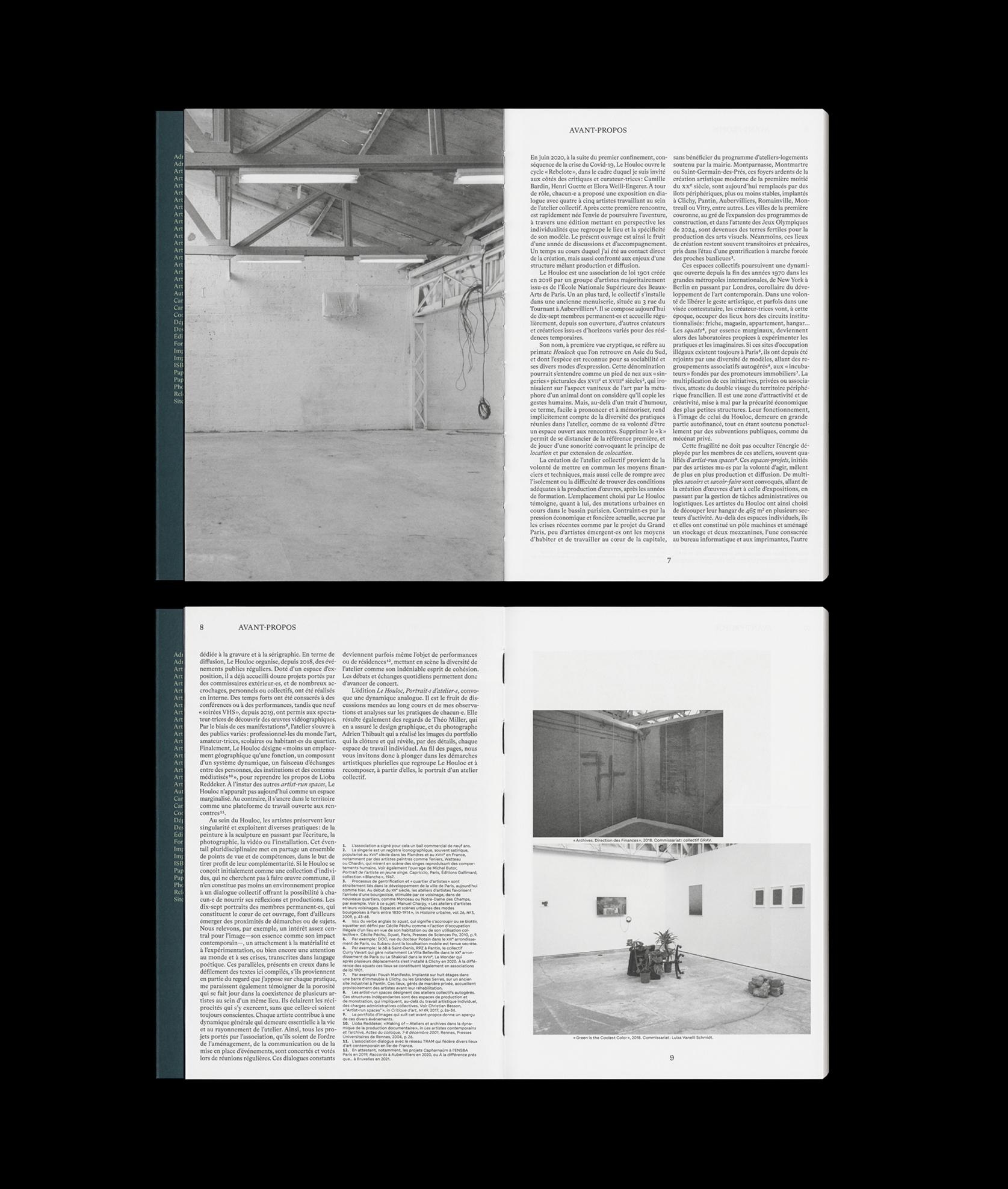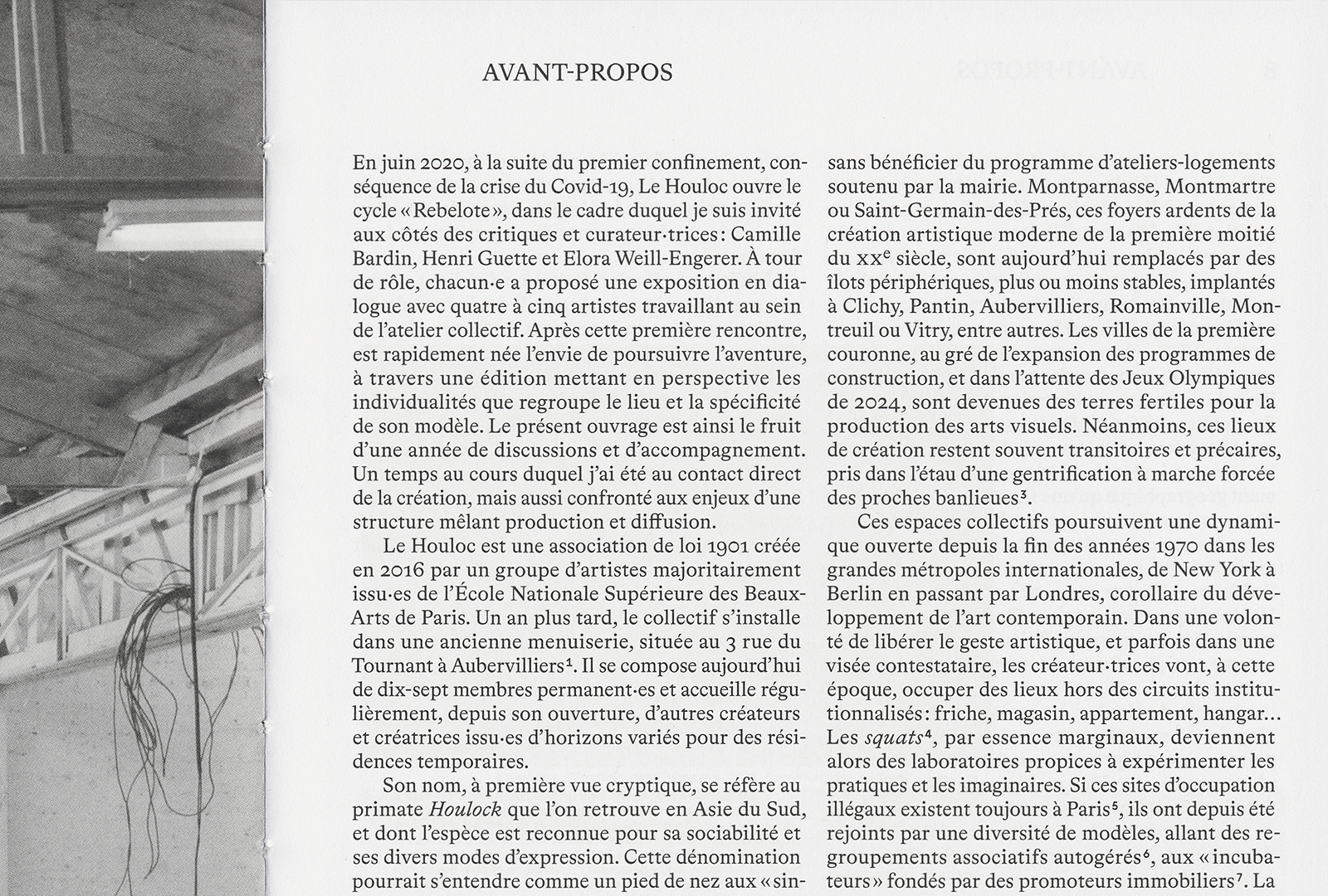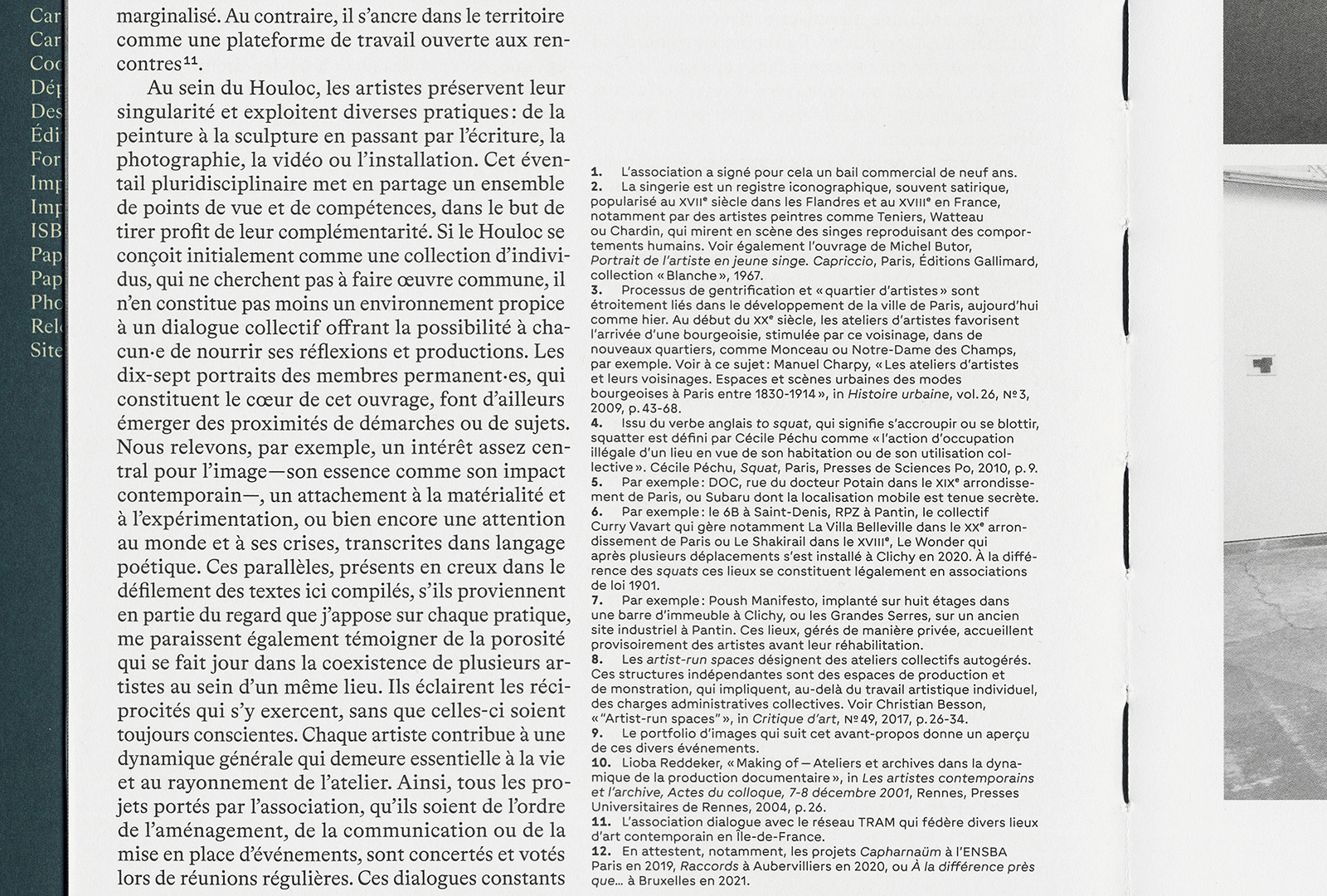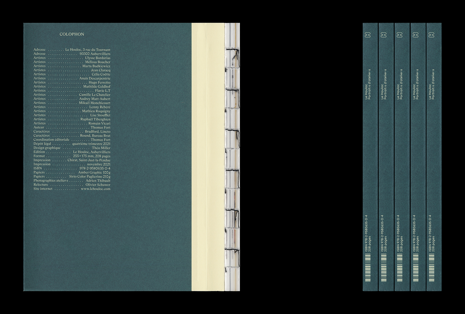 The edition Le Houloc, Portrait·s d’atelier·s, coordinated by Thomas Fort, art critic and curator, consists of texts and visuals presenting the member artists and the organisation itself. It is also the result of the work of Théo Miller, who realized the graphic design, and the photographer Adrien Thibault, who produced the images from the closing portfolio that unfolds, through details, each individual workspace. Preceded by a foreword about the challenges of a collective workshop in contemporary art, the works of the seventeen artists are presented in such a way as to meet on the first and last double-pages of each portrait, in reference to the proximity of the different workspaces in the workshop. Body text and subtitles are set in LL Bradford (Laurenz Brunner, Lineto) paired with Round (Bureau Brut) for headlines, captions and footnotes. 175×255 mm, 208 pages, December 2021.