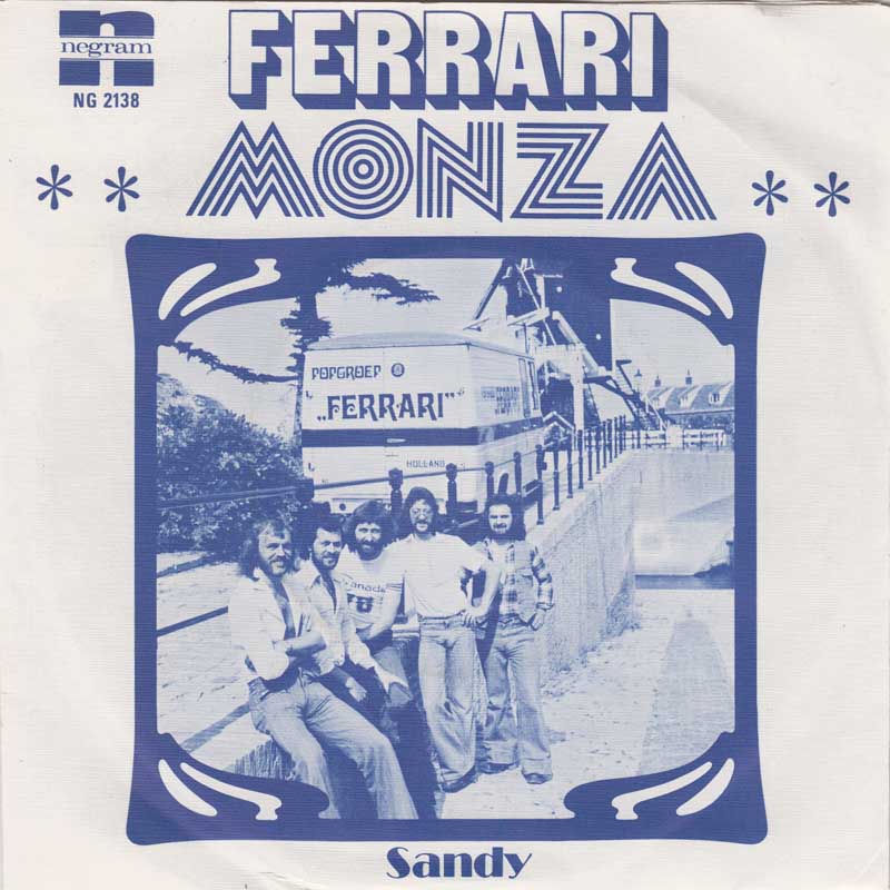 Sans Serif Shaded and Neo Prisma for the cover of a 1976 single by Ferrari, a Dutch pop group from Heusden, Brabant. The title of the B-side is added in Broadway. The monochrome sleeve shows a photo of the five men standing in front of the tour bus, which features lettering in Davida.