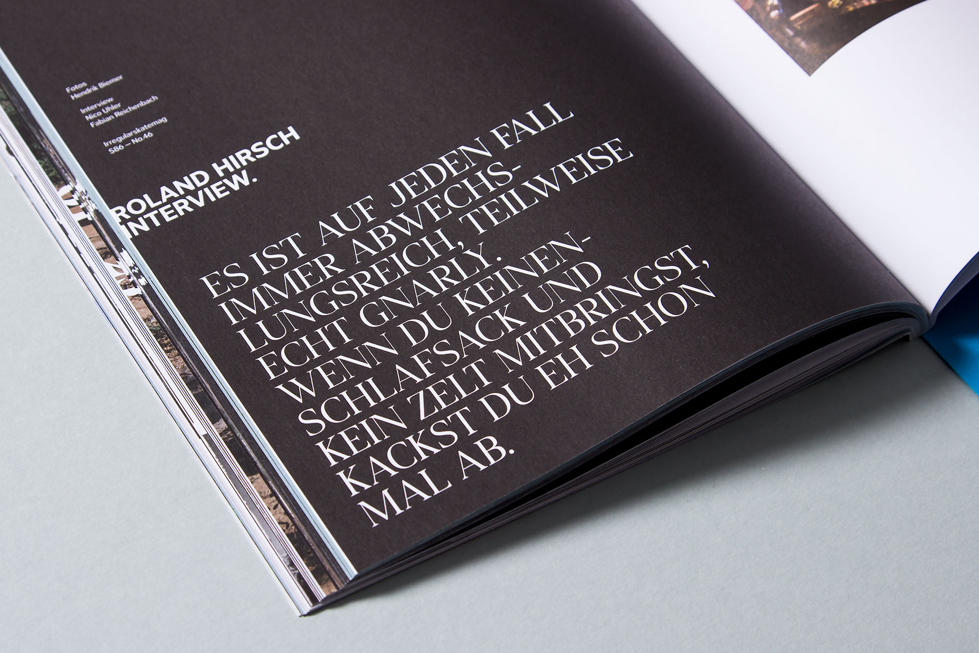 Art director Stefan Gottwald chose a combination of typeface families Spitzkant and Ardena by Julien Fincker for this year’s issues. The typefaces are combined in very different and playful ways for headlines and body text. Each article gets its own look and feel, in a very modern and high-class way.