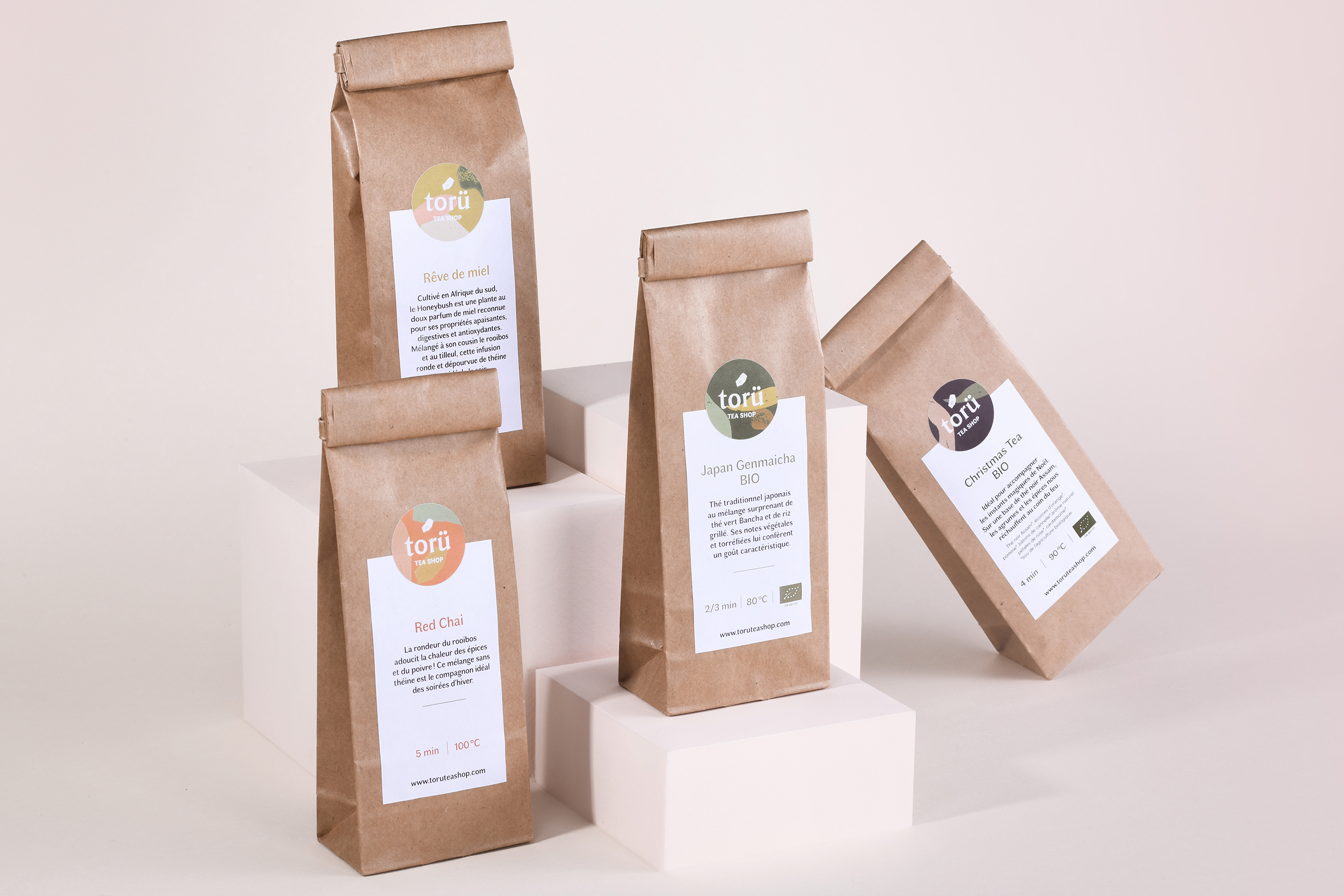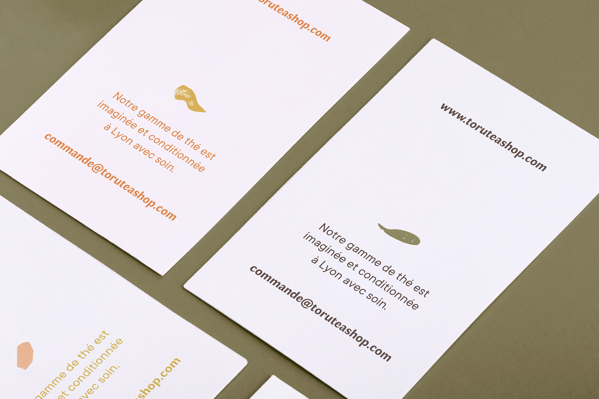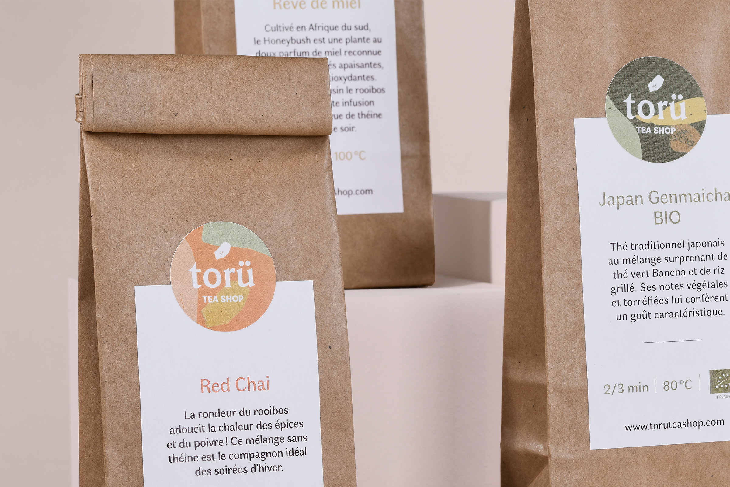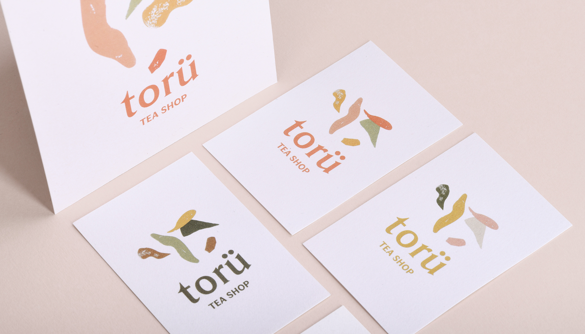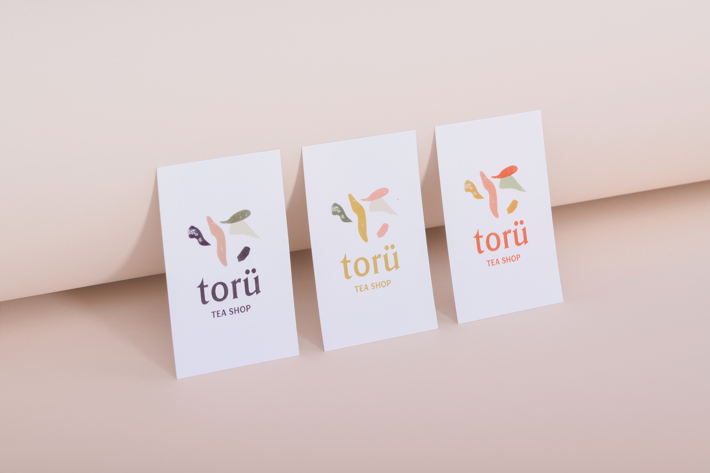 We created the graphic identity of Torü tea shop around tea leaves that we drew and then printed in linocut. We have combined these raw material tea fragments with the elegant Faune and Tongari, a typeface inspired by Japanese culture. The logo is available in two more or less complex versions and adapts its colors to the seasons.