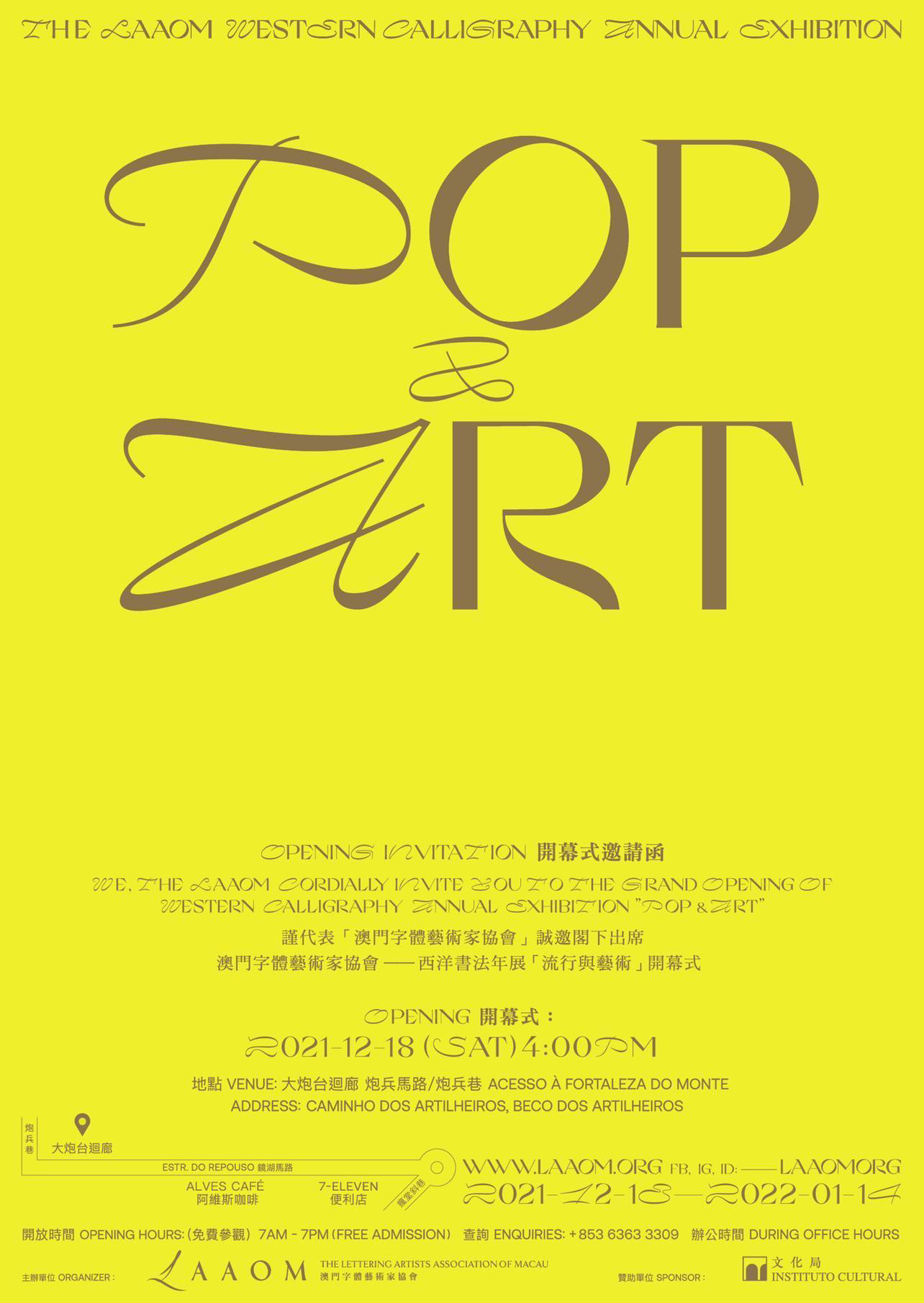 The Lettering Artists Association of Macau (LAAOM) organized a stunning exhibition with the theme “Pop & Art”. Sponsored by the Cultural Affairs Bureau of the Macao SAR Government, LAAOM invited over seventeen Western calligraphy artists from Macao, Hong Kong, Mainland China, Vietnam, and Korea, showcasing over fifty artworks, with both “pop” and “traditional” concepts that have been applied to the artworks, using calligraphy as the medium.