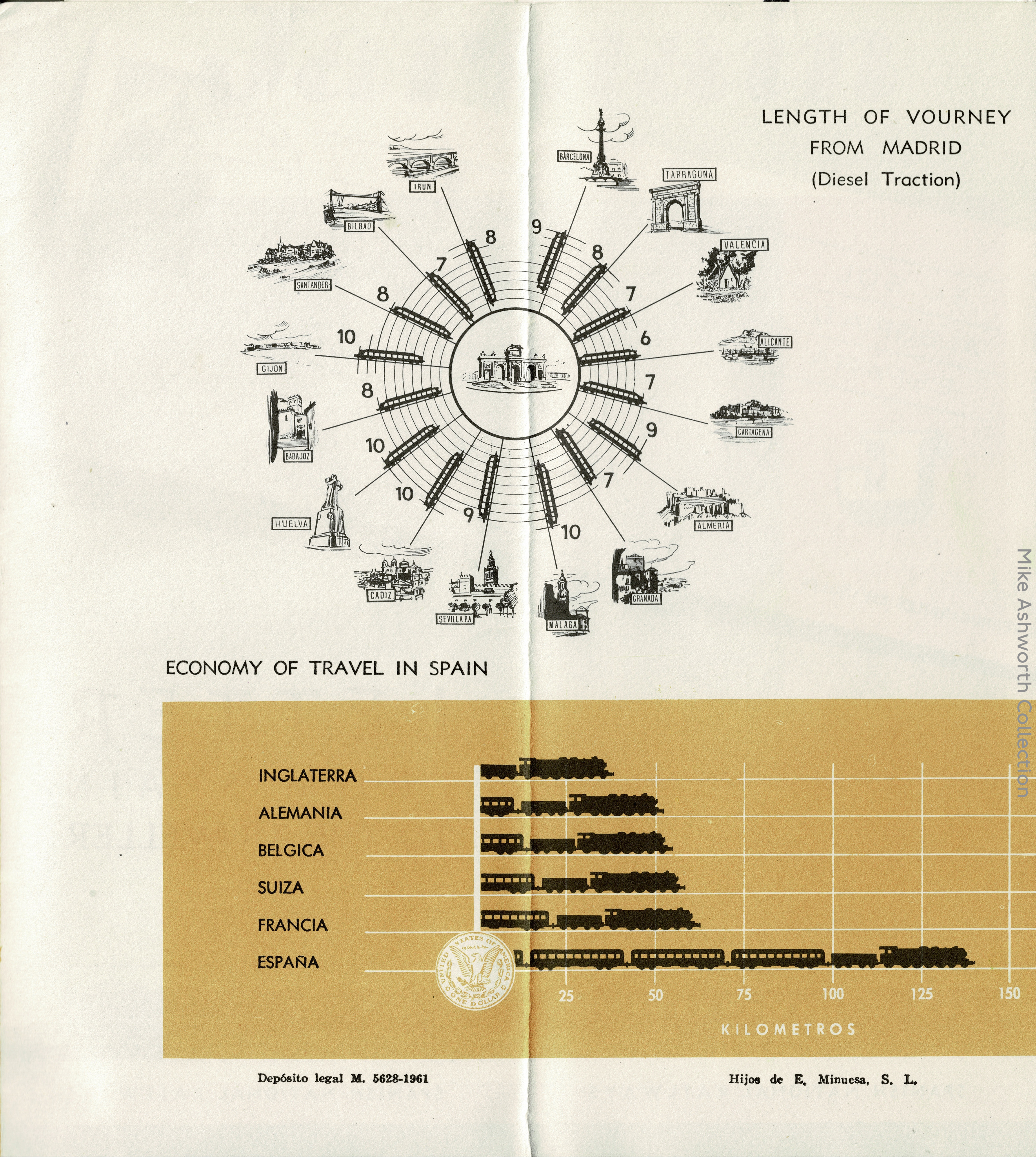 A fine English language brochure issued by RENFE – Red Nacional de los Ferrocarriles Españoles – the Spanish National Railways and advertising RENFE train services within Spain as well as international services, thus connectivity with other European countries and destinations. Dated 1961 this appears to be especially aimed at the North American market and came at a time with the Francoist government was making serious attempts to market Spain as a holiday destination as part of a determined effort to stimulate the country’s economy after years of post-Civil War austerity and autarky.