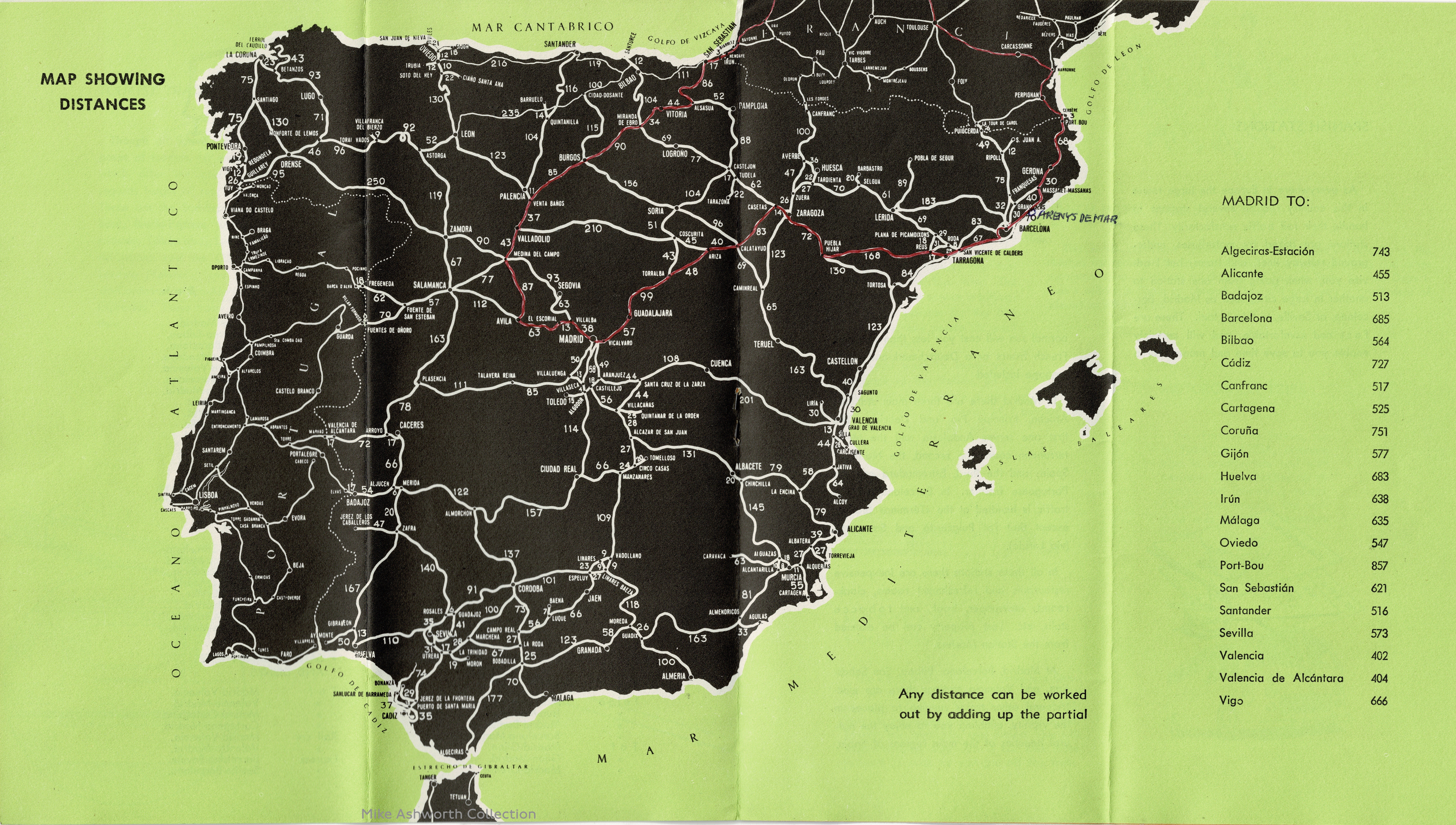 The cover takes the form of a letter, complete with Spanish Correos postage stamp and franking, along with a device RENFE seem to have used for various publications – the outline of an electric locomotive hauling a train. As well as information on RENFE service, at stations and on trains, the brochure has several maps and diagrams including ones showing timings, by diesel trains, from Madrid to the various provincial centres with timings that now, in the age of AVE, show how rail journeys in Spain in earlier decades really did emphasis the size of the country.