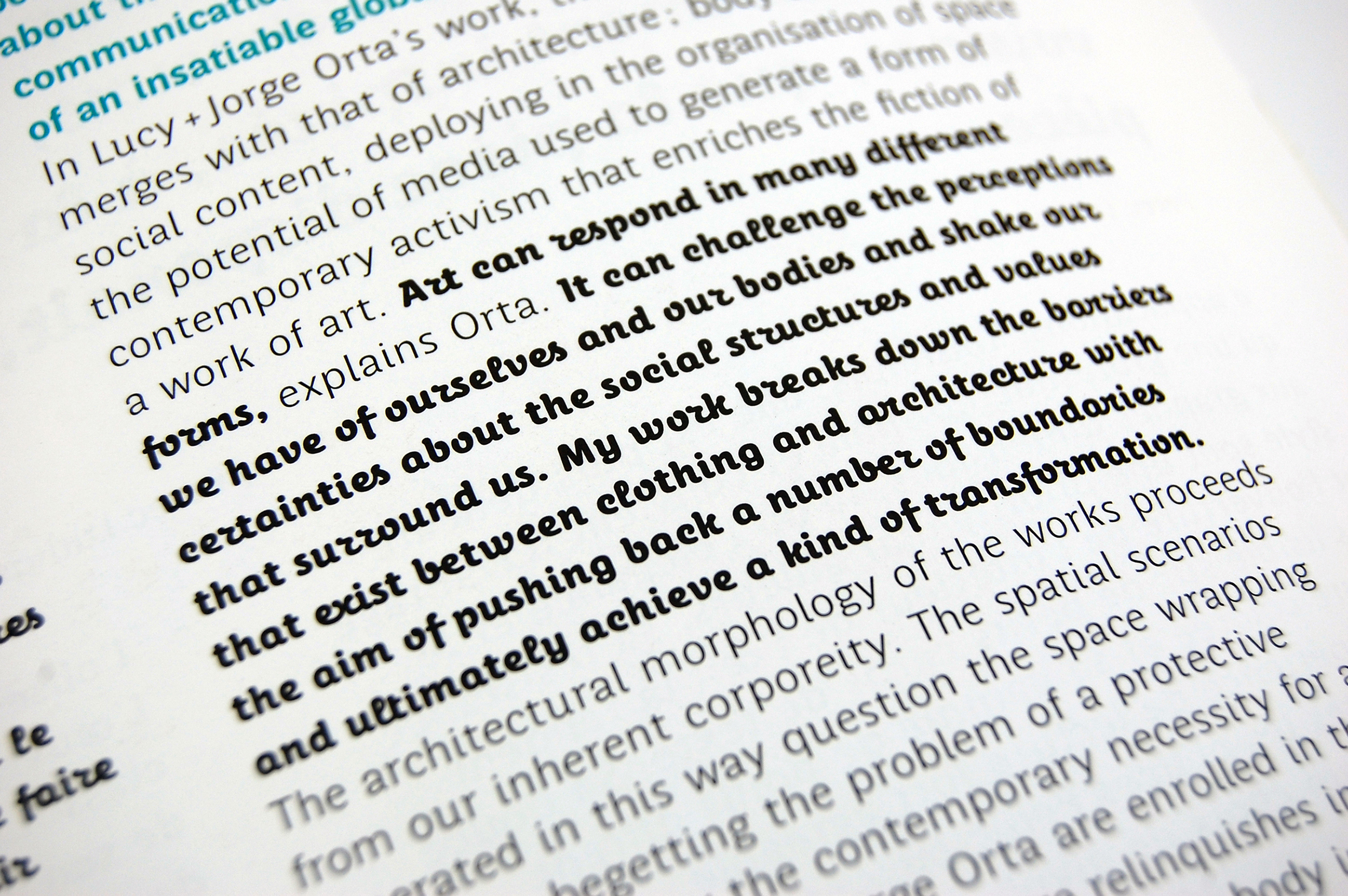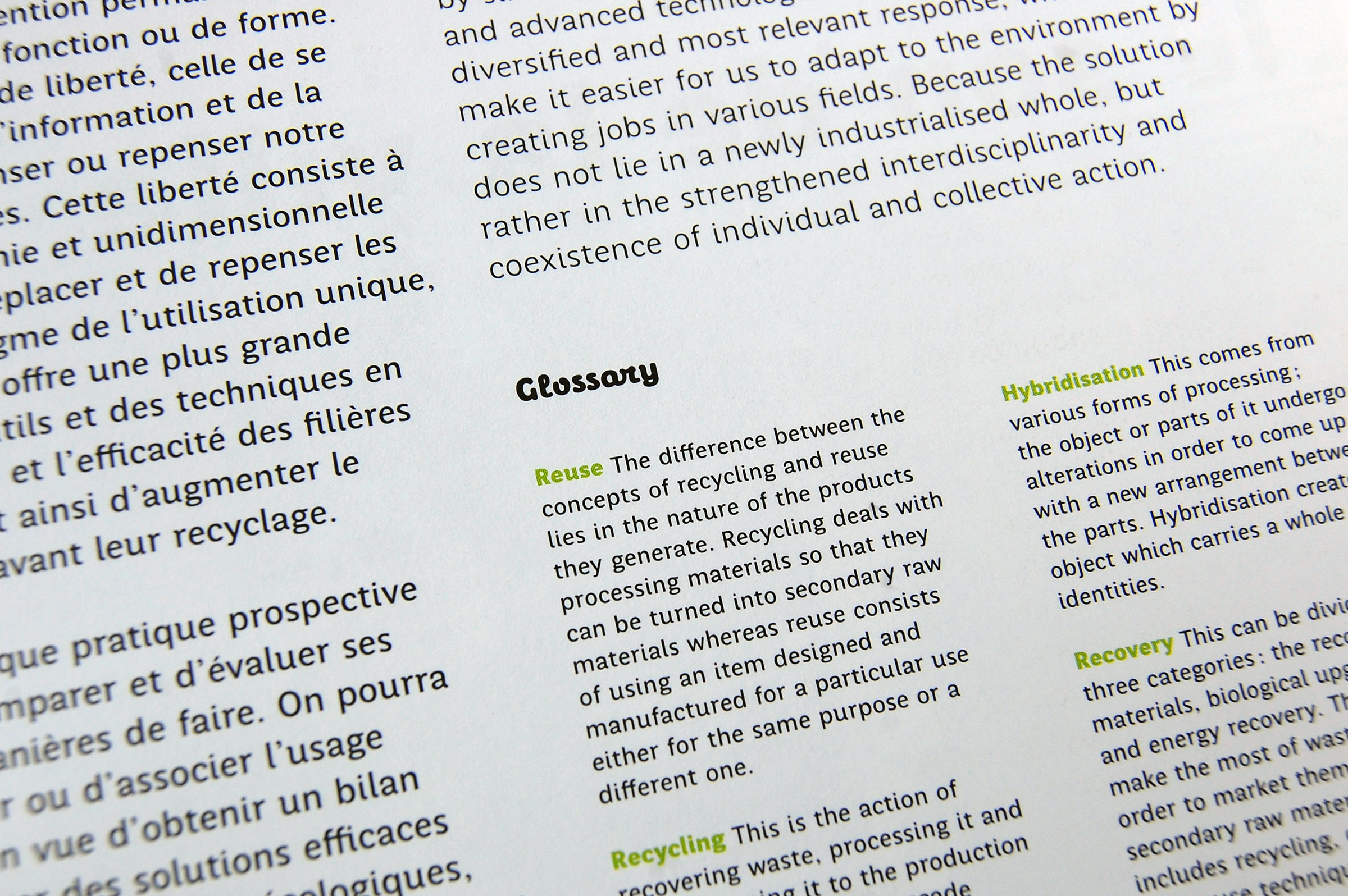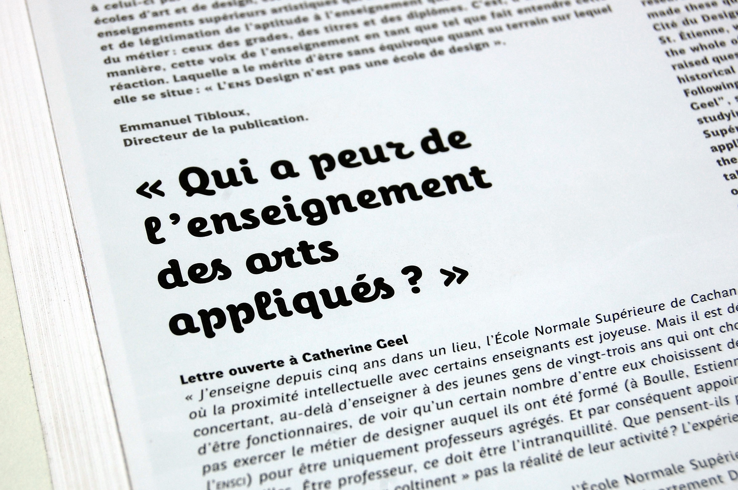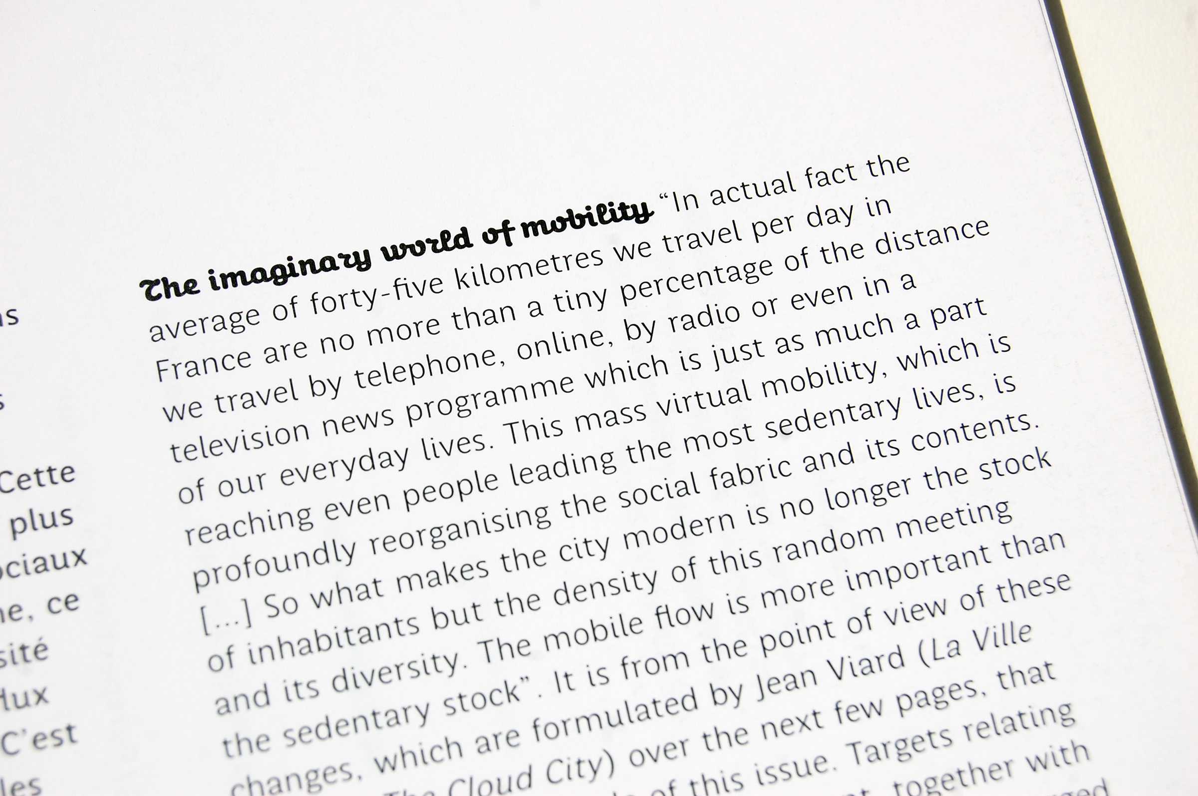 Issue 34 of the Azimuts design magazine made at the École supérieure d’art et design de Saint Étienne, France. Edited by Constance Rubini and designed by Sébastien Dégeilh and Denis Coueignoux, the publication uses all early versions of the Perec superfamily: Perec, Perec Ludique, and Perec Scripte (all from PampaType).