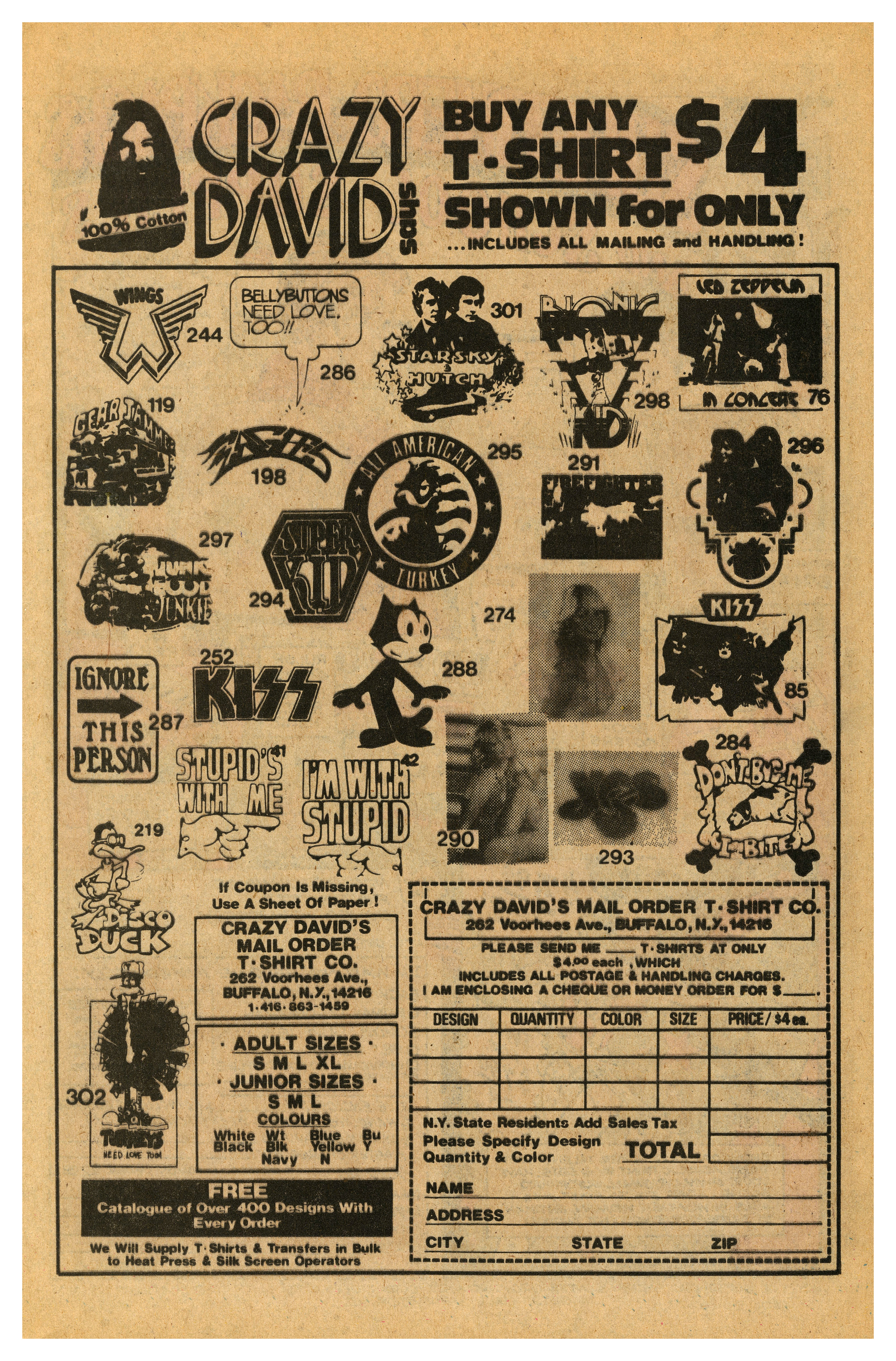 Ad for Crazy David’s Mail Order T-Shirt Co., by the company’s outlet in Buffalo, New York, featuring Premier Shaded with both its forms for A.