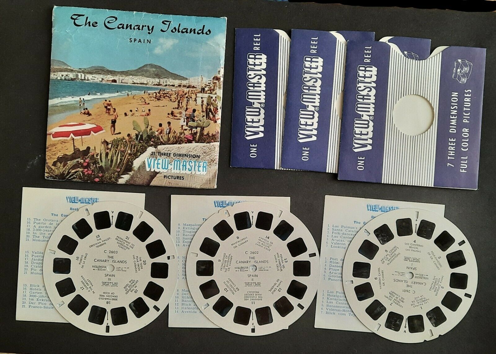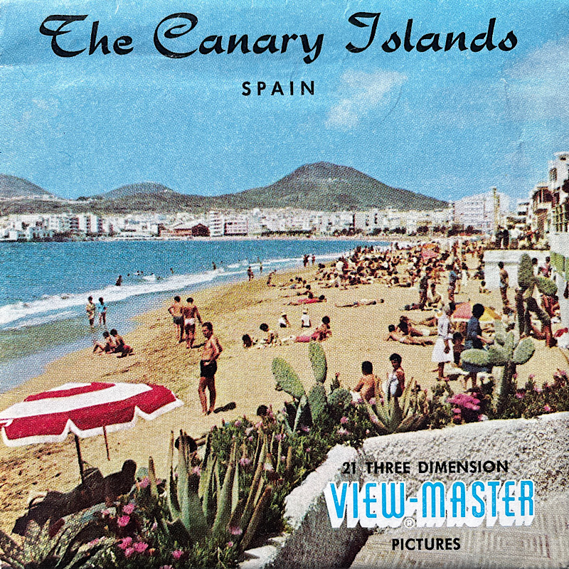 This isn’t a record cover, as one might suspect. it’s rather a sleeve holding three reels with a total of 21 three dimension pictures of the Canary Islands, to be viewed in the View-Master. From Wikipedia: