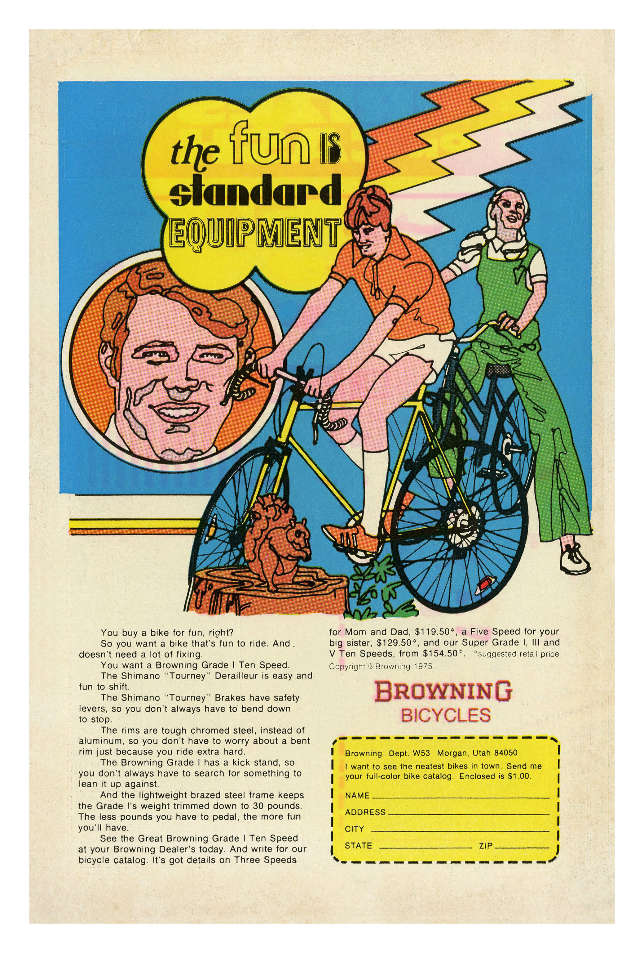 Ad by Browning Bicycles, headquartered in Morgan, Utah. Yes, that’s the same company better known for firearms and fishing gear. In the 1970s, they jumped on the bike boom and expanded their product range. See also another ad from the same year, titled “Next time I’ll hide my Browning in the bushes.” The shown ad features a random and hardly coordinated mix of “hip” typefaces: Bookman Swash Bold Italic, outlined ITC Serif Gothic, Orbit Rimmed, Monogram, and Filmotype Quail. The copy is set in Helvetica.