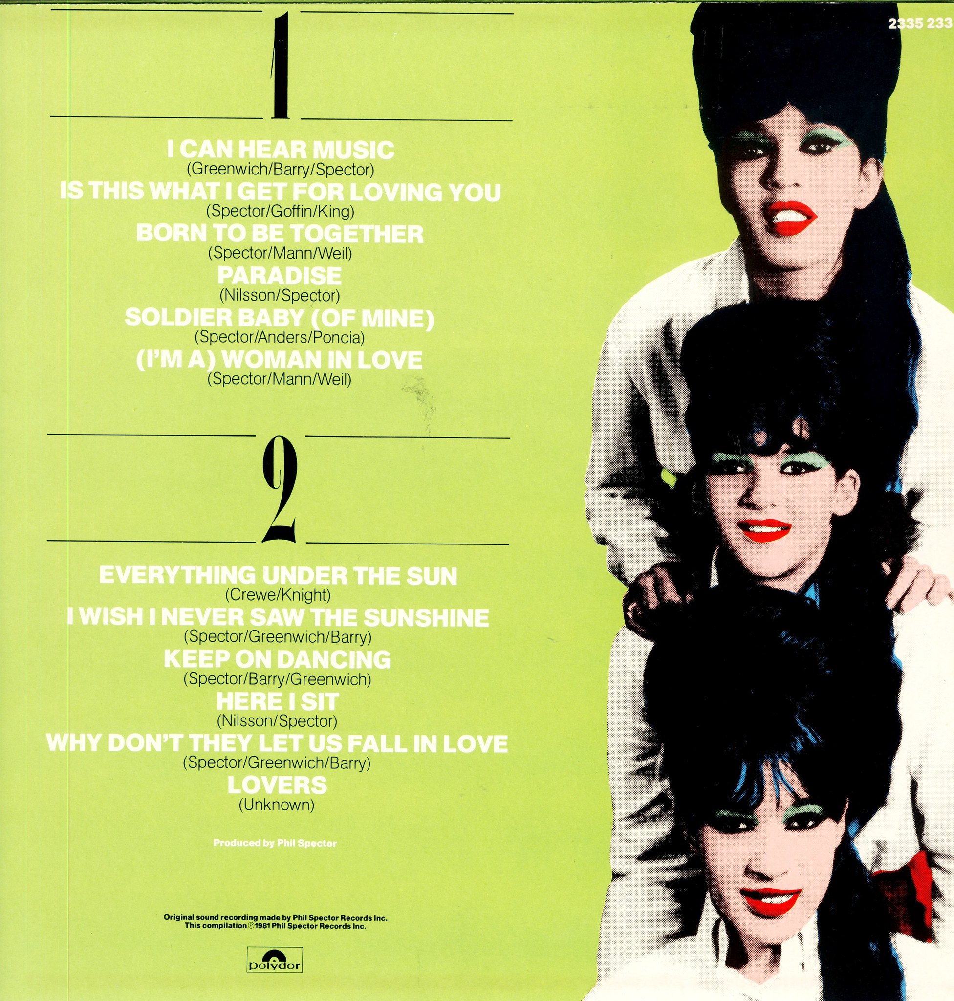 This best-of album by the Ronettes was released in 1981 as part of the 9 LP vinyl “Wall Of Sound” box set, and also sold separately. The art on the front cover is a re-colored version of the photography by Three Lions Studio that was used for the band’s first studio album from 1964, with rearranged elements.