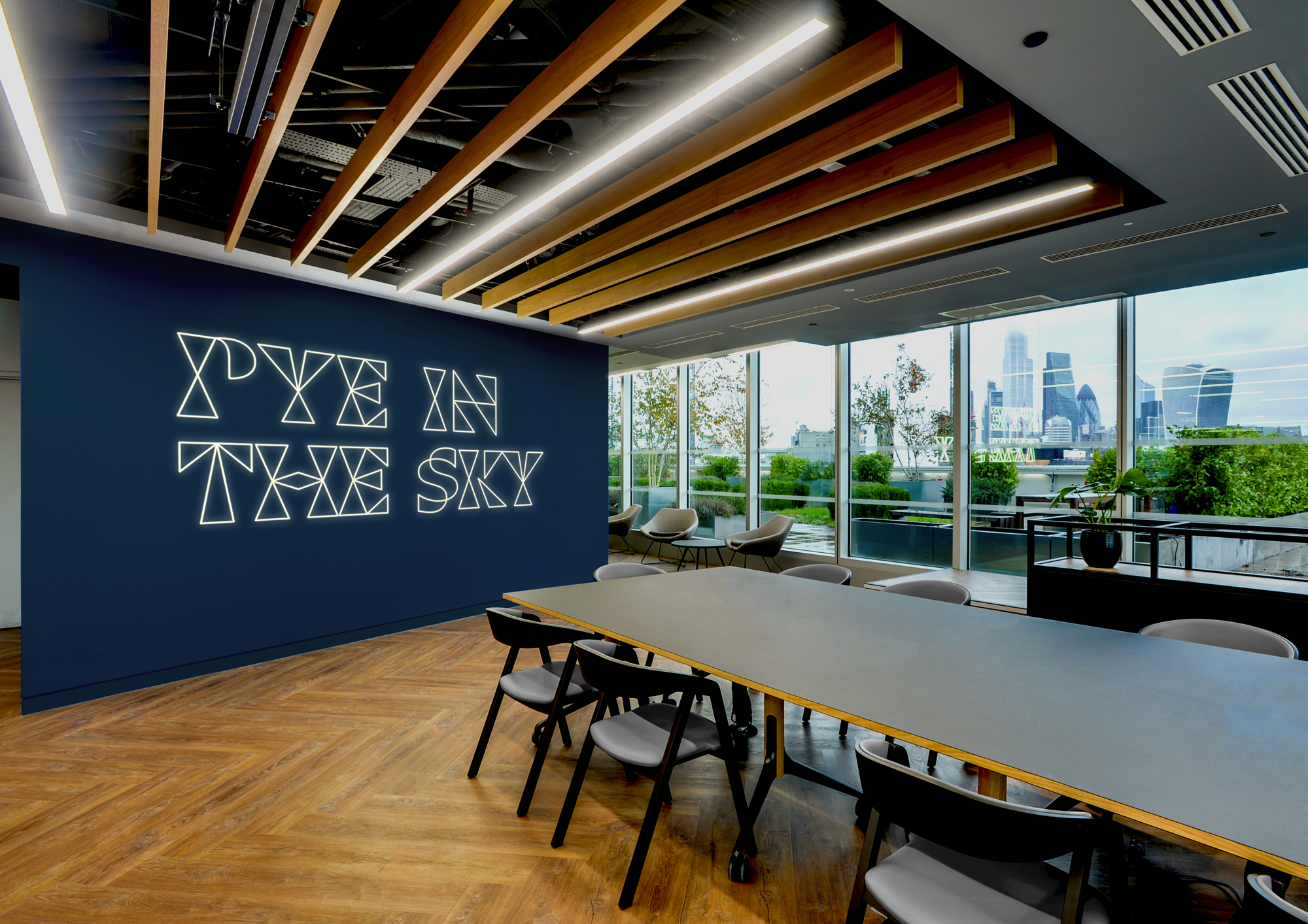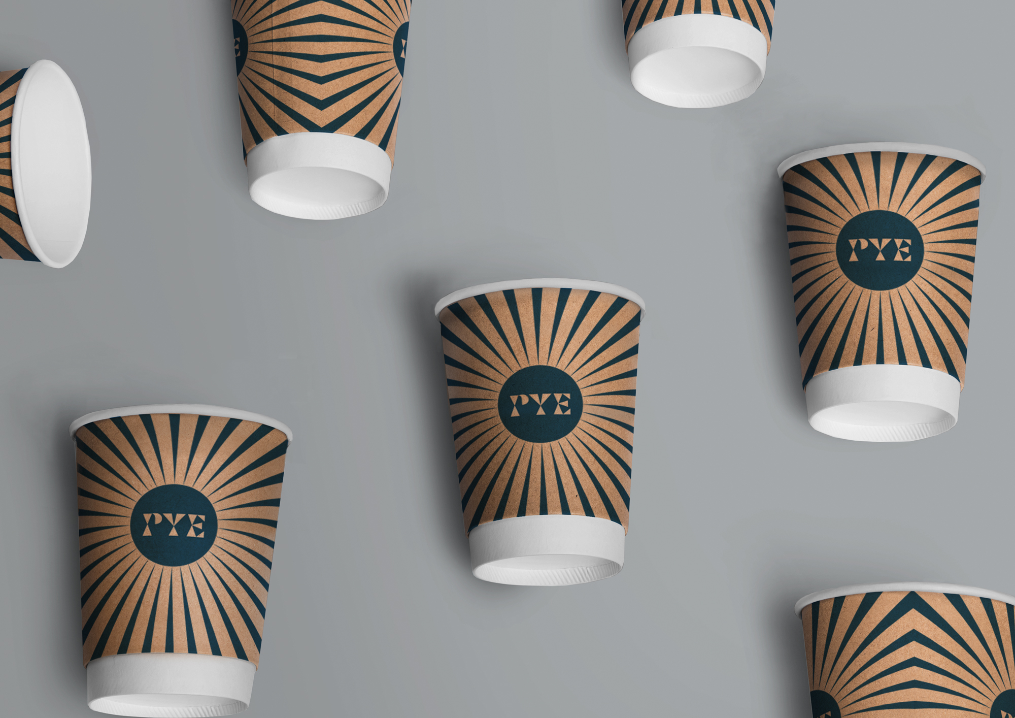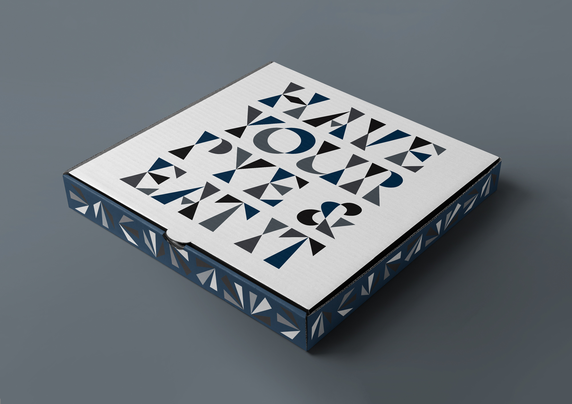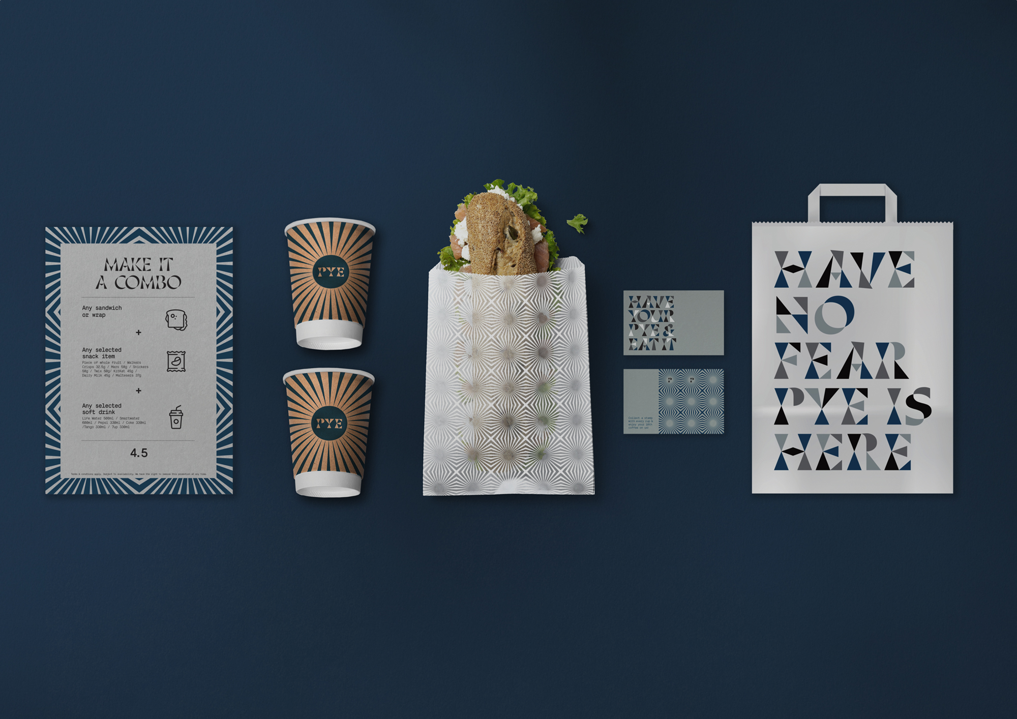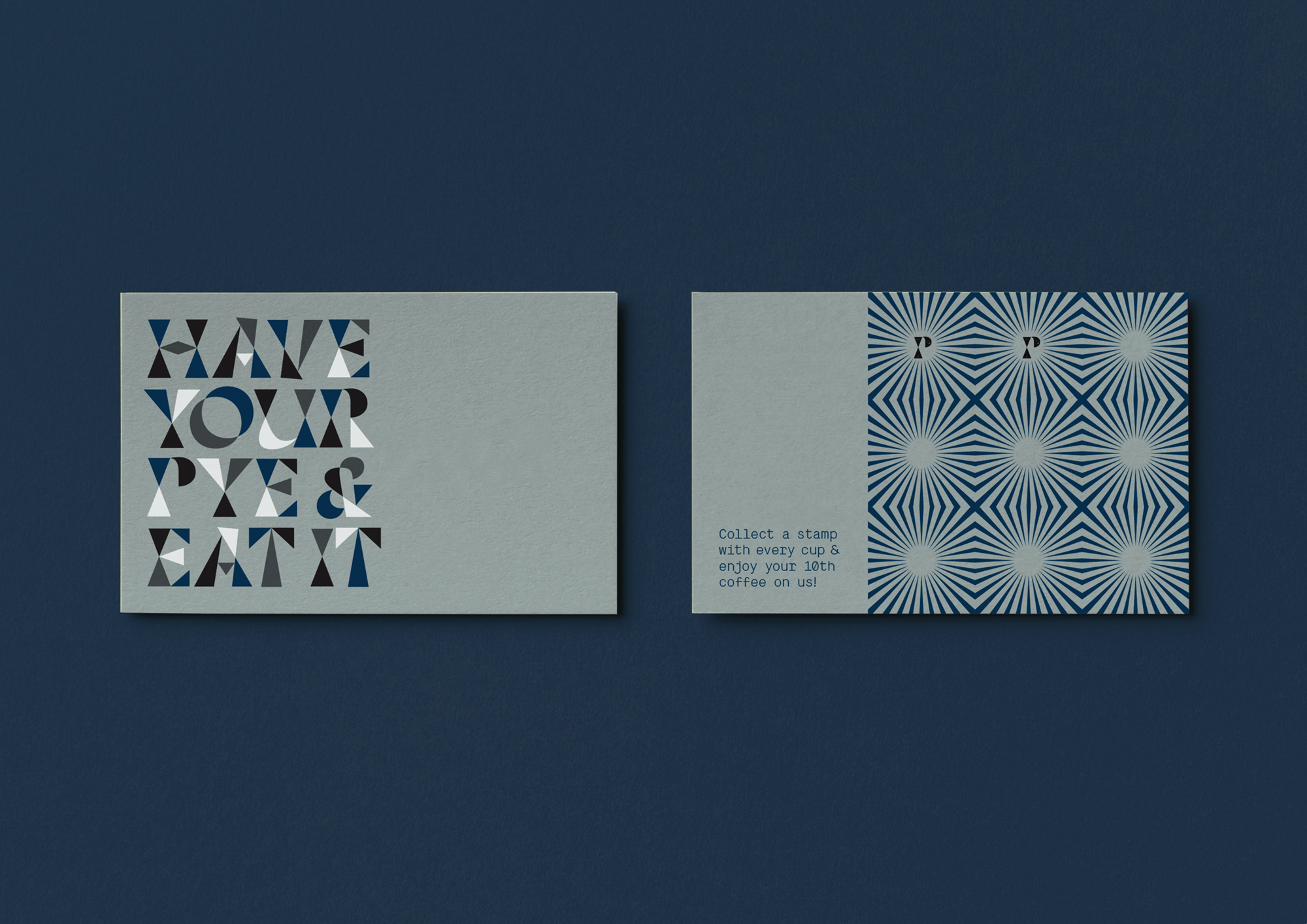 PYE is a new space for eating, working and sharing ideas located on the top floor of the Omnicom London HQ. Omnicom is one of world’s leading creative groups and its HQ buildings look to the area for the naming of its internal spaces. The former Pye Gardens situated nearby was our starting point and shaped the visual language. As Pye is old English for pie, many of the graphic elements are rooted in this visual vernacular. The main typeface is formed from intersecting triangles which convey a piece of pie. This is emphasised through mixed tones forming each character, bringing an abstract aesthetic to signage and messaging.
