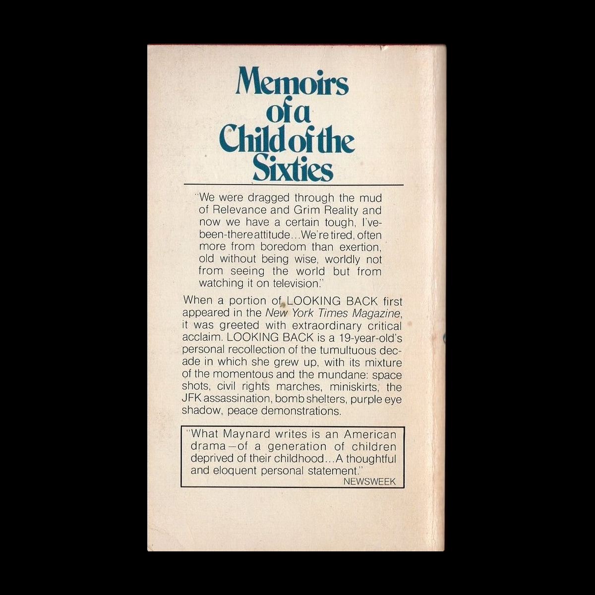 Joyce Maynard was eighteen years old when her 1972 New York Times Magazine cover story catapulted her to national prominence. Published one year later, Looking Back is her remarkable follow-up – part memoir, part cultural history, and part social critique. She wrote about diving under her desk for air-raid practice during the Cuban Missile Crisis, the Beatles’ first appearance on The Ed Sullivan Show, and catching the first glimpse (on the cover of Life magazine) of a human fetus in utero.