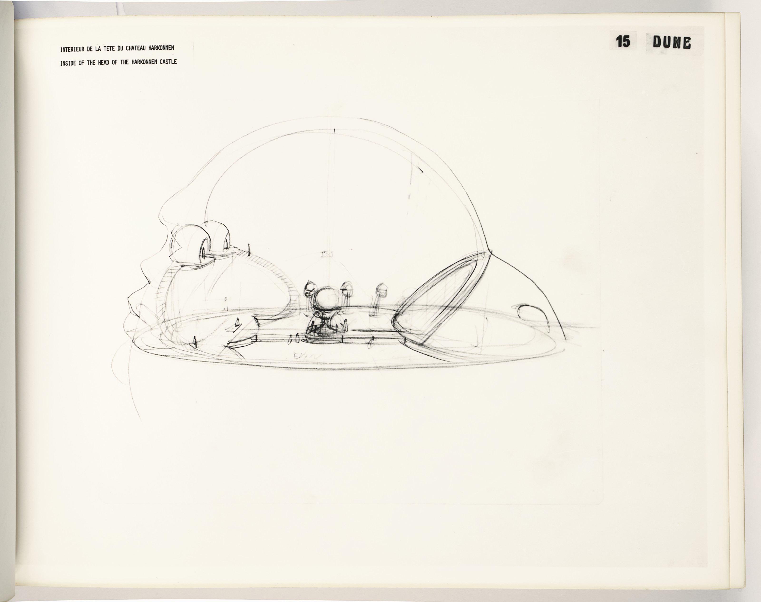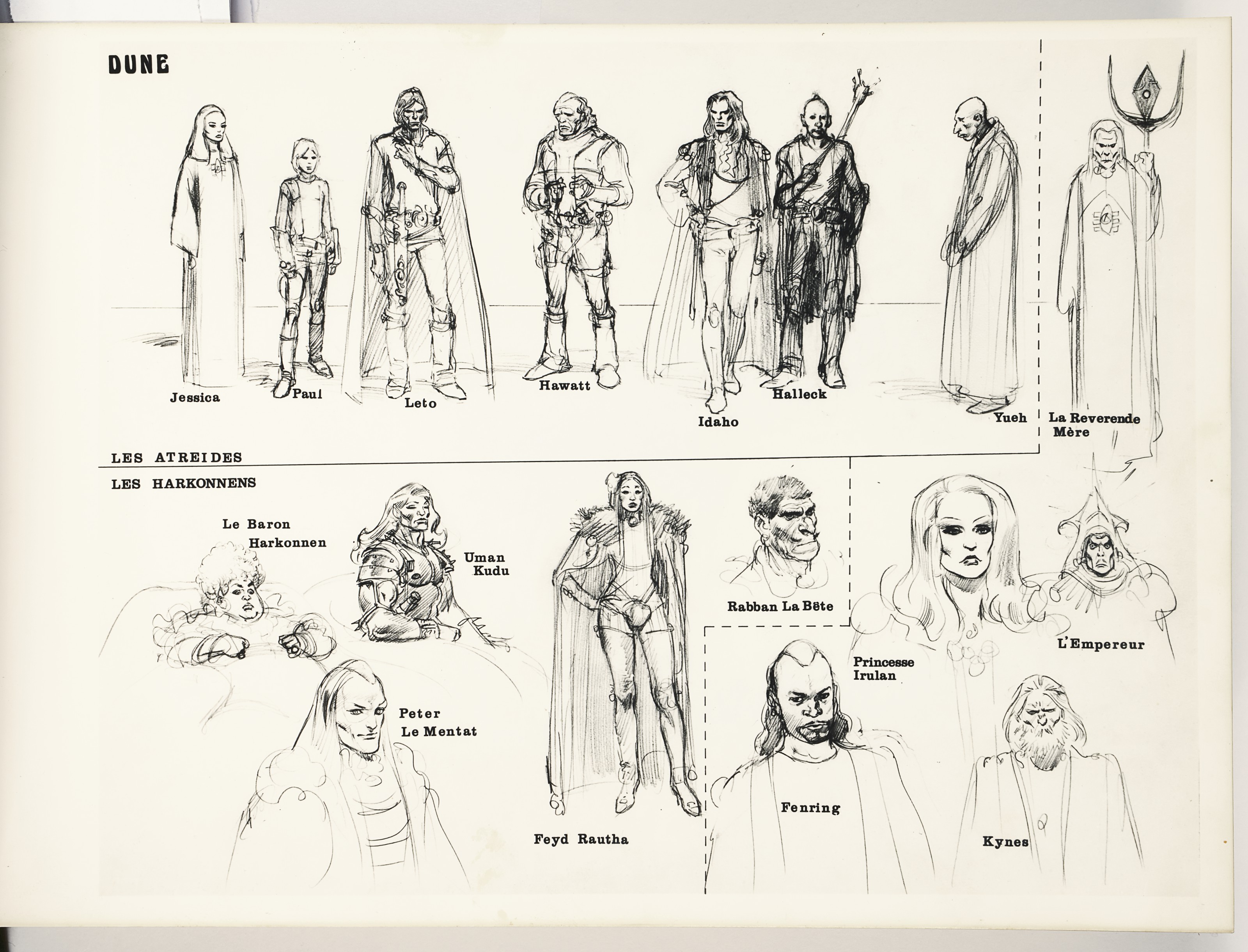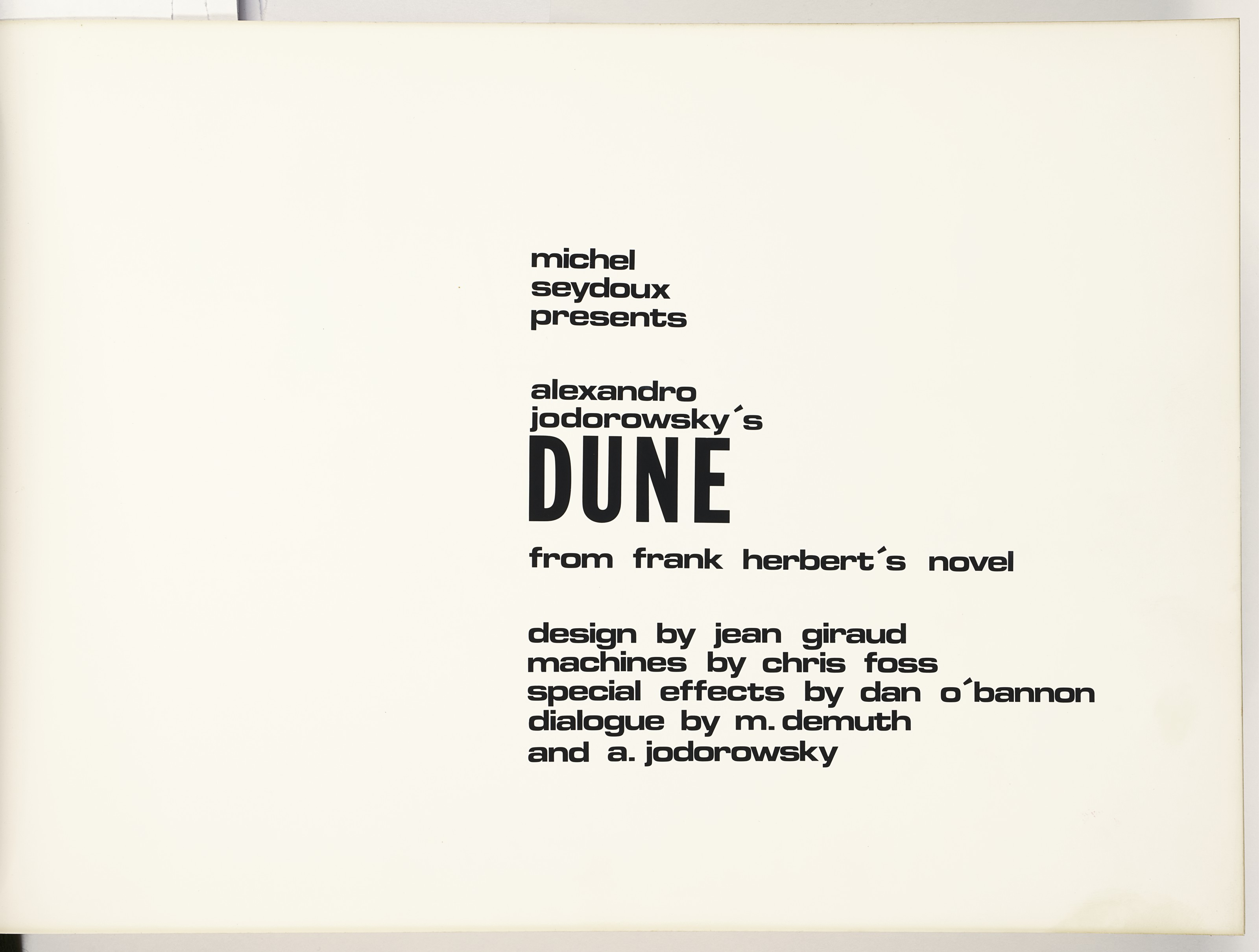 Artwork and design for the book was done by Jean Giraud, a French artist better known as Moebius. The cover aligns Futura with a colorful ship mid-space – It’s Guild Tug by Chris Foss. The title page of the storyboard features all-lowercase Eurostile Bold Extended, tightly spaced, with “DUNE” in Franklin Gothic Condensed. Artist pages lack typography, but character designs are in a Clarendon. The bilingual captions seem to be written on an IBM typewriter using Orator. Last but not least, running titles were added in Herkules.