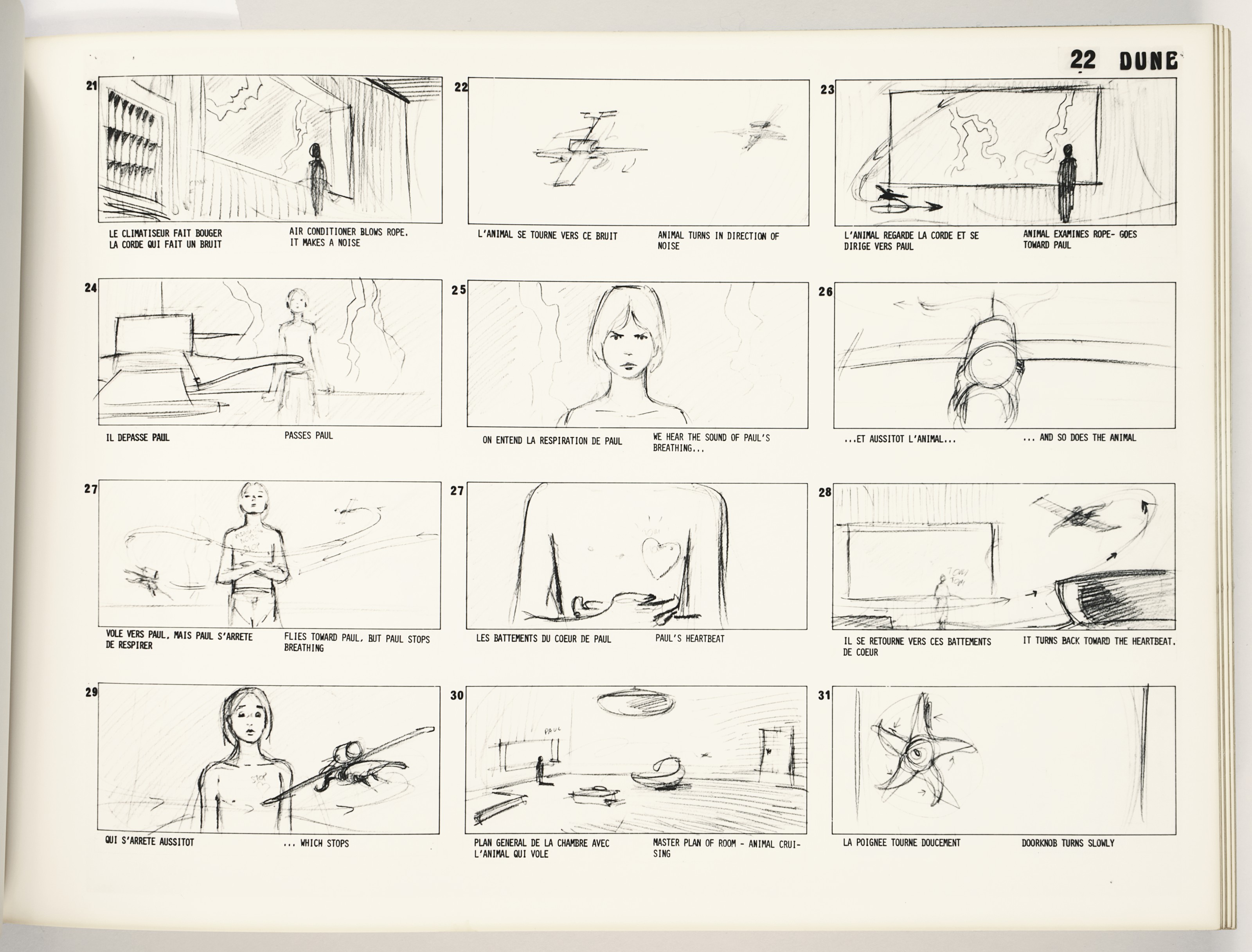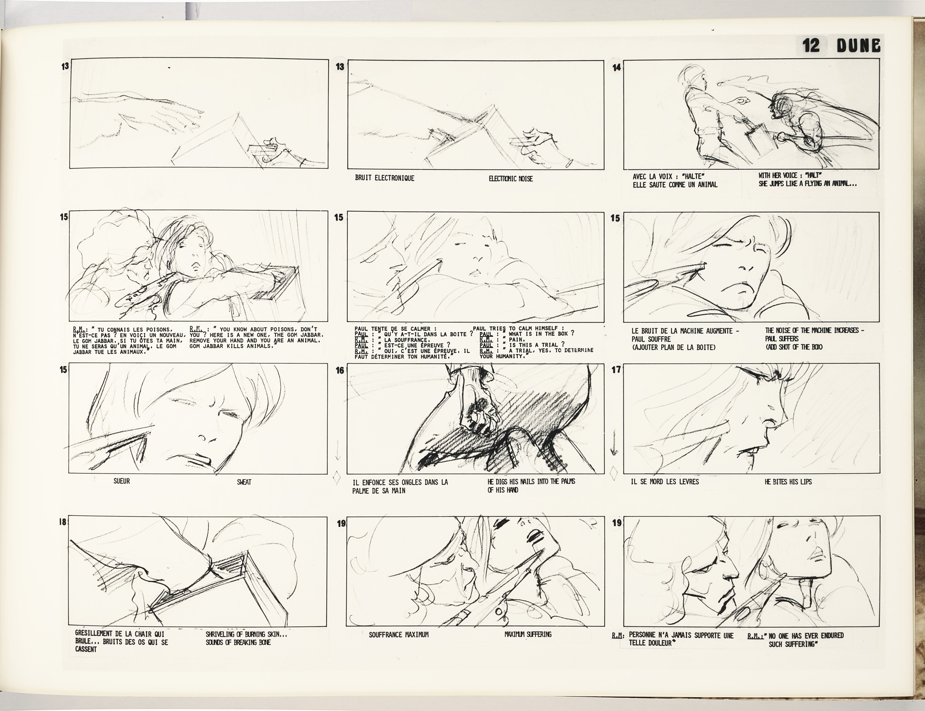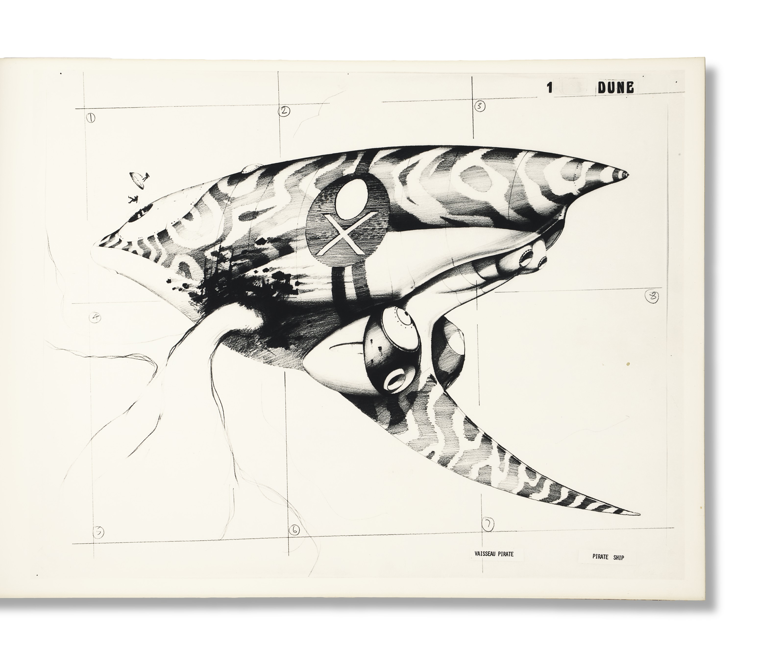 Artwork and design for the book was done by Jean Giraud, a French artist better known as Moebius. The cover aligns Futura with a colorful ship mid-space – It’s Guild Tug by Chris Foss. The title page of the storyboard features all-lowercase Eurostile Bold Extended, tightly spaced, with “DUNE” in Franklin Gothic Condensed. Artist pages lack typography, but character designs are in a Clarendon. The bilingual captions seem to be written on an IBM typewriter using Orator. Last but not least, running titles were added in Herkules.