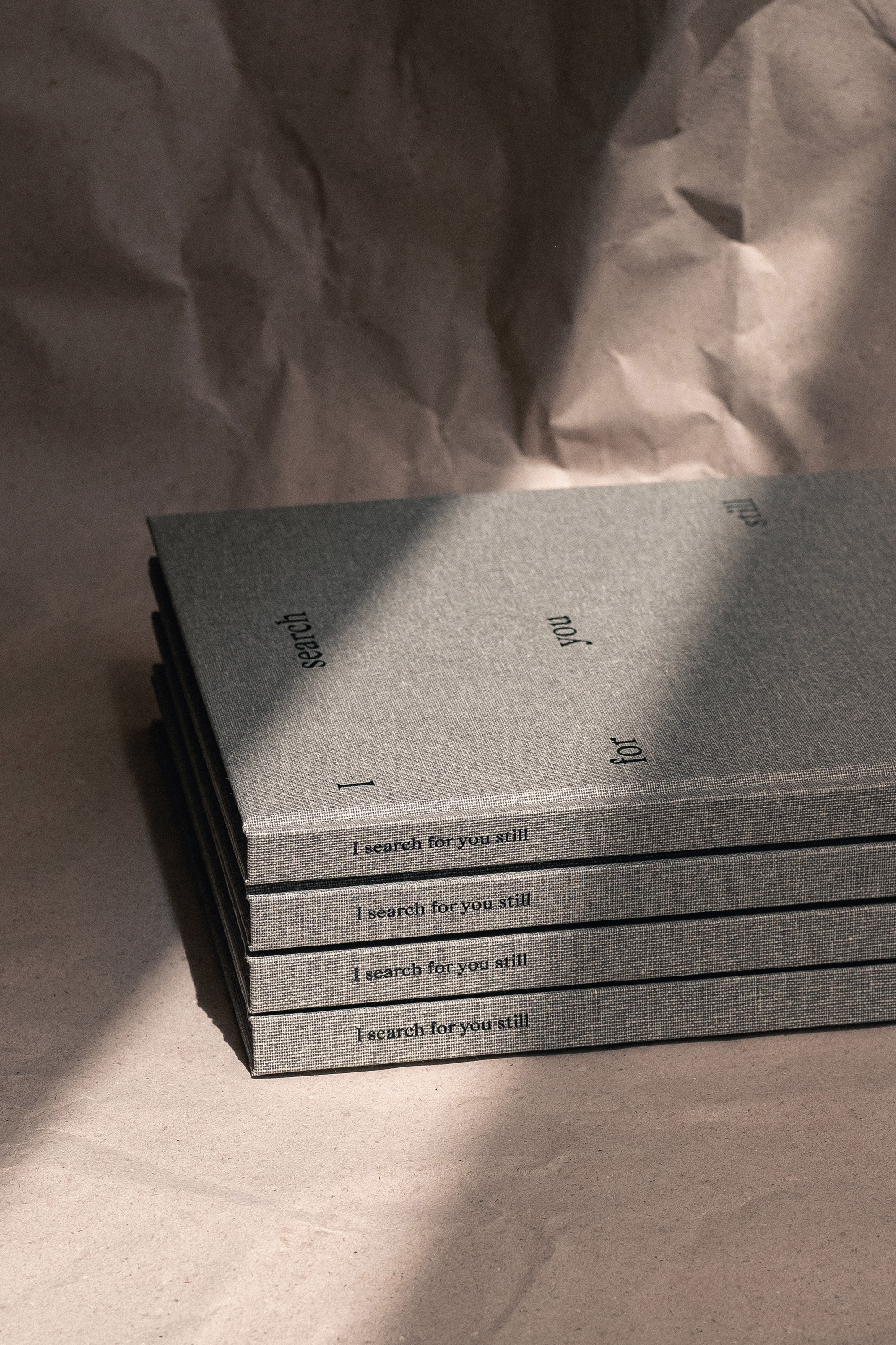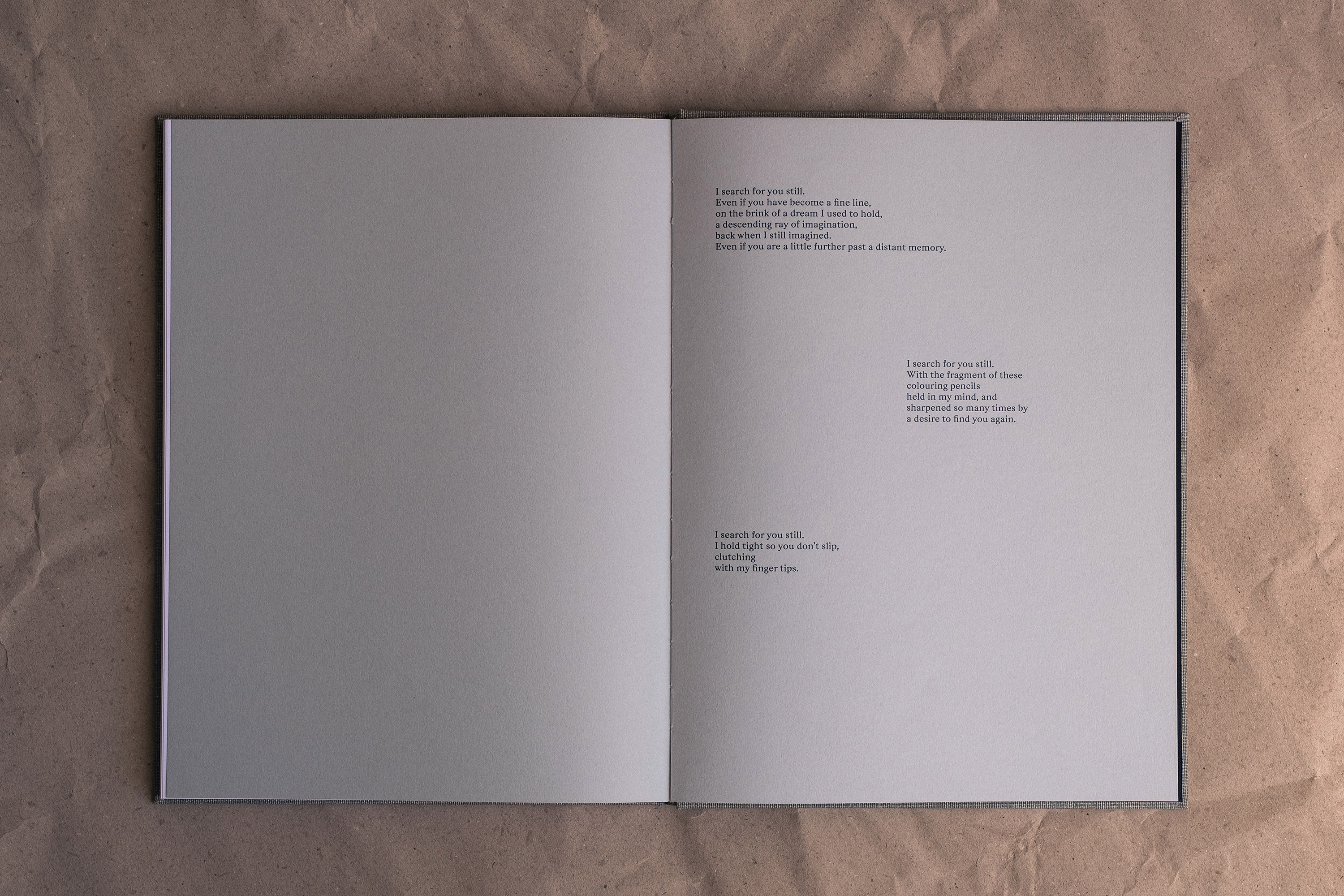 The cover is bound by a linen cloth with foiled type, to bring tactility to the reading experience. A loose and detached typographic structure alludes to a sense of wandering and discovery, mimicking the narrative sequence of the photographs. The book is set in Gza.