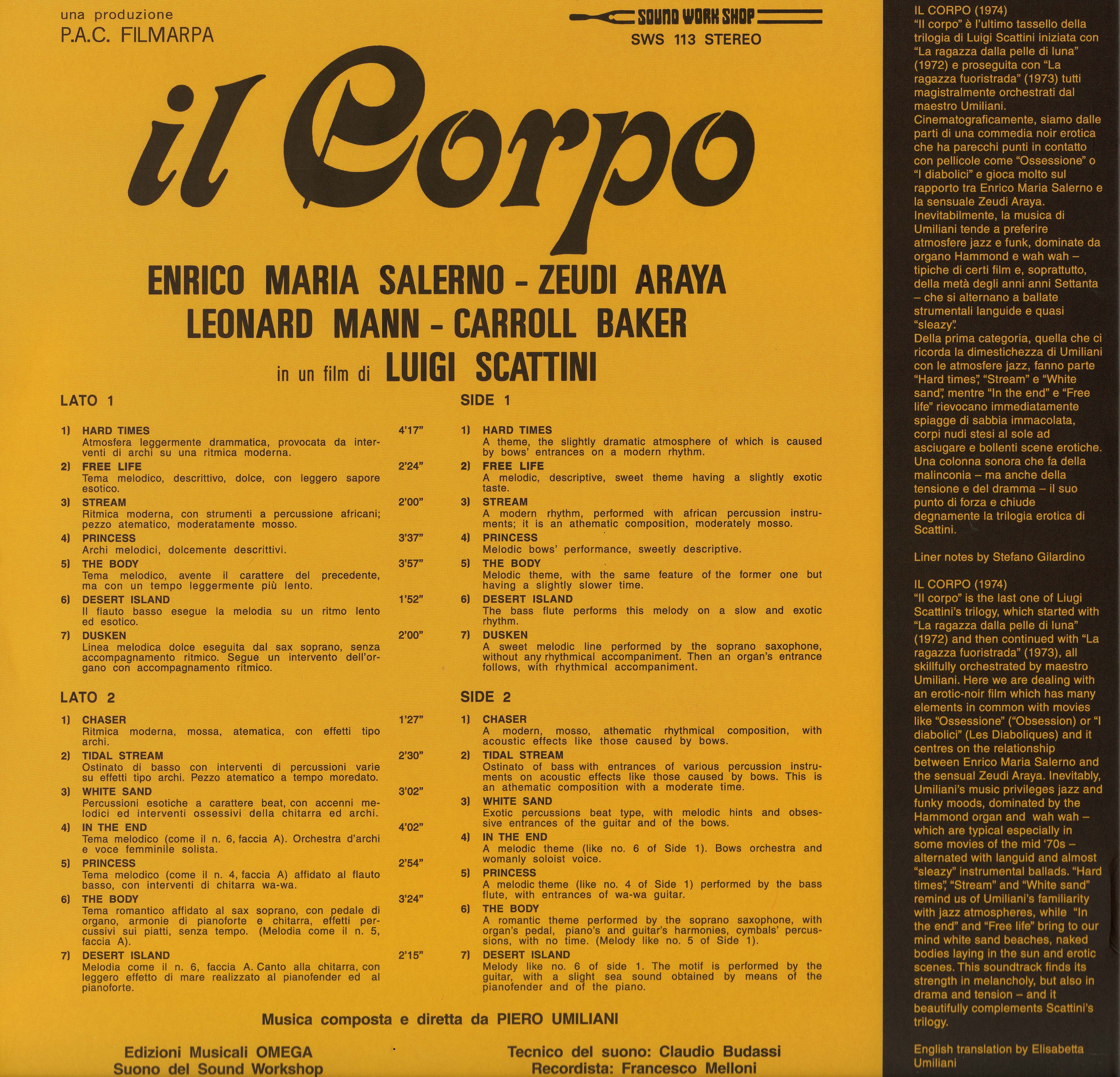 The soundtrack for Il Corpo by Piero Umiliani (“The Body” in English) was originally released in 1974 under the Sound Work Shop record label, and it’s the last chapter of the trilogy of films by Luigi Scattini, started with La ragazza dalla pelle di luna followed by La ragazza fuori strada both masterfully scored by Piero.