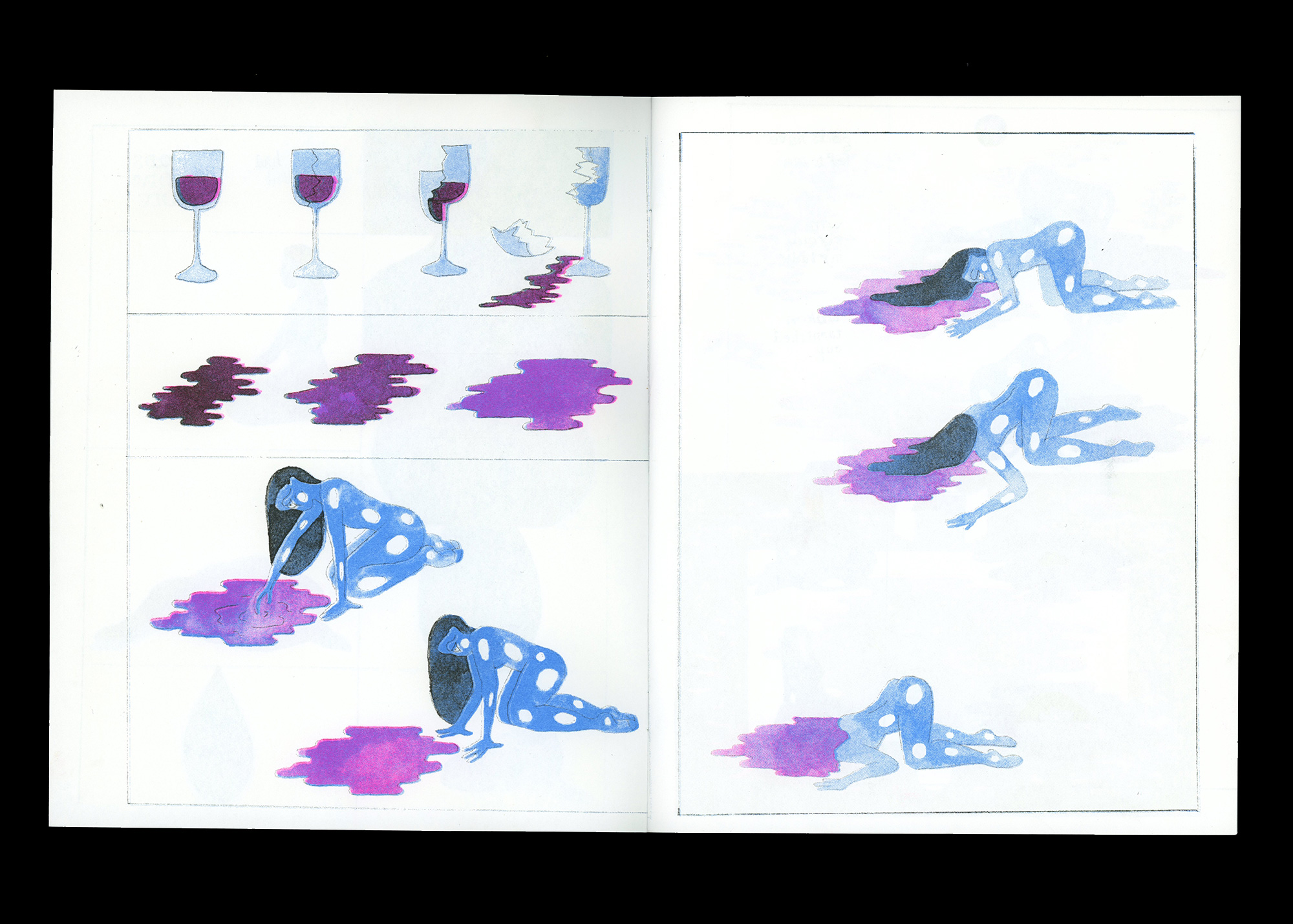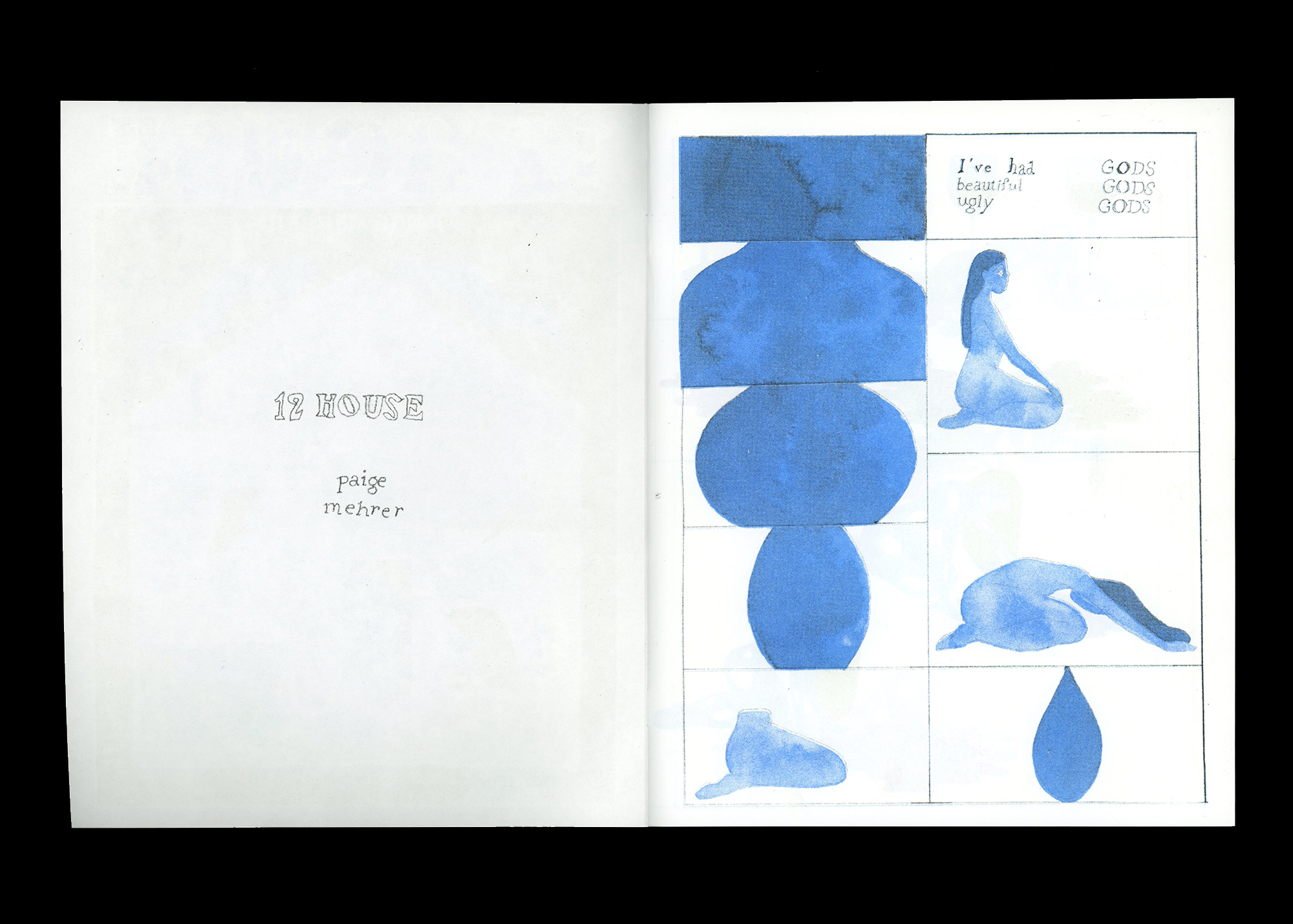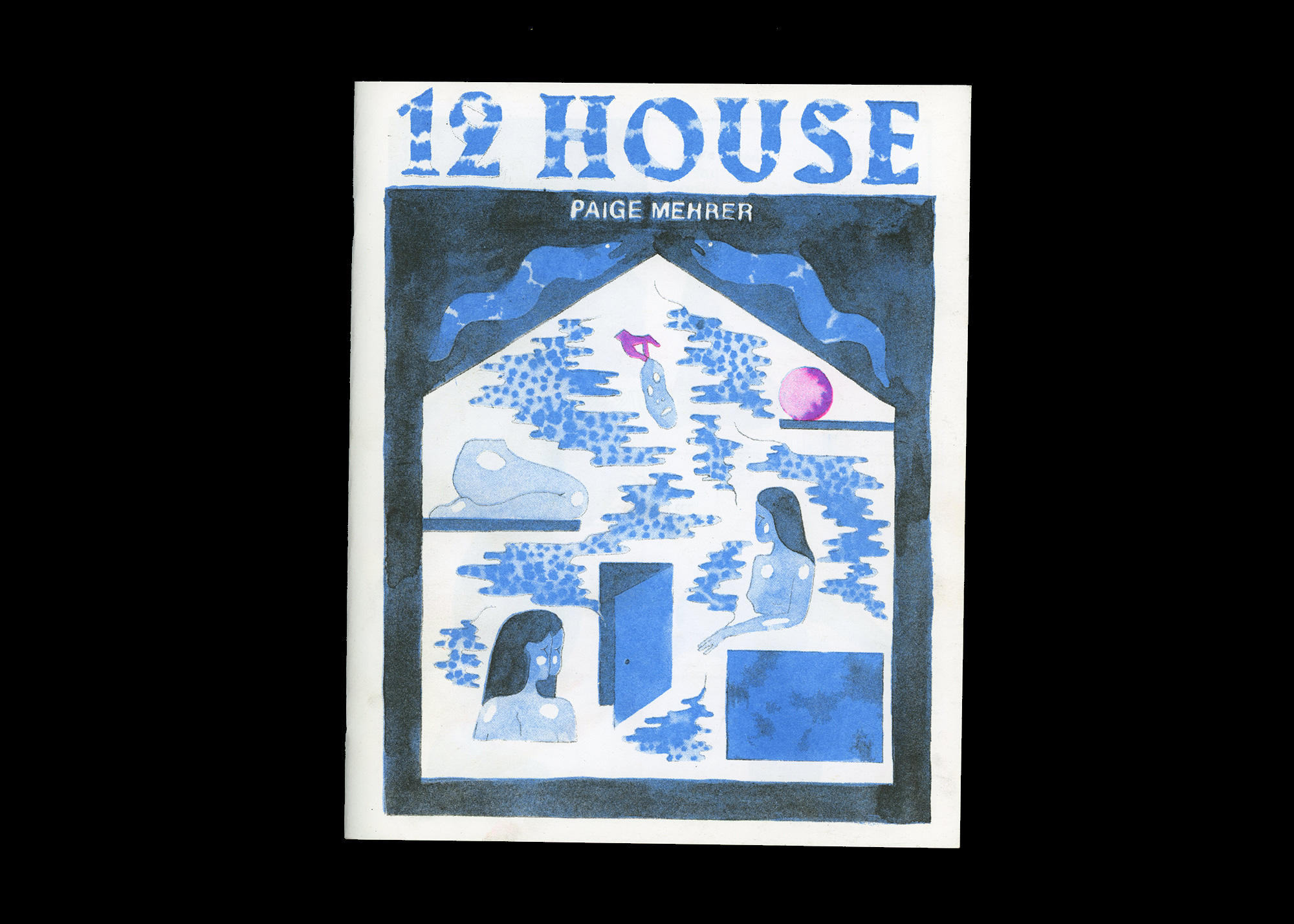 12 House is a risograph-printed narrative zine by Brooklyn-based illustrator Paige Mehrer. Accompanied by expanding and contracting poetry, it follows a woman in subdued blues and glowing purple through a series of actions and encounters with snakes, sea creatures and self.